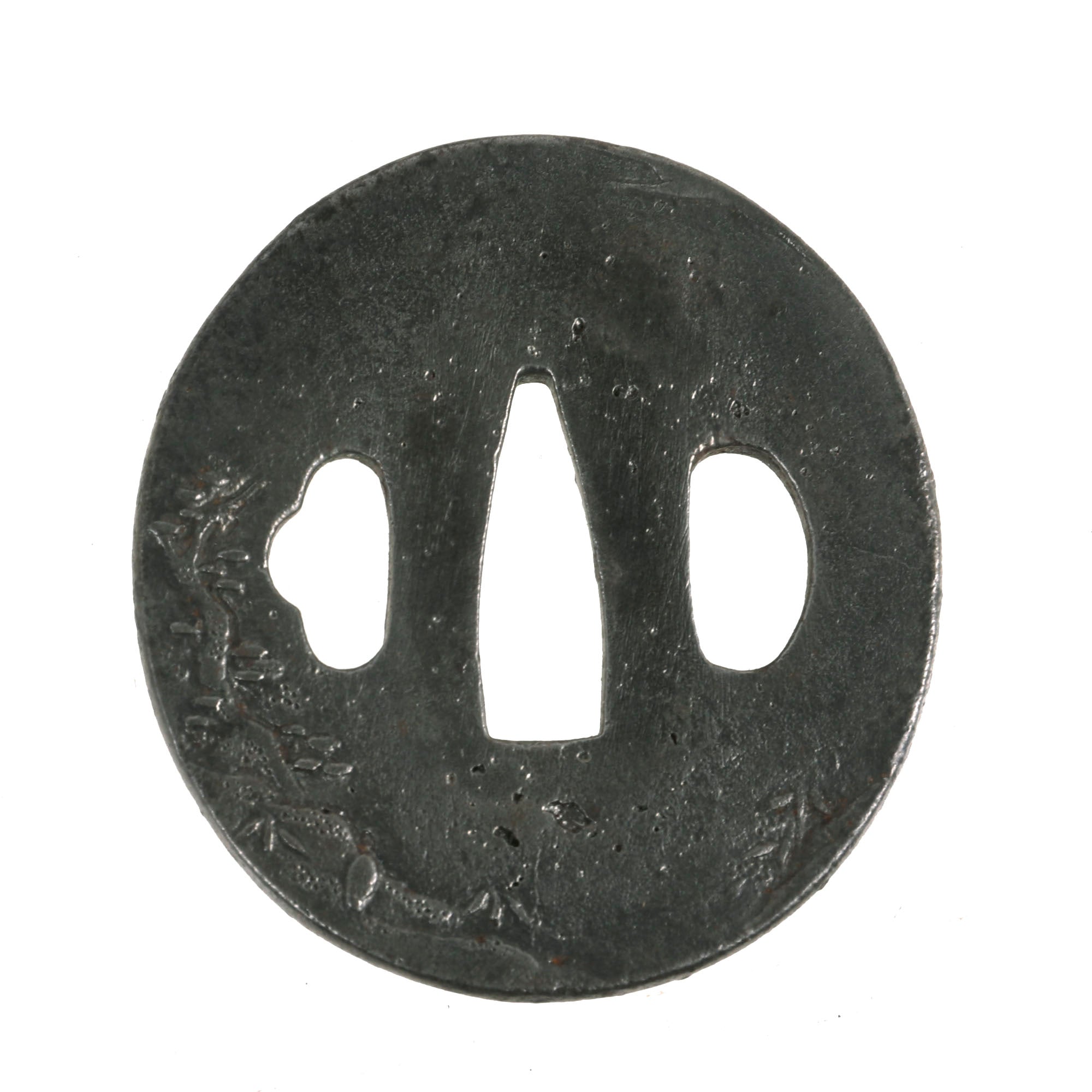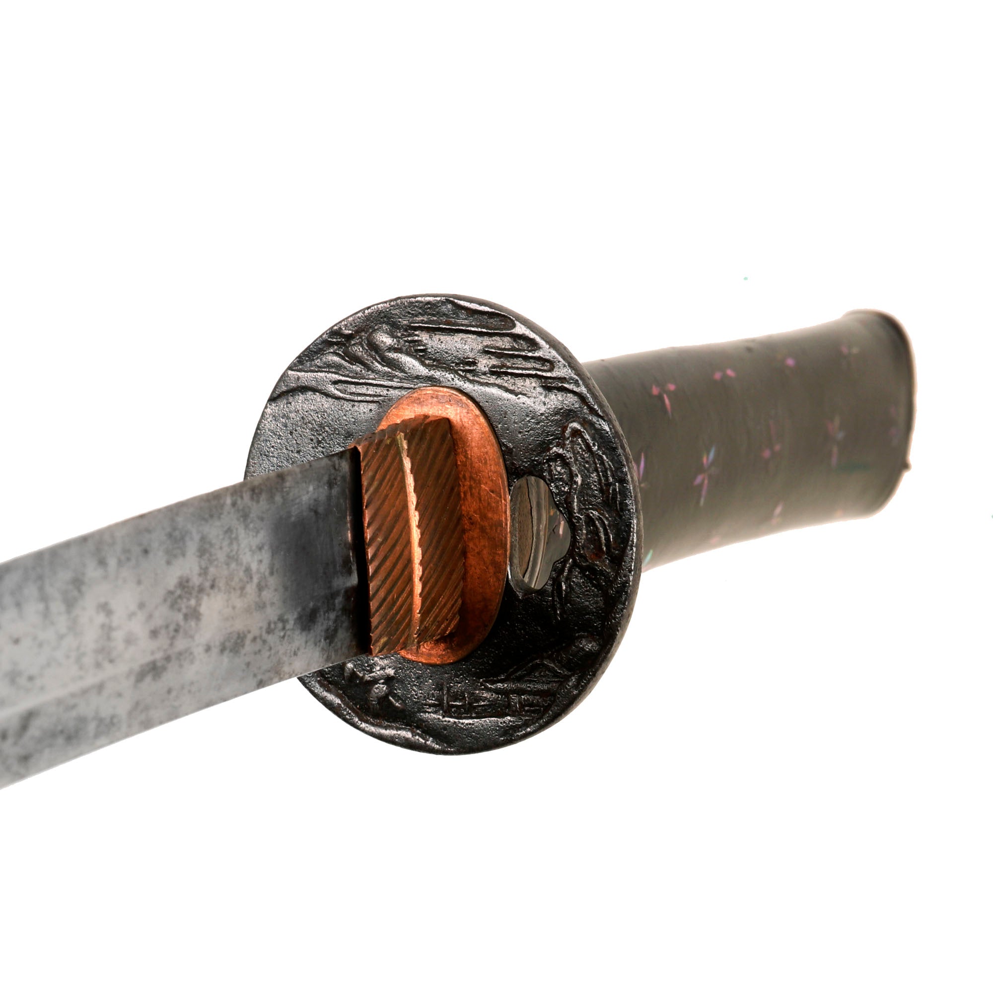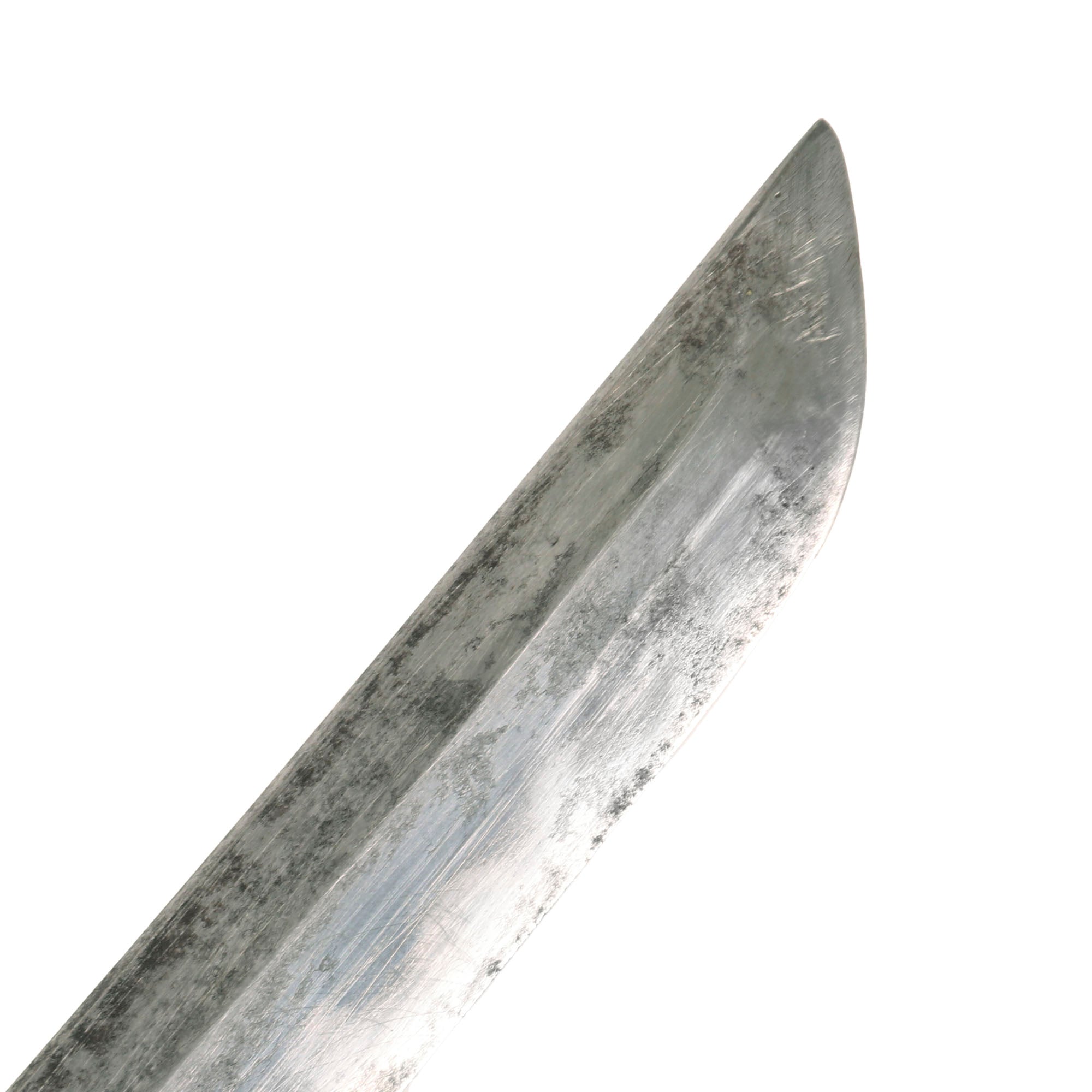 This example has been remounted several times, as was common for Japanese blades. This has made the file marks YASURIME (鑢目 - file marks) on the tang faint, and given it a lovely patina. There is a bit of oxidation, but no major scaling, so it looks like it was probably made during the later Edo period, circa 1800. There is no signature on the blade, so it is considered 無銘 (mumei), or "anonymous". There are many smiths who did not sign all of their blades, and the lack of a signature is no indicator of original quality.