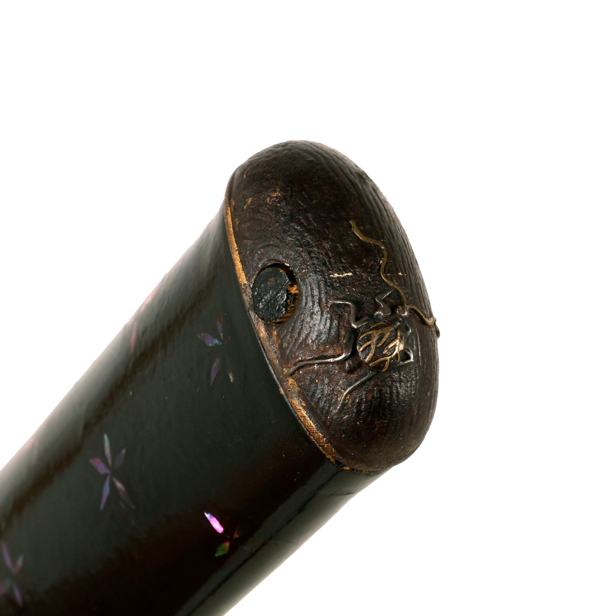 The TSUKA (handle) on this wakizashi is really something else, coated with black urushi lacquer that has inlaid star or flower decorations, made from multiple small pieces of abalone shell. The finish is still in great shape, and the kashira (end cap) looks to be made from copper or brass, and has an embossed beetle on the bottom. The handle is held in place by a replacement peg, and the handle is a bit loose on the tang.