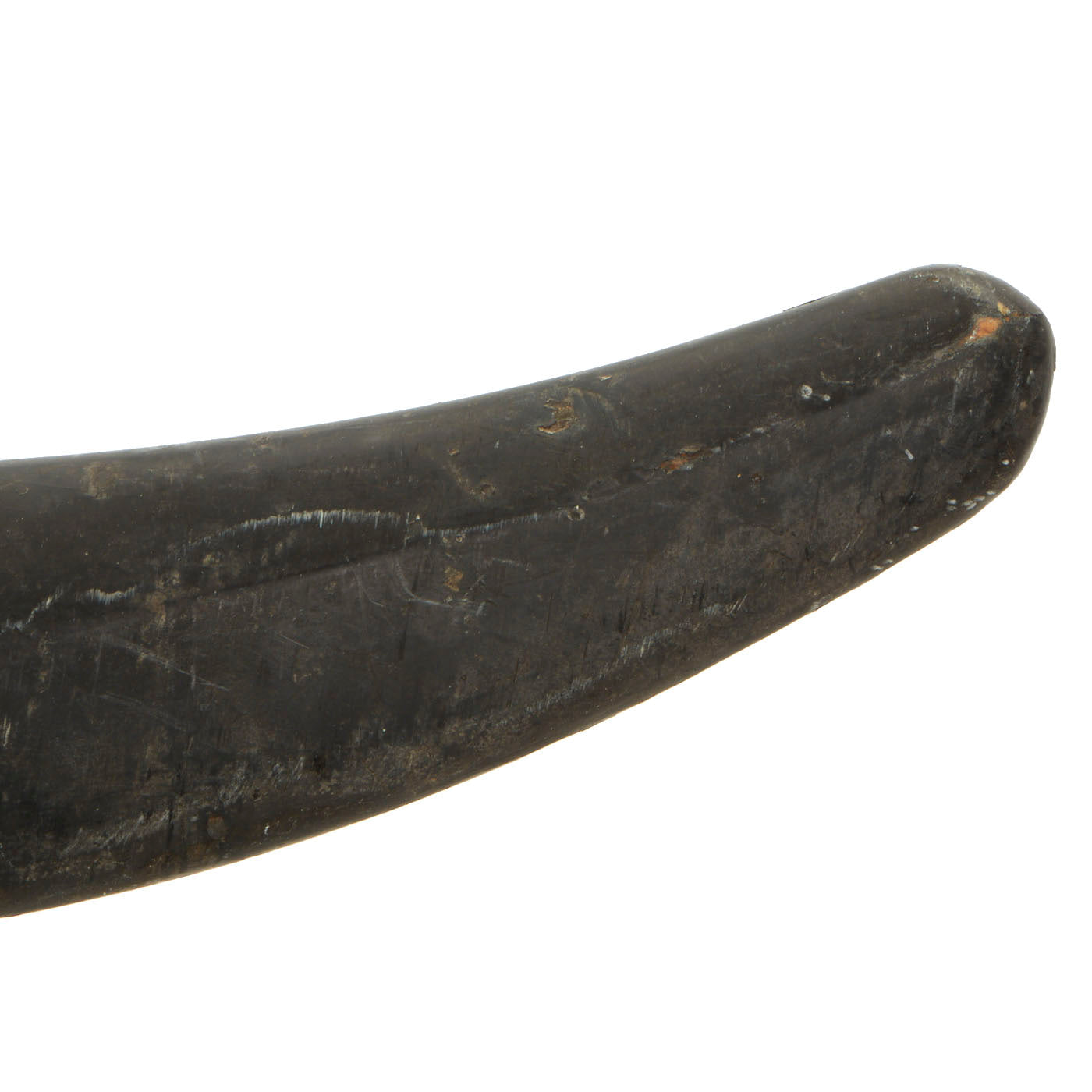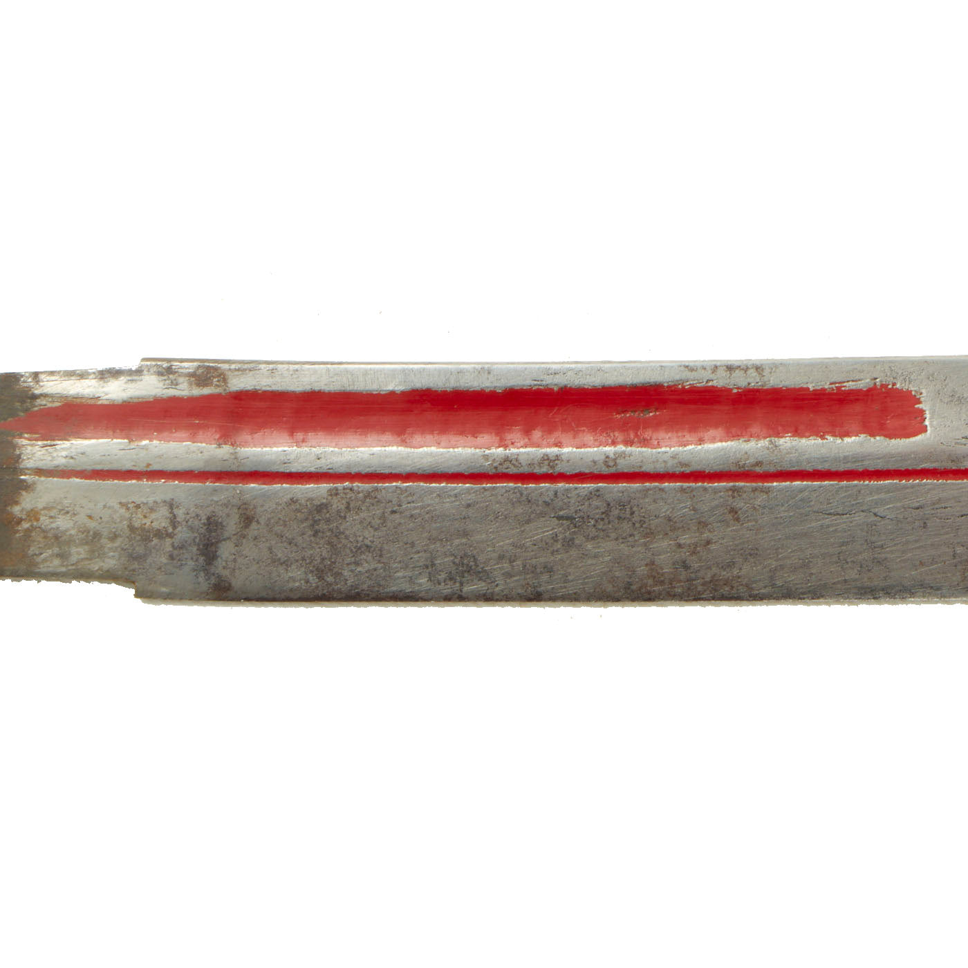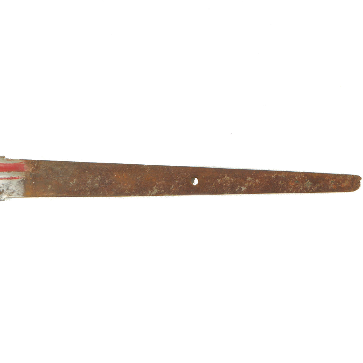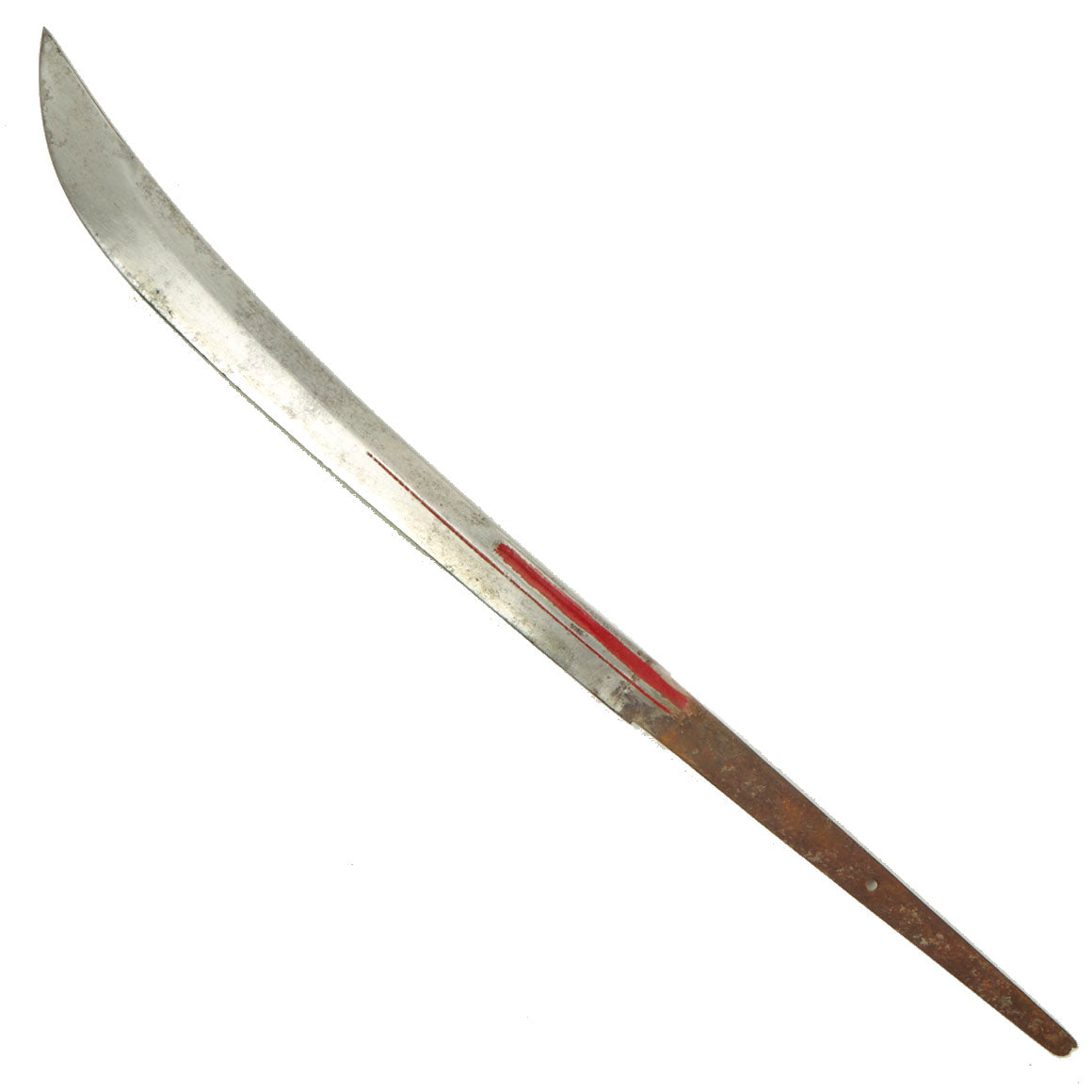 The blade surface has some staining, and removed light pitting, however the edge is still good. It has a bo'hi (fuller), which has been highlighted with red urushi lacquer, a very common embellishment. The tang is of the regular naginata style, with, the very end rusted / broken off due to how thin it is.