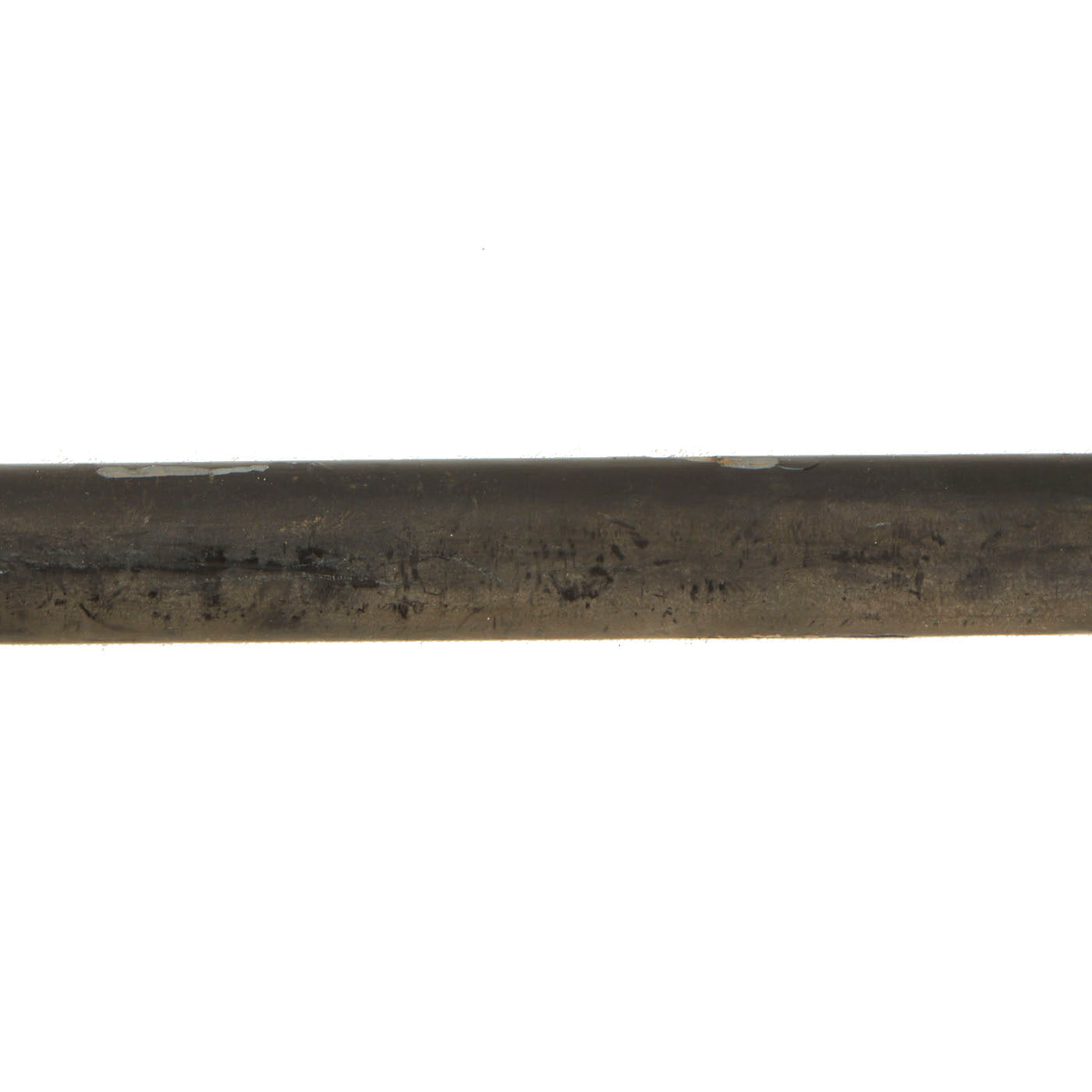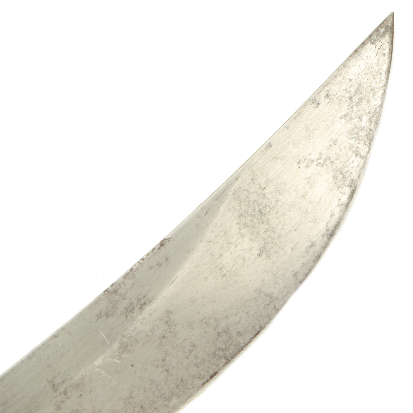 The Blade of this example is 14" long, from the tip (kissaki) to the back notch (mune-machi), and the overall length including the tang is 21 3/4“. The tang is unsigned 無名 (mumei), or "anonymous". The blade has unfortunately saw much use and cleaning since the last polish, so the hamon is not visible. There are however lamination lines and some carbon pits present, which are definitive for a traditionally laminated blade.