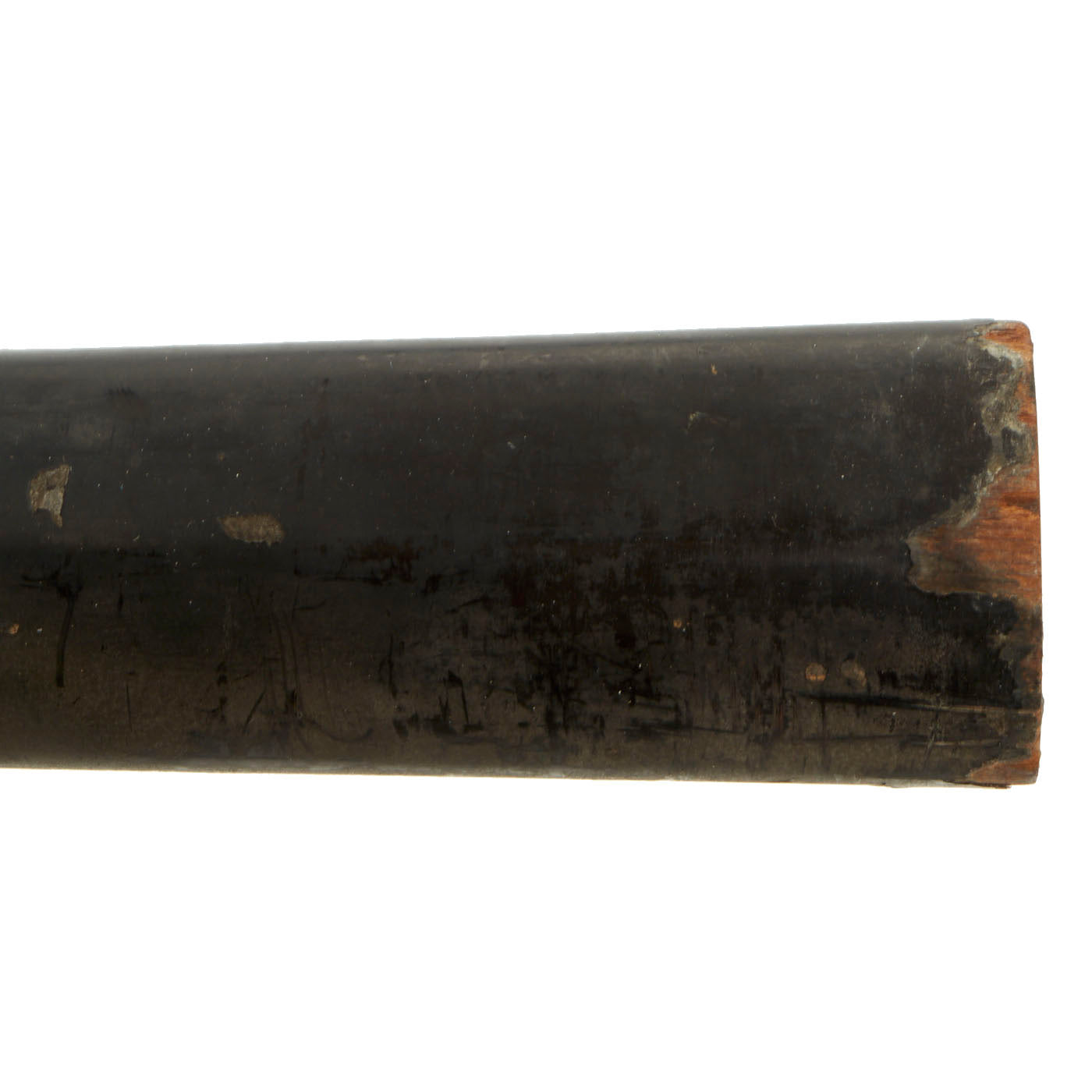 This example dates from the mid Edo period (江戸時代, Edo jidai) or Tokugawa period (徳川時代, Tokugawa jidai) of Japanese history. This is the period between 1603 and 1867, when Japan was under the rule of the Tokugawa shogunate and the country's 300 regional daimyo. The naginata measures 86” in overall length with an 71” long shaft (Ebu), so this example was almost certainly used for castle defense or use in the field against soldiers on horseback. It has a typical design large wooden saya (scabbard).