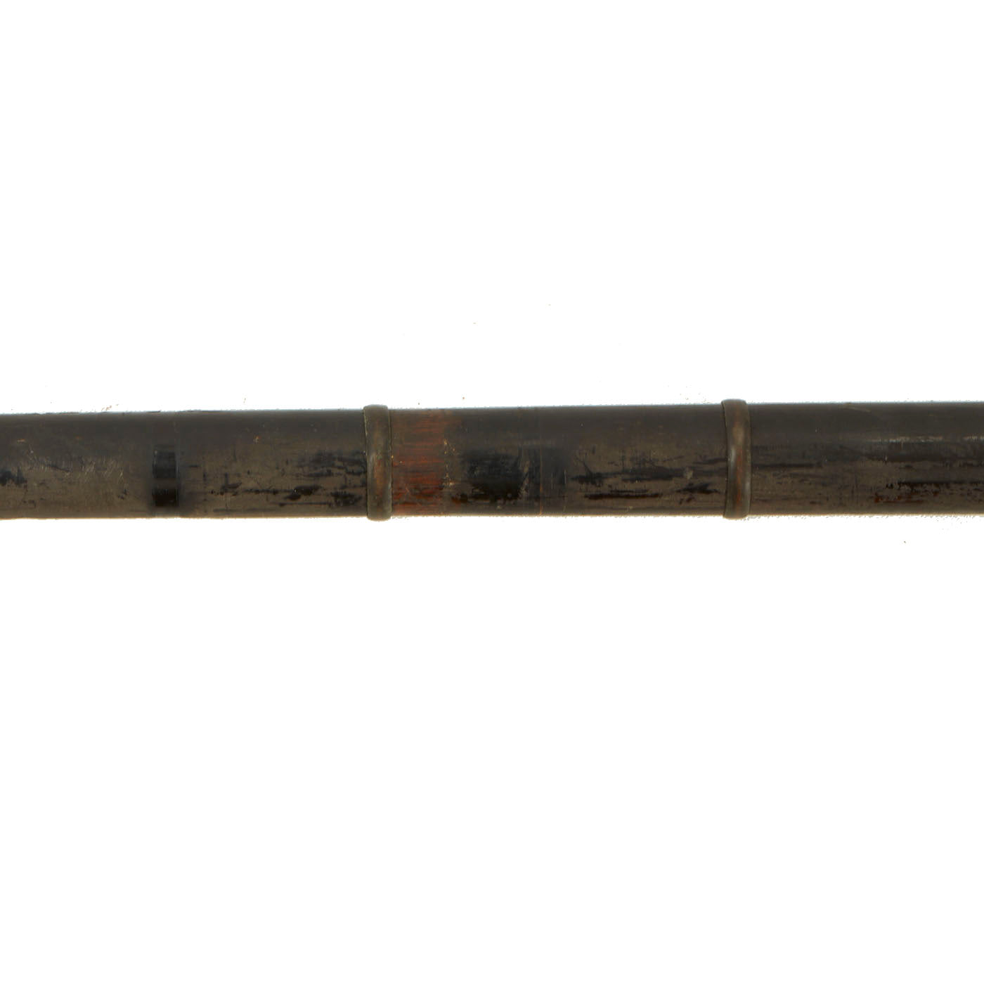 The fittings of the naginata are fairly typical, with a long pole (ebu) that has some semegane (rings) around it to help hold it. It has a fuchi at the end that surrounds the end of the pole, but it has currently slide down against the mekugi-ana, as the pole has shrunk a bit, and the glue has dried out. There is a brass habaki around the end of the blade. The other end of the pole arm is rounded on the bottom without an end fitting, so it may have been longer at one time. There is a single pin (mekugi), though it is definitely a replacement.