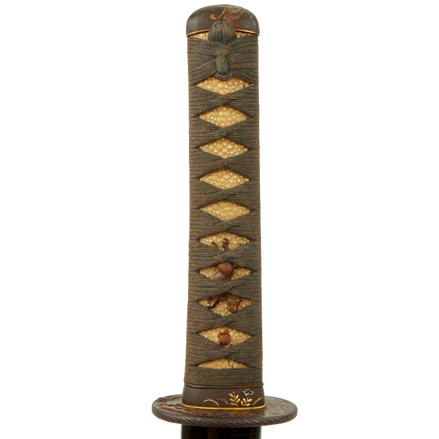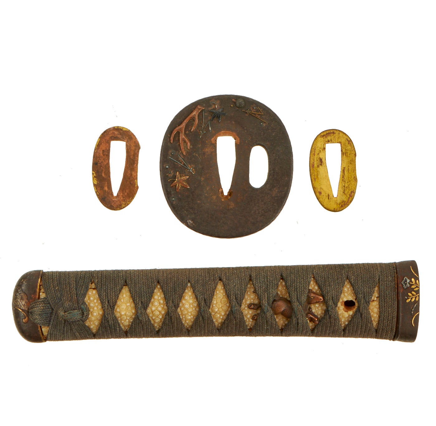 The tsuba (cross guard) is made of iron and is of the Maru Gata (round) shape, inlaid with some embossed brass designs. There is a Kozuka Hitsu-ana for a Kogatana knife on one side, and there are two seppa (spacers) around the tsuba. The fuchi (collar) for the tsuka (handle) is iron, as is the Kashira (End Cap), and both have some brass inlaid designs. There are two bronze horse menuki present. The stingray (Sa-Me) grip with complete Ito (cloth binding) shows light wear, but is still in good condition.