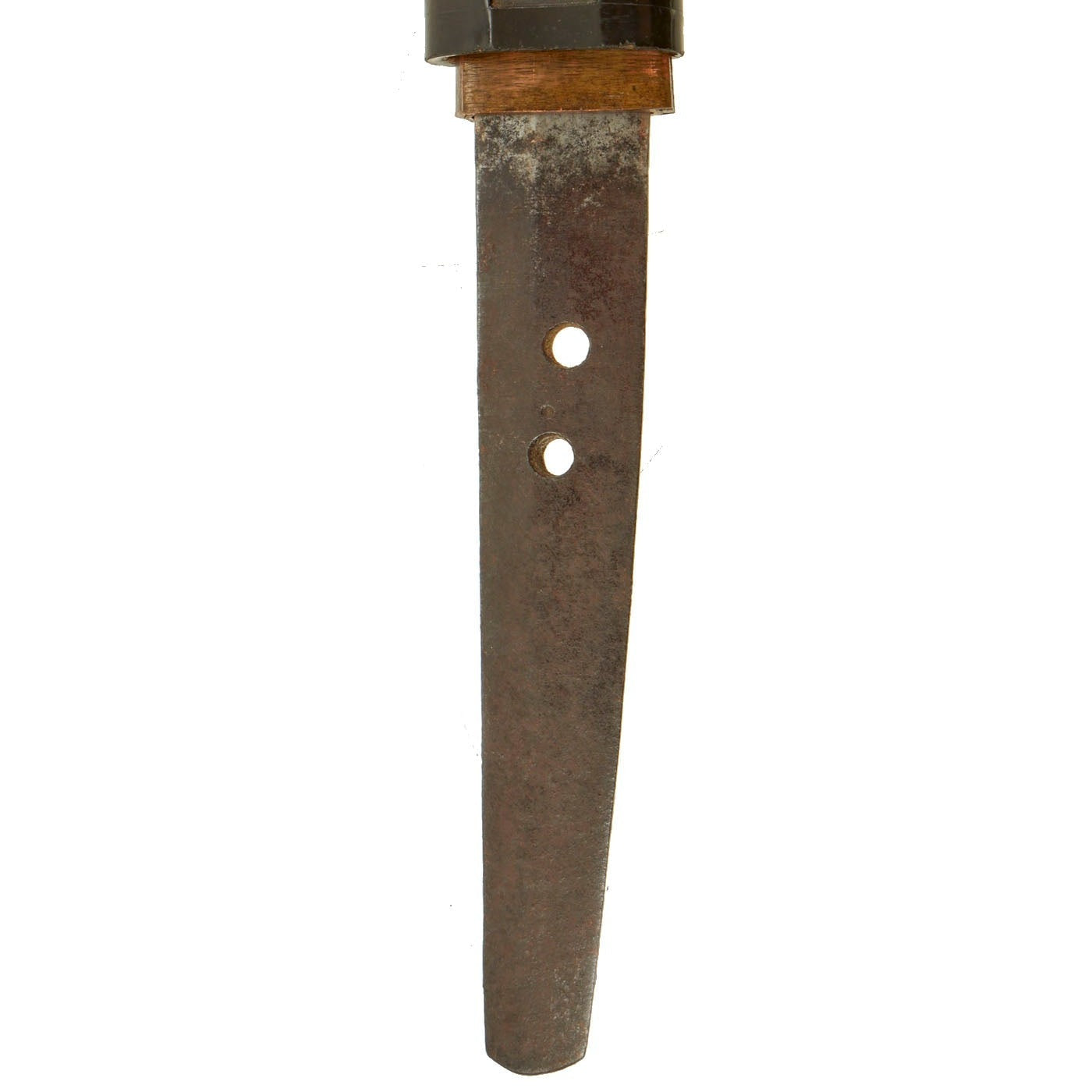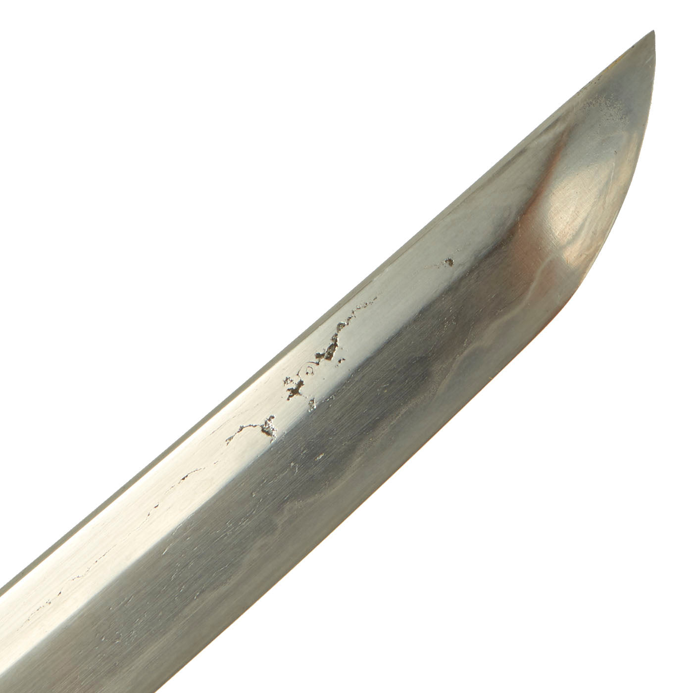 - Blade wounds (kizu) or lamination artifacts are present on the blade. Both ware (lamination lines) and fukure (carbon pits) are visible.