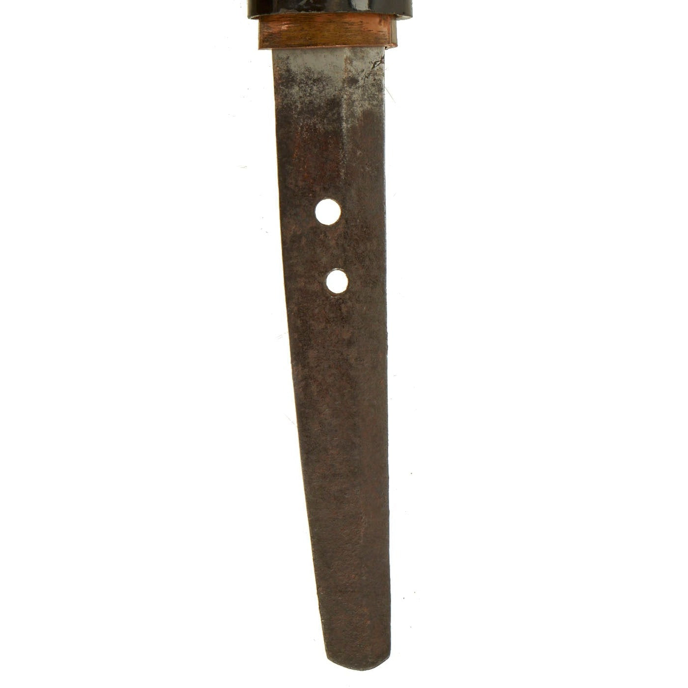 This example has most likely been remounted several times, as was common for Japanese blades. This has made the file marks (yasurime) on the tang faint, and given it a lovely patina. There are two holes (mekugi-ana) in the tang, so the cutting edge may have been somewhat longer previously. As there is no maker name on the tang, this blade is considered 無名 (mumei), or "anonymous".