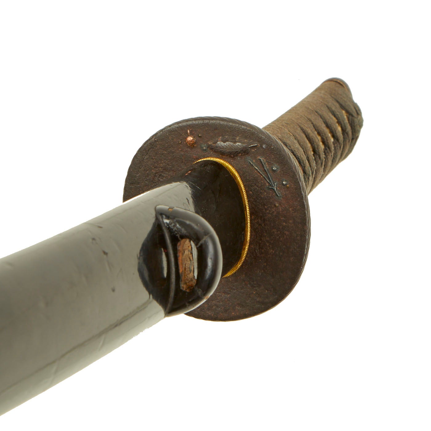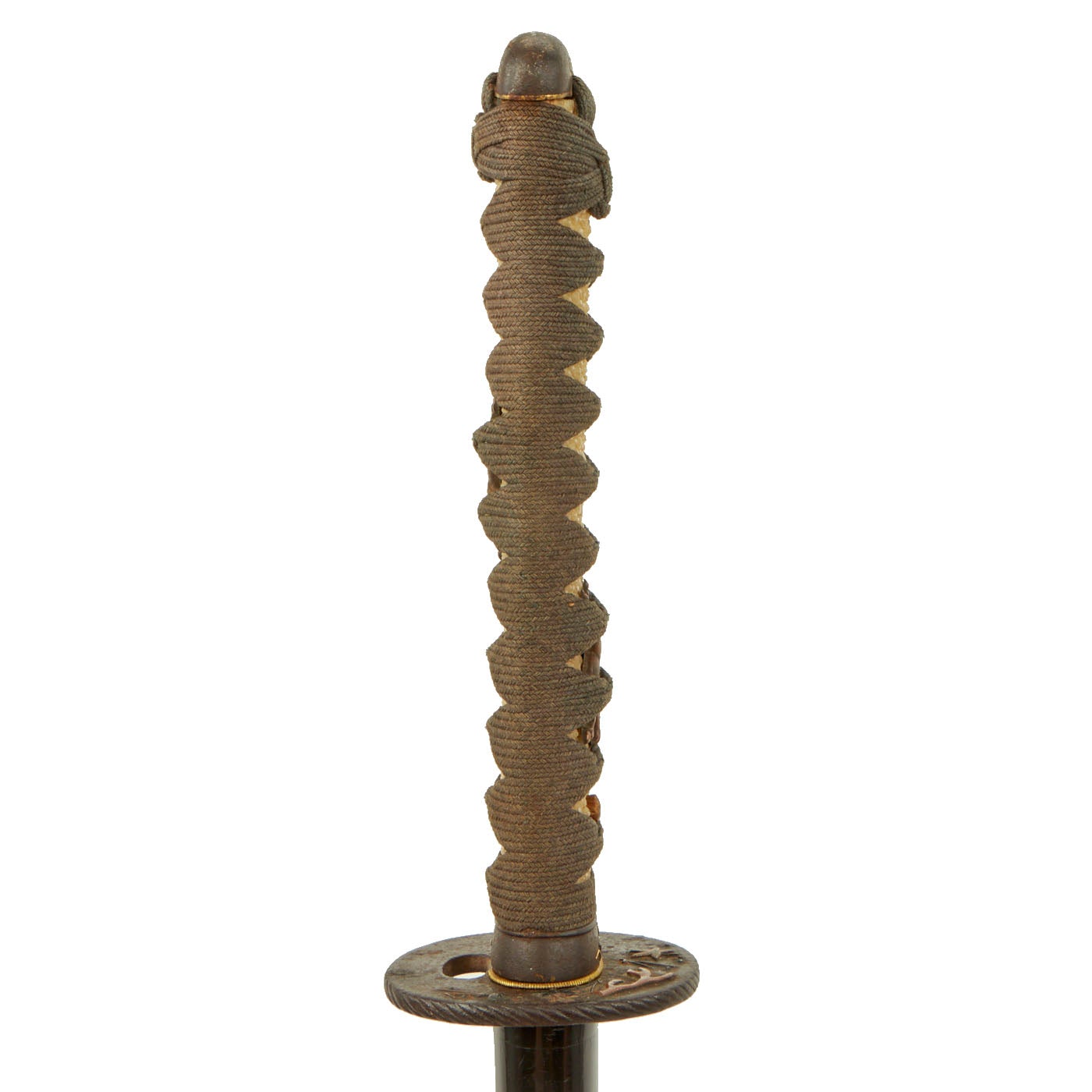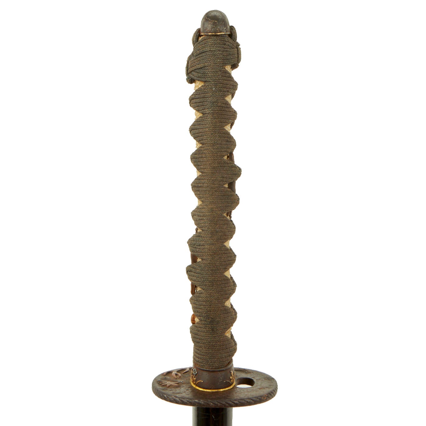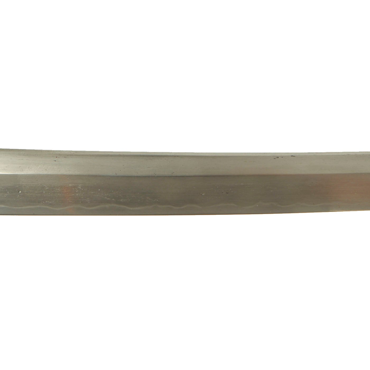 The blade of this example is 21 3/8 inches long, and the polish on the blade is fair, overall showing cleaning and use since the last time it was fully polished. Overall length of this wakizashi is 29 1/2 inches. The hamon (temper line) is still visible, and is of the NOTARE (wave) type, with a lot of activity. Nie Crystals are visible, and there is Nioi cloudiness visible with lamination lines. The tang (nakago) is of the futsu 普通 (regular) style, with a Kuri-Jiri (symmetrical rounded) nakago-jiri.