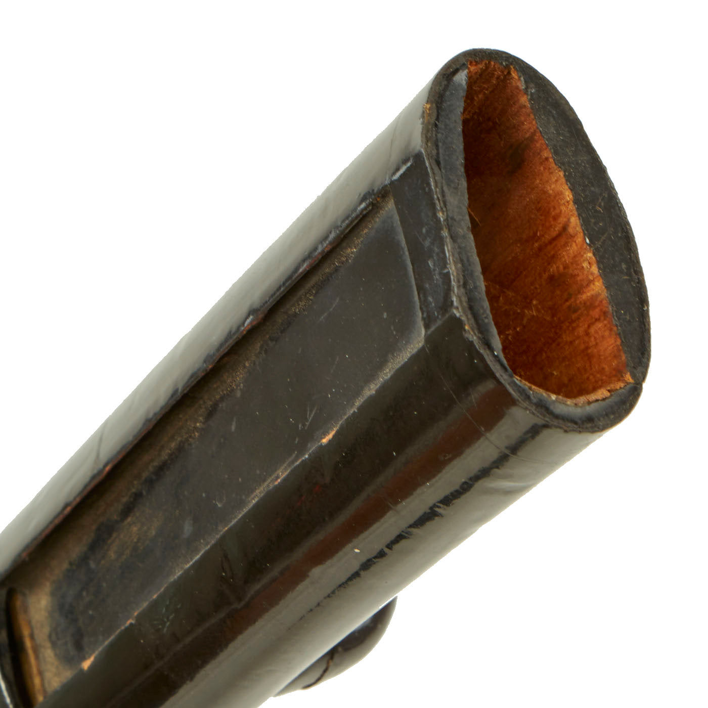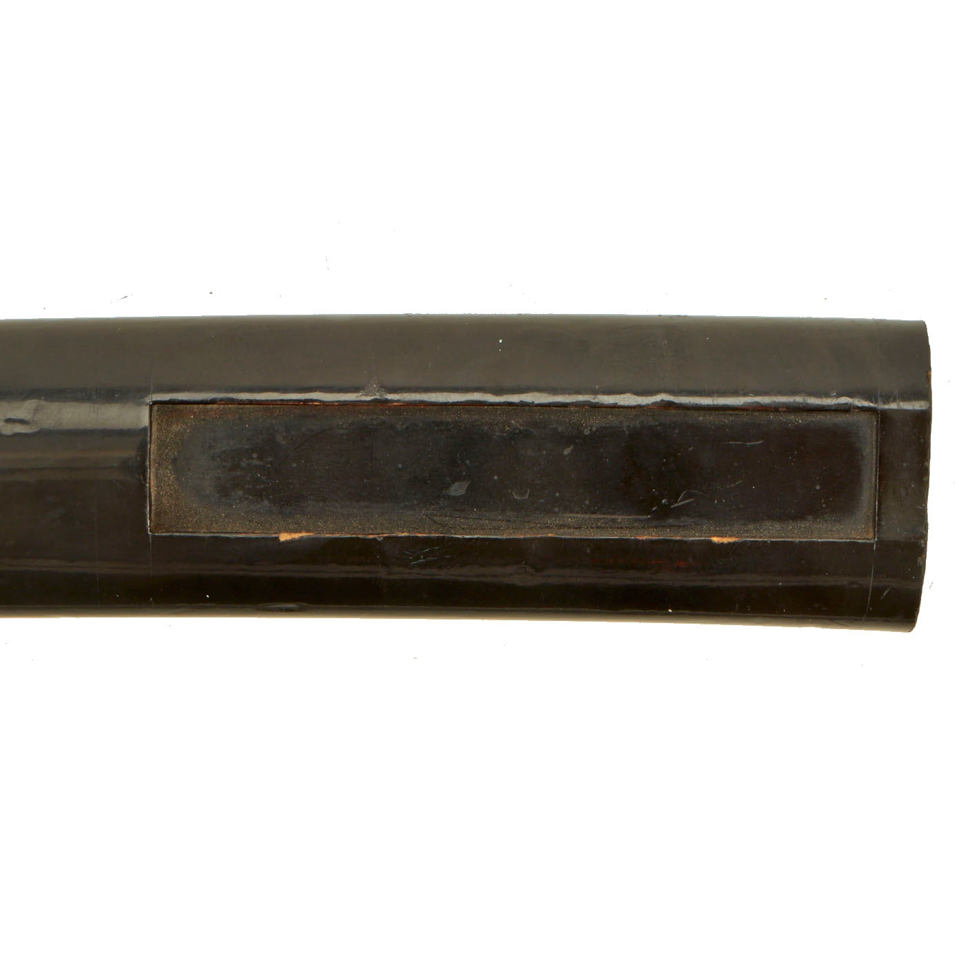 The sword comes in a a well fitting gloss black lacquer wooden scabbard (saya), which has a cutout for a kogatana knife, which is unfortunately absent. The scabbard is in very good condition, with very little missing finish, and no splitting along the seams. It has a kurikata (knob) where the sageo (sword cord) would be attached, which shows past repairs.