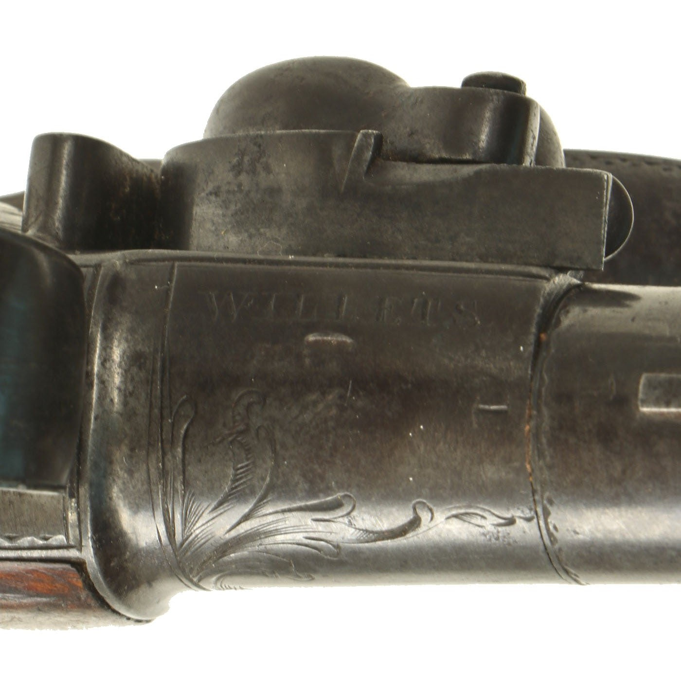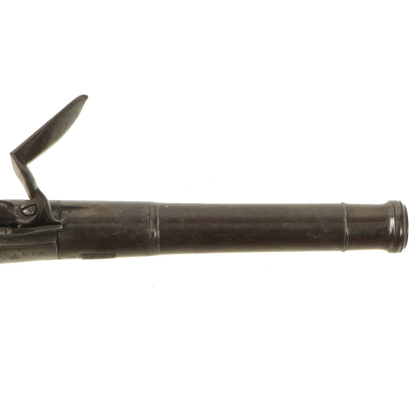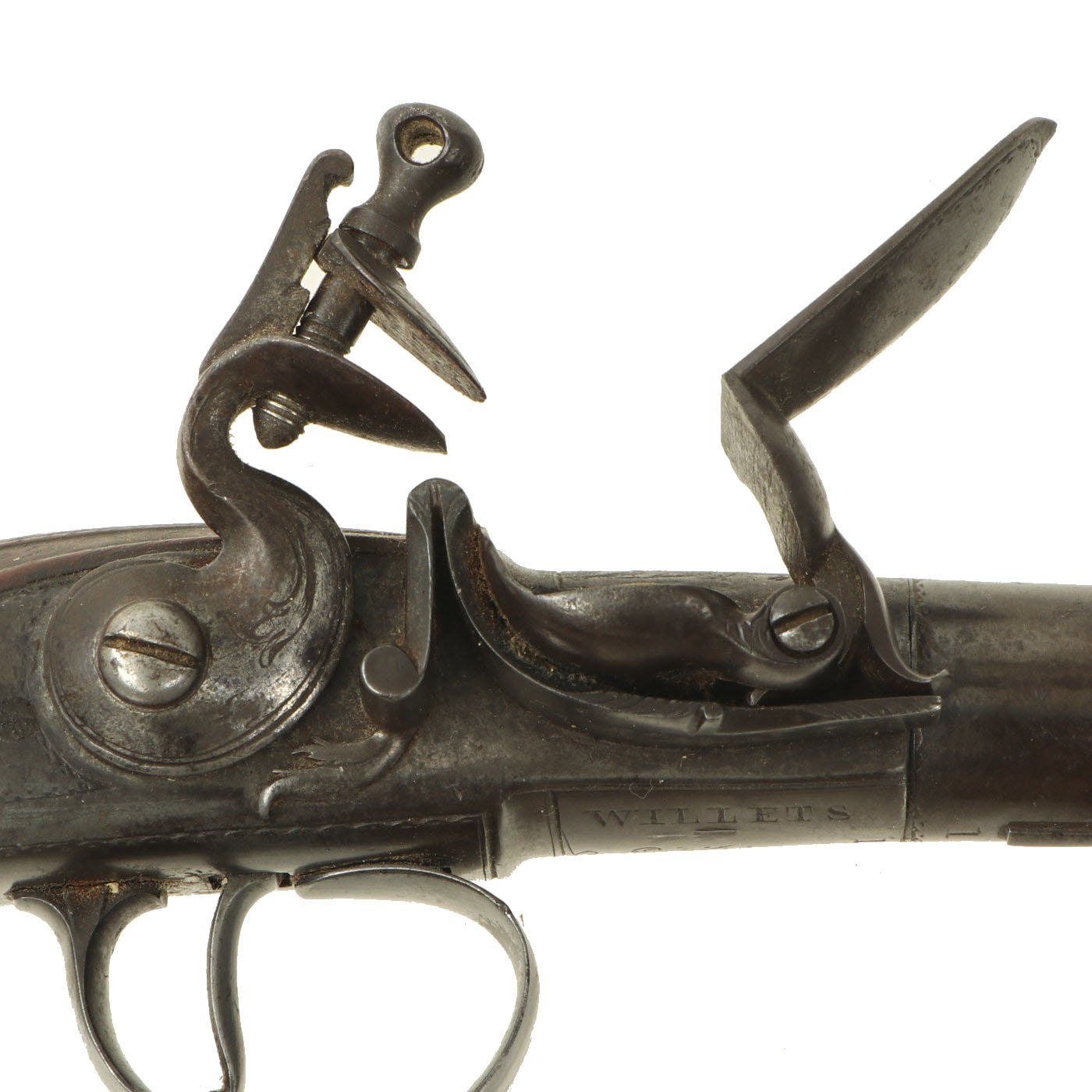 Original Item: Only one available. This is very rare "Queen Anne" style flintlock pistol, made by Jon Willets in the mid-late 18th century. Originally from Wednesbury, Willets operated shops in London and Birmingham between 1744-1789. He is listed as a maker of Flintlock Holster Pistols and Sporting Guns.