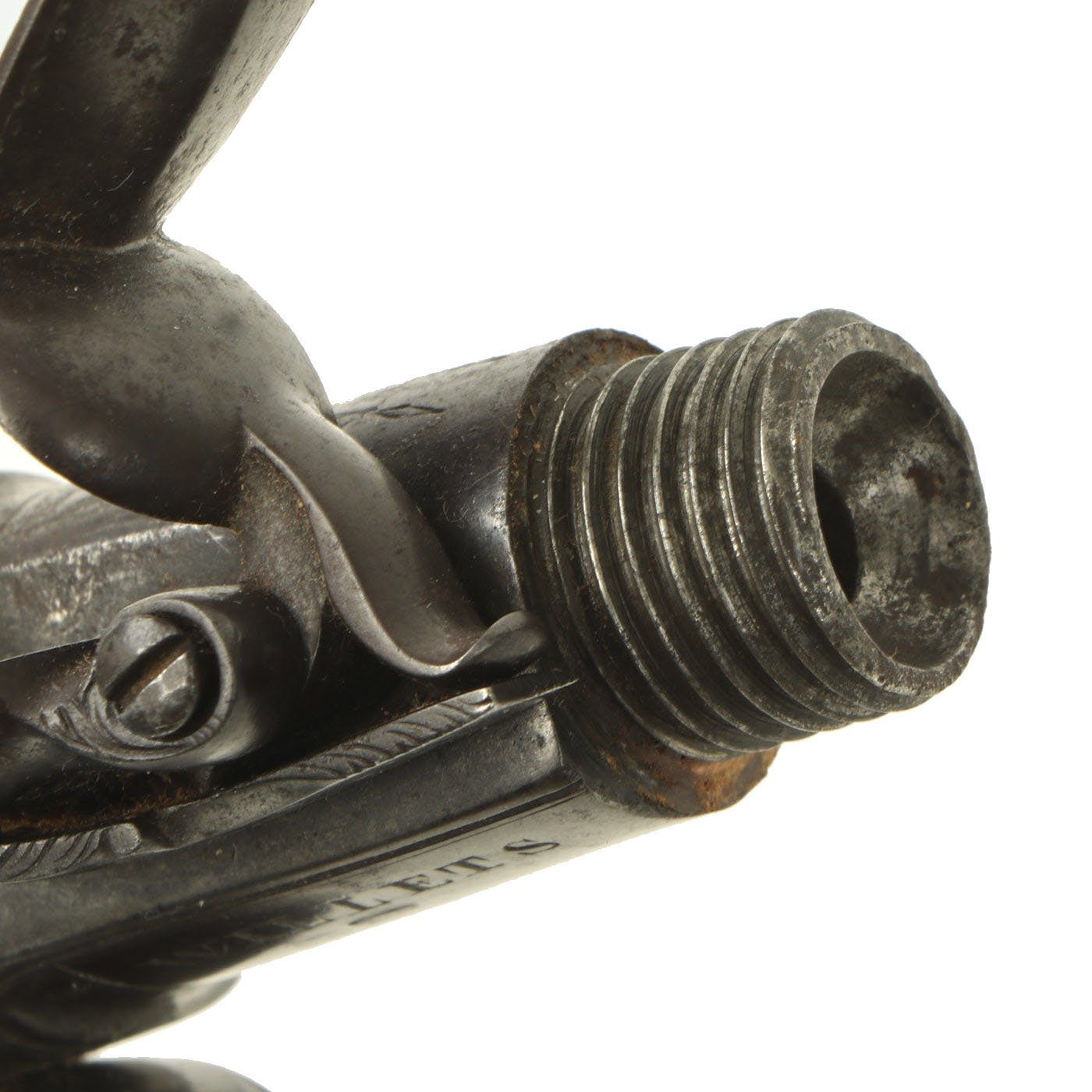 The iron lock plate is somewhat decorated with engraving, and the bottom of the barrel is marked WILLETS just before the screw joint. The pistol measures 12 inches in overall length, with a 5 1/4 inch screw off cannon barrel, in the typical "Queen Anne" style. The pistol has an iron trigger guard, and there is no provision for a ramrod, not needed with the removable barrel.