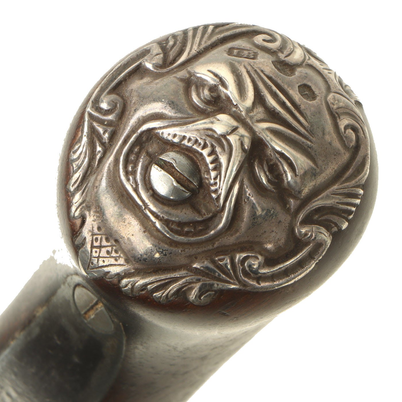 The pistol is mostly iron and steel back to the trigger guard, after which it is fitted with a nice walnut stock. There is a lovely silver escutcheon on the back of the grip, and the bottom of the grip has a Hallmarked silver grotesque masked butt cap.