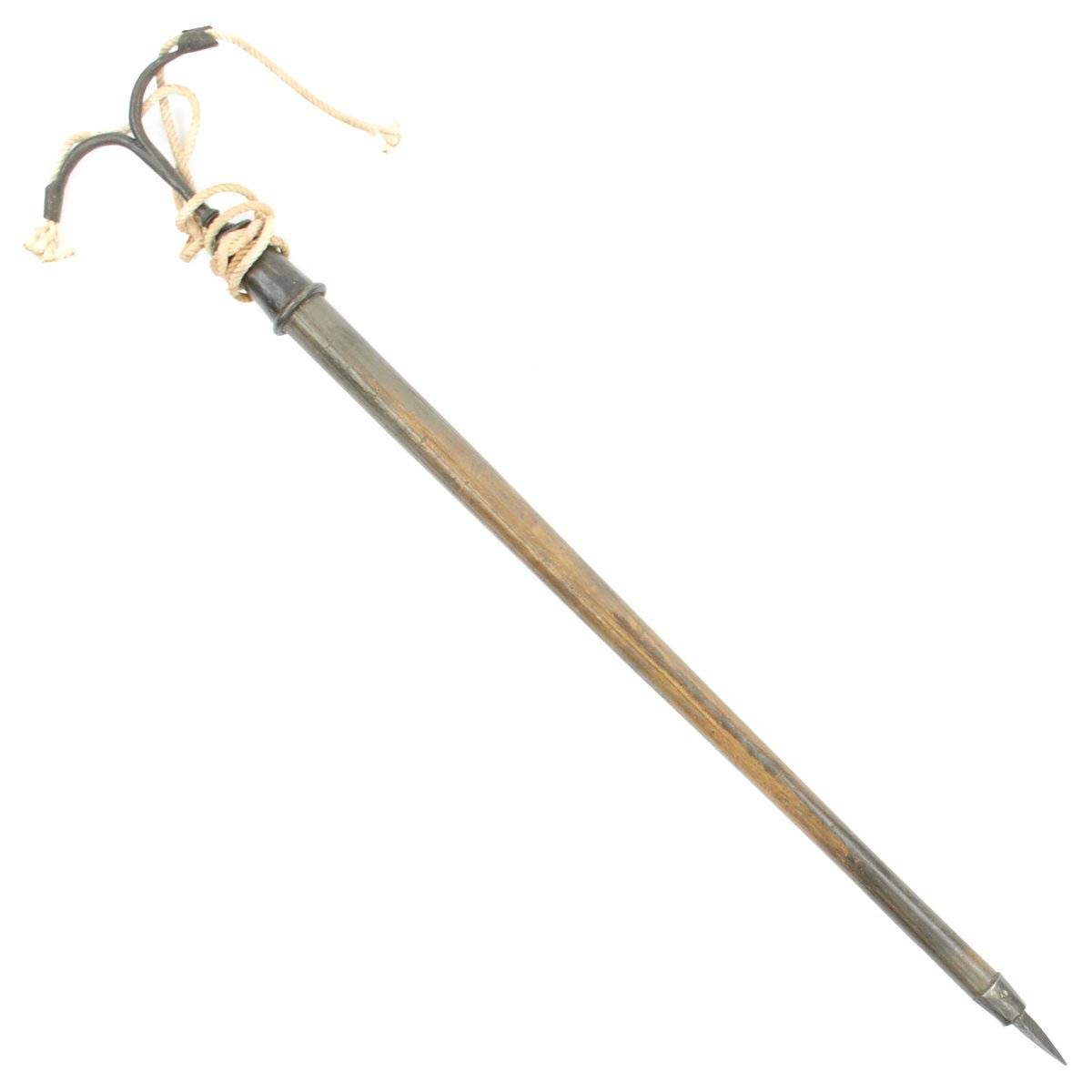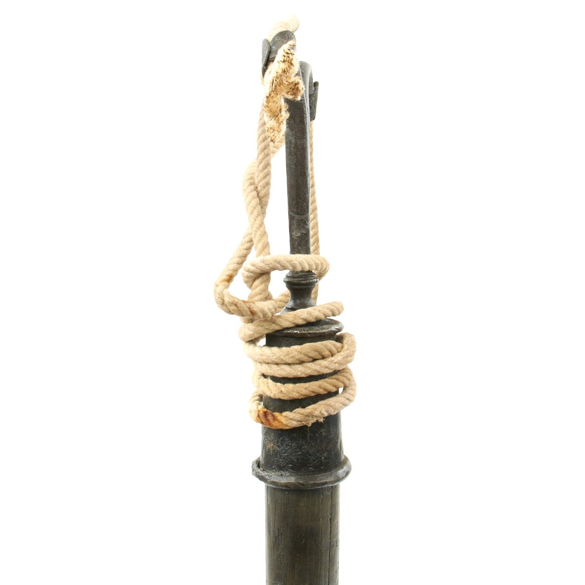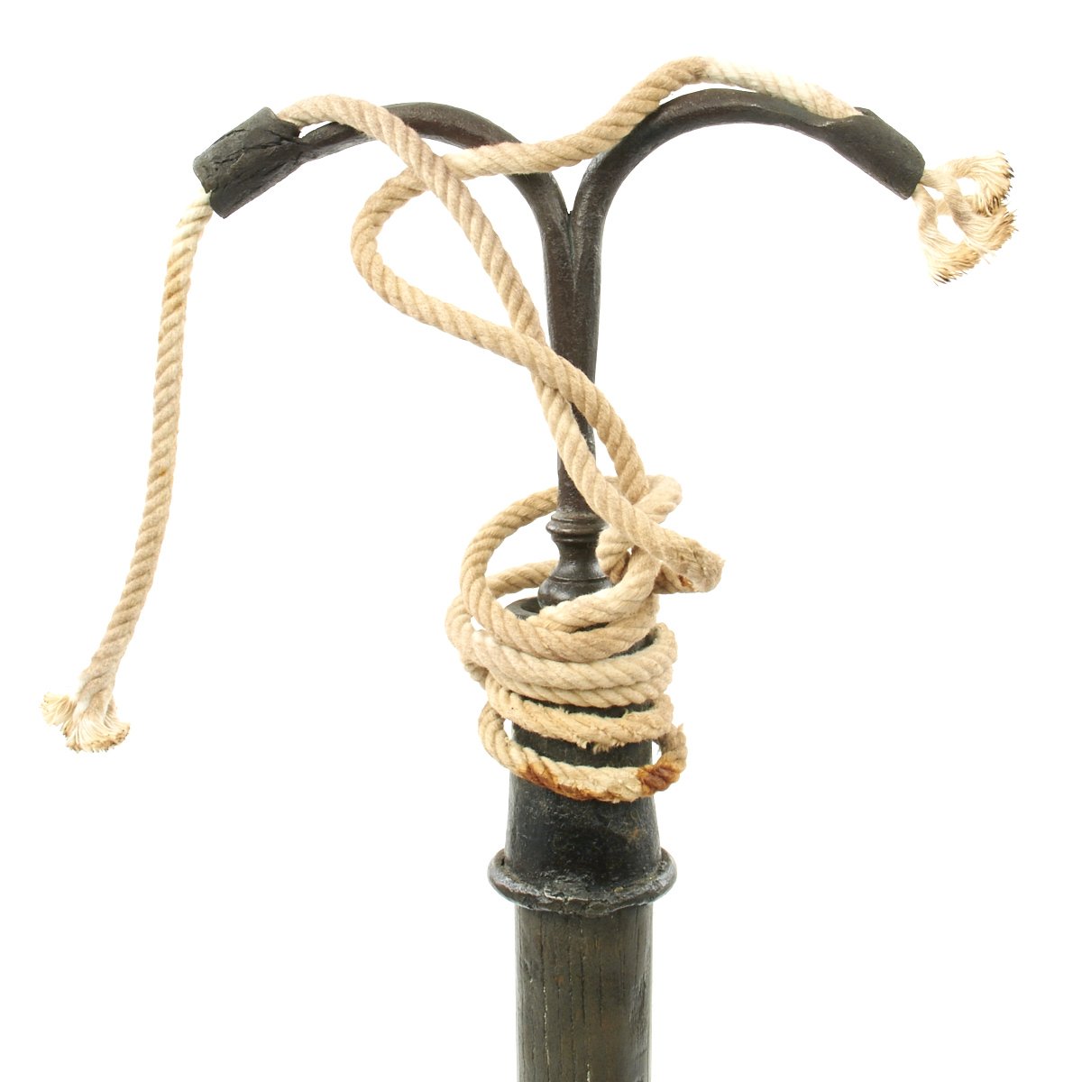 This example, which we believe dates to around 1700-1720, consists of a 31" stout wood haft with a steel spike on the bottom, used to stick the Linstock into the ground. It has a top mount of two arched fuse holders, which were traditionally charged with coils of slow burning cord. Ours includes modern cord as demonstration. The hand forged Linstock head was kept burning for hours while stuck in the ground in close proximity to the artillery. With a continual fire source there was no concern to "strike a match" so to speak when action was needed.