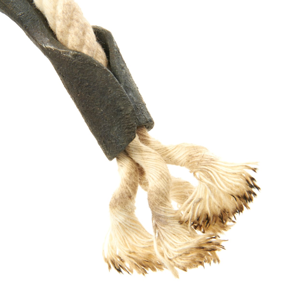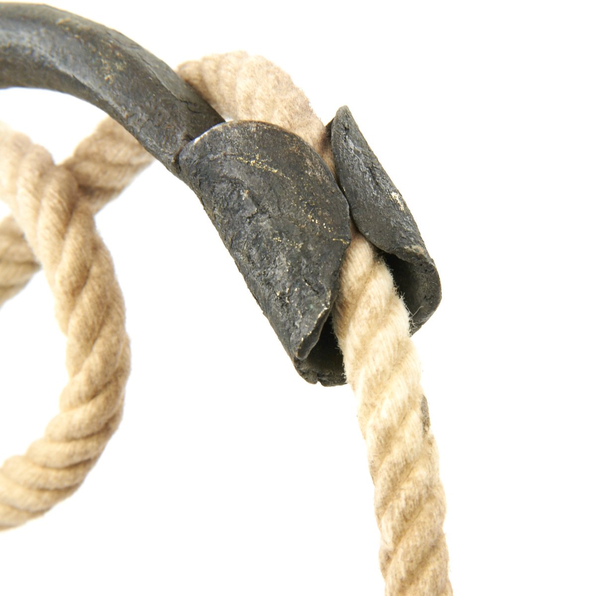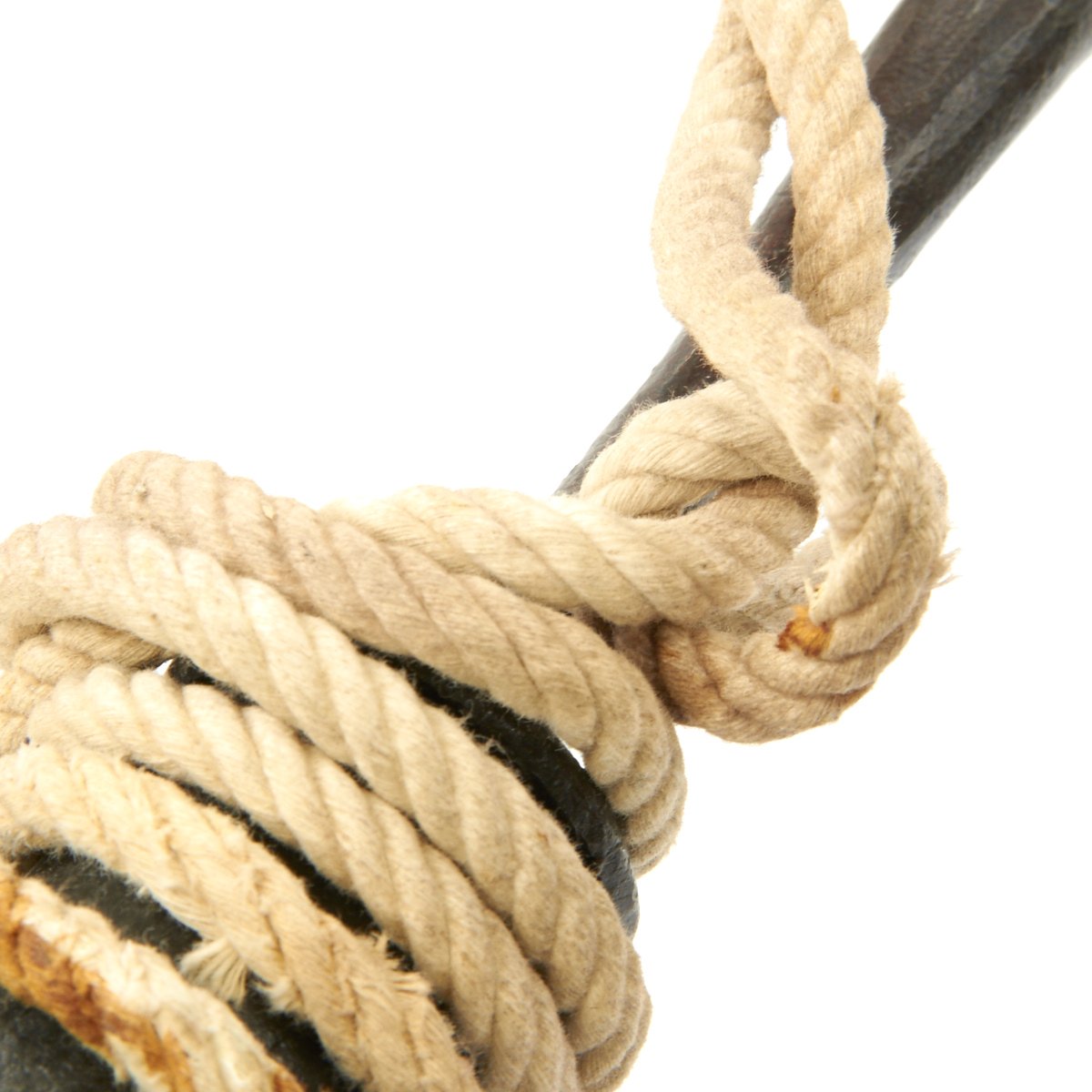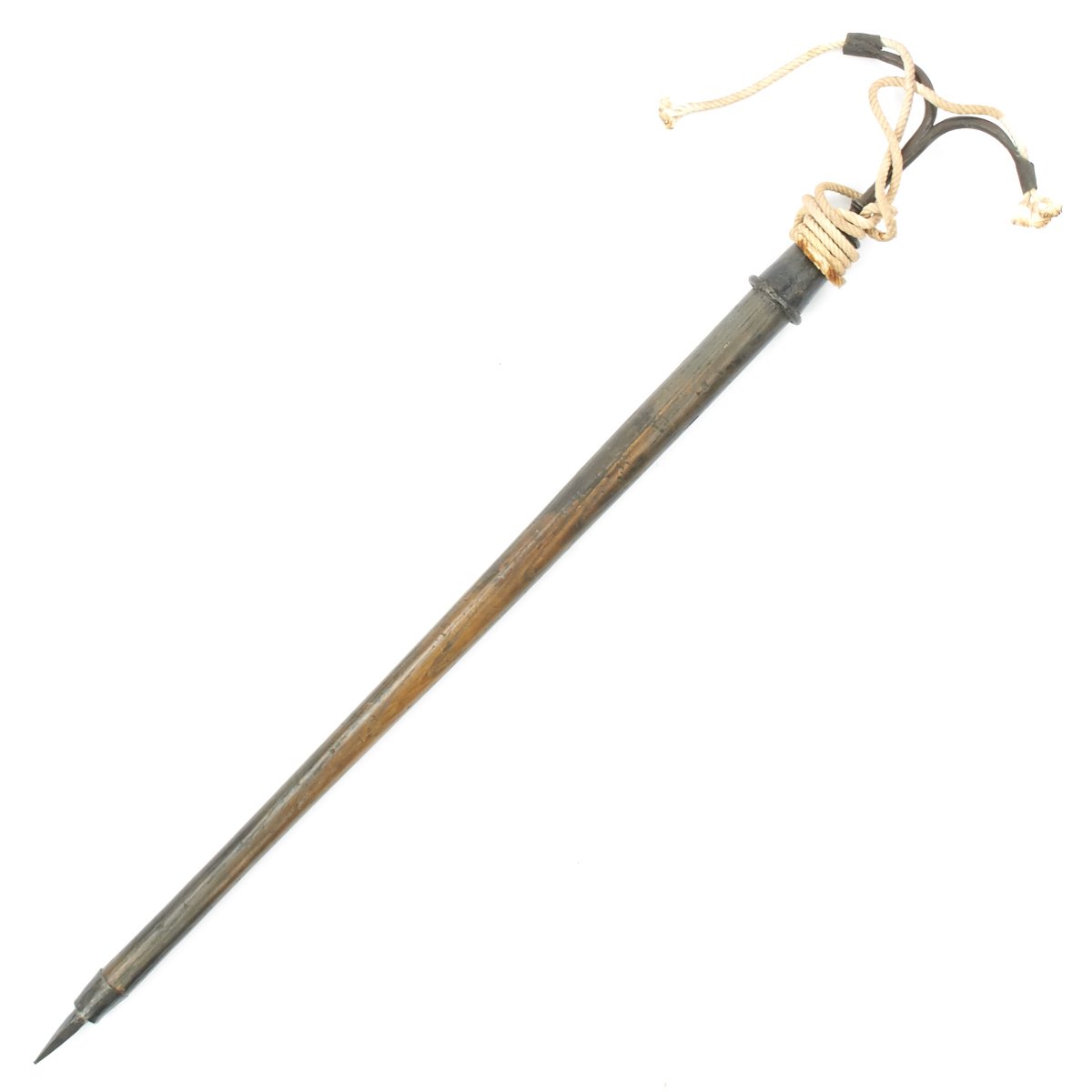 This example, which we believe dates to around 1700-1720, consists of a 31" stout wood haft with a steel spike on the bottom, used to stick the Linstock into the ground. It has a top mount of two arched fuse holders, which were traditionally charged with coils of slow burning cord. Ours includes modern cord as demonstration. The hand forged Linstock head was kept burning for hours while stuck in the ground in close proximity to the artillery. With a continual fire source there was no concern to "strike a match" so to speak when action was needed.