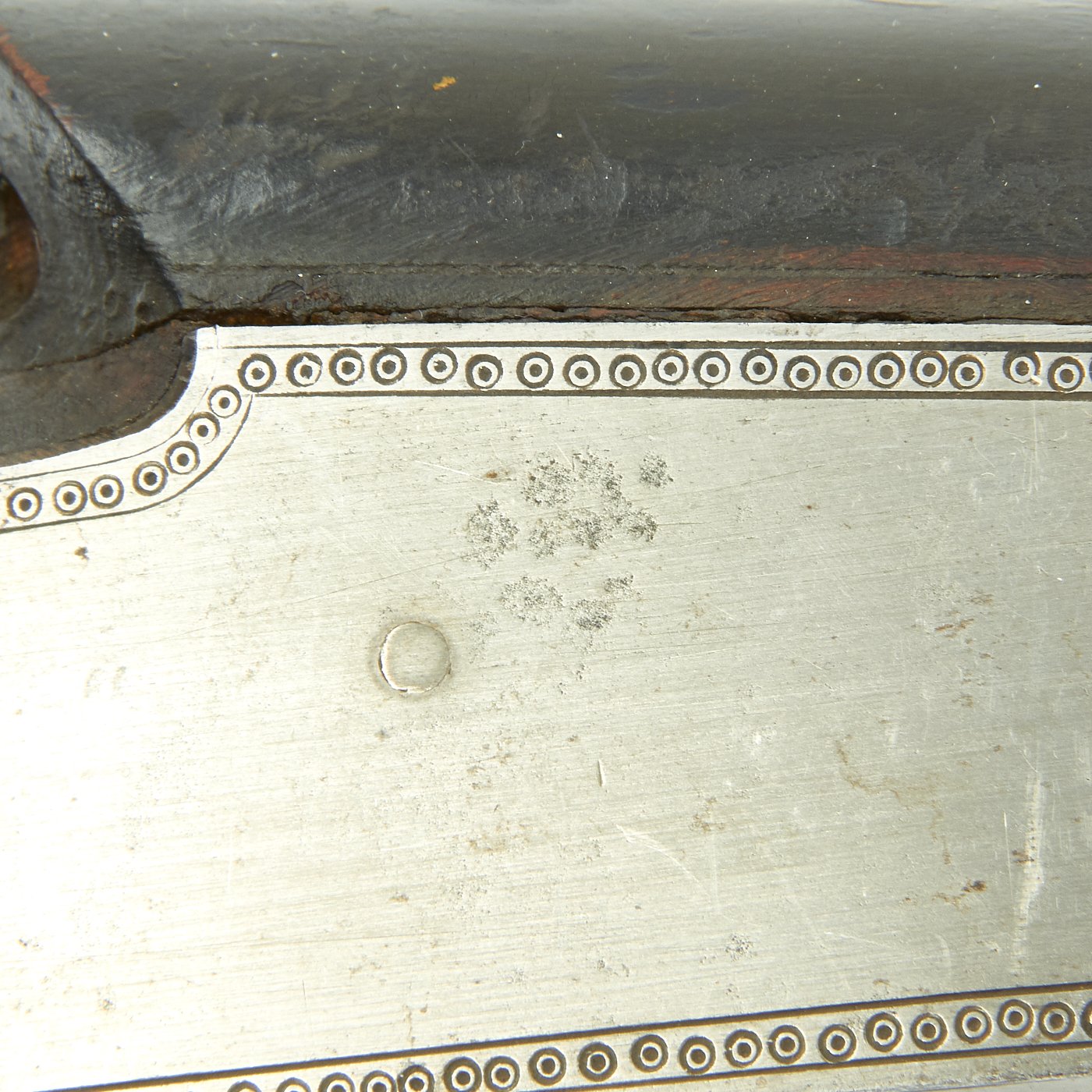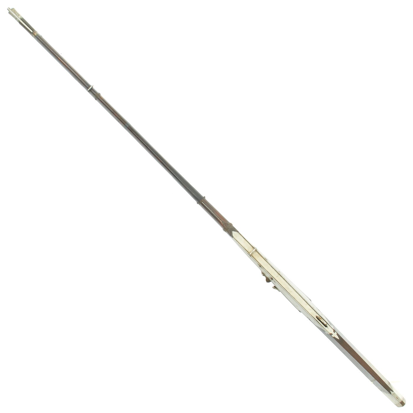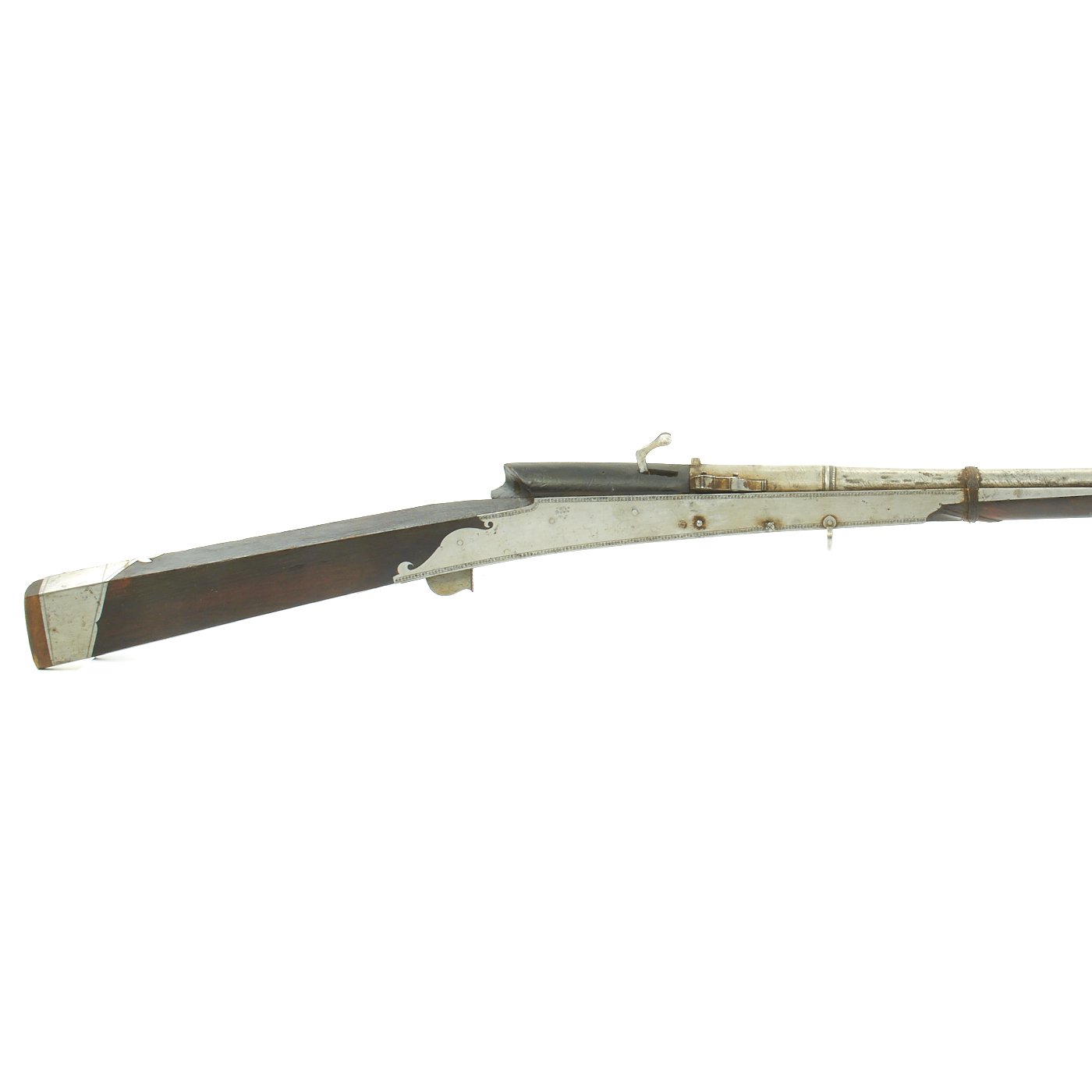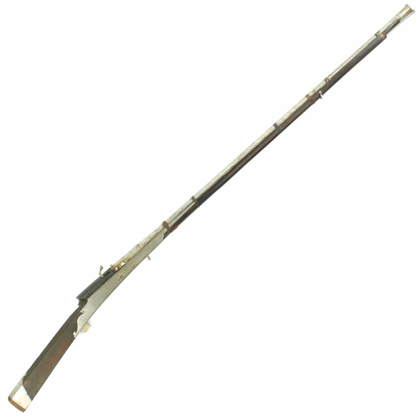 This is a truly fine example in a wonderful condition, made around 1750 during the early Georgian, has a beautifully polished wood full stock and bright shining decorated iron panels and barrel. It originally had wrapped cord barrel bands, but these have deteriorated over the years. The barrel is also a very attractive Damascus type laminated cruicible steel. The gun comes complete with its original iron ramrod, which is engraved with spiral grooves on the end.