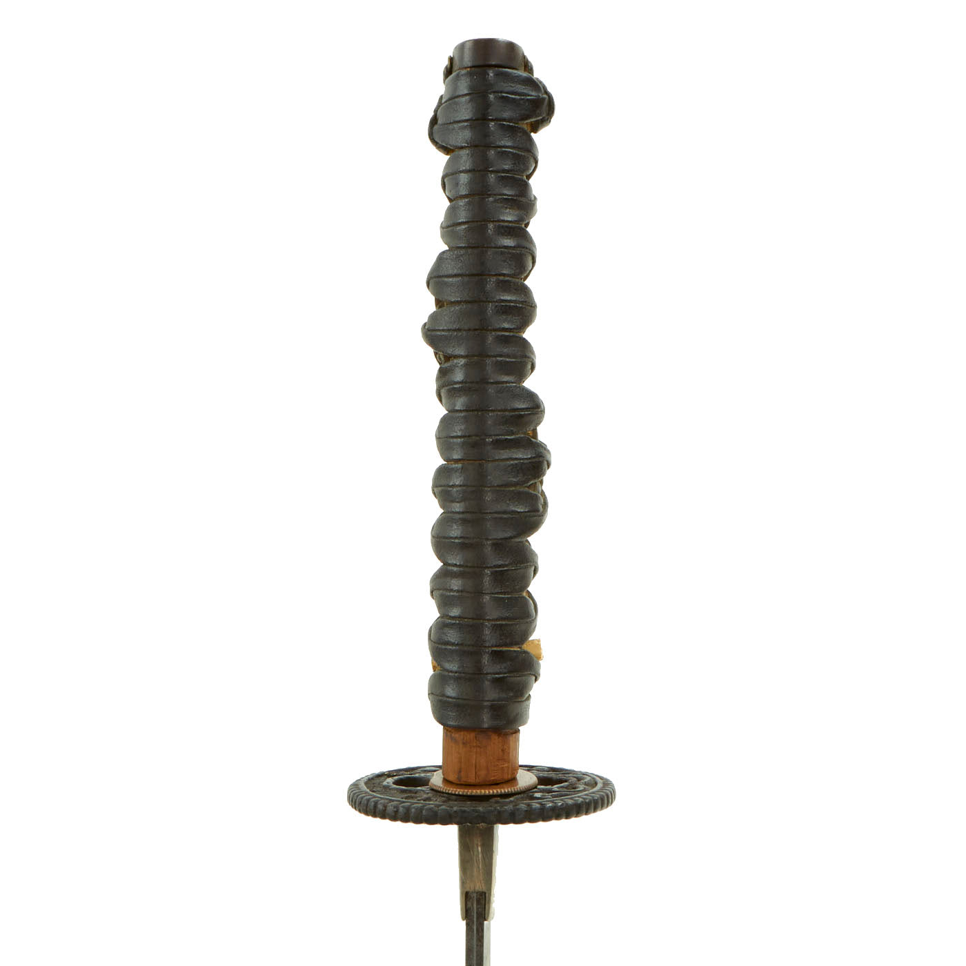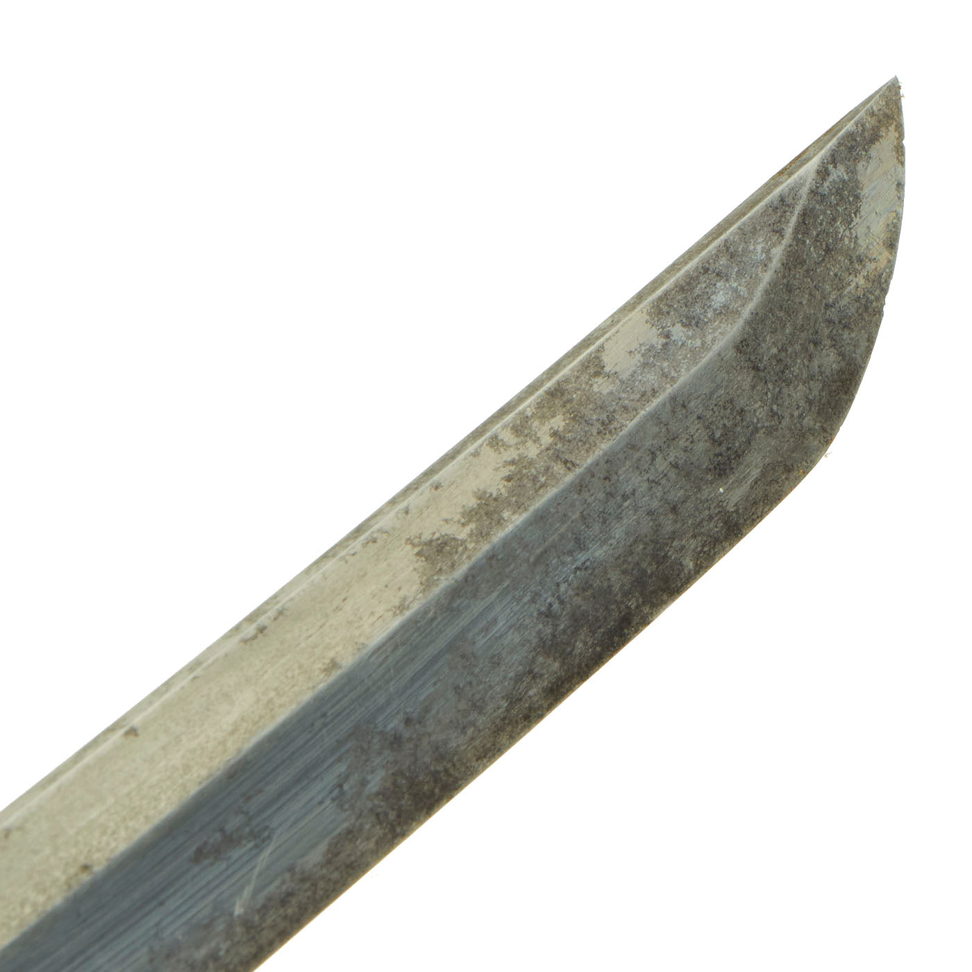 The blade of this example is 18 3/4 inches long, and the polish on the blade is unfortunately degraded, with many areas of light surface staining, some of which has been cleaned off. This has made seeing aspects of the blade very difficult, and it has definitely been some time since the last time it was fully polished. The blade is still quite sharp, though there are some chips in the edge. Overall length of this wakizashi is 26 1/2 inches.