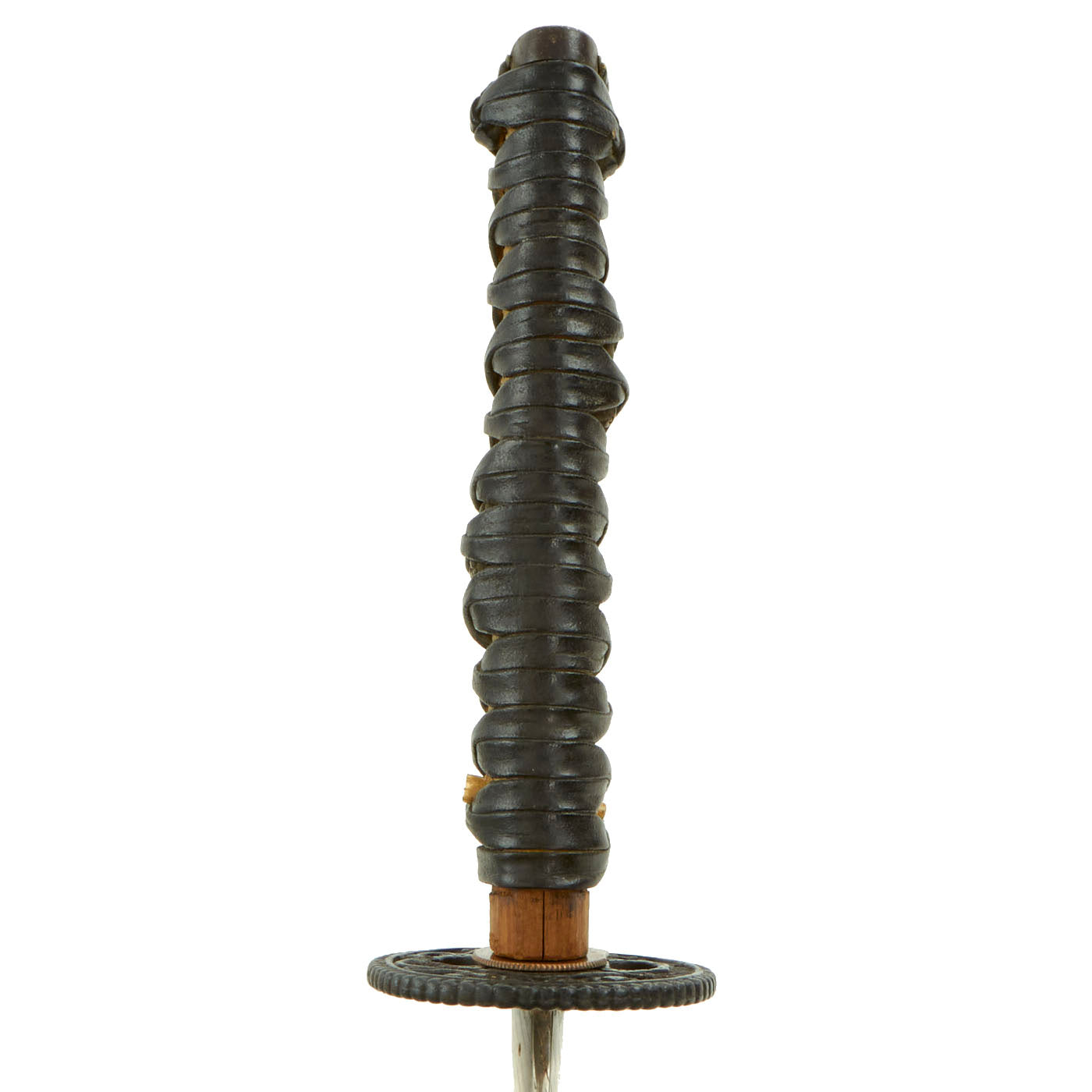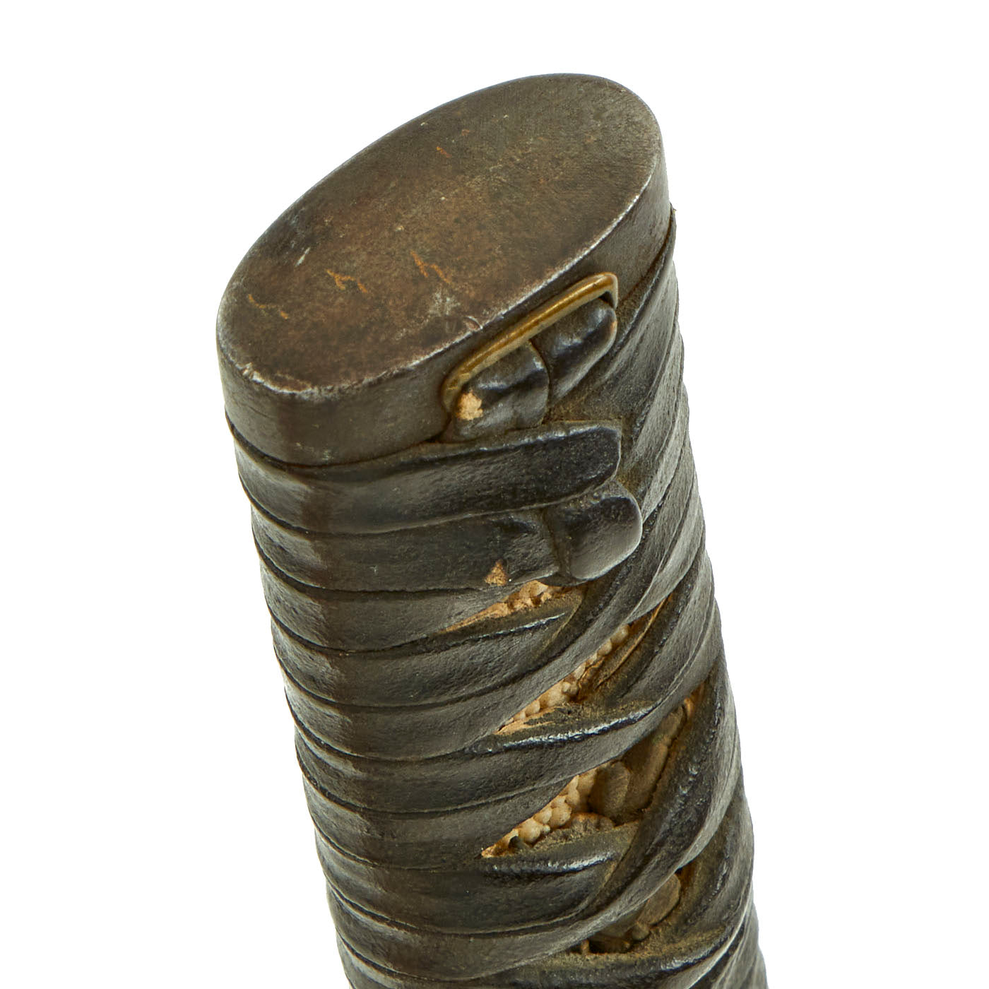 The fuchi (collar) for the tsuka (handle) is missing, and there is a simple iron Kashira (End Cap) on the bottom. There are two bronze menuki grip ornaments present, which look to be dogs. The stingray (Sa-Me) grip is in very good condition, and the grip wrapping (Ito) looks to be of finished leather, something we have not seen before. It shows light wear, and is in overall very good condition.