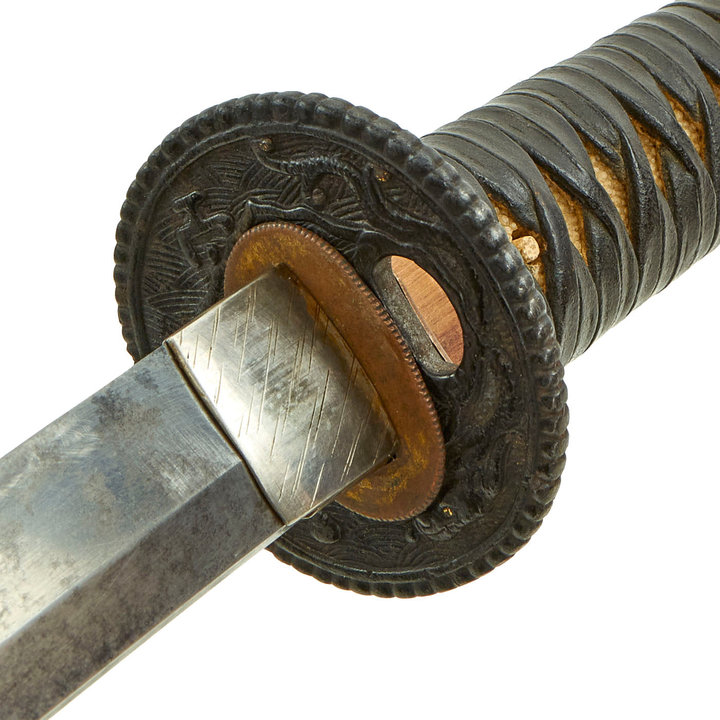 This example dates from the later Edo period (江戸時代, Edo jidai) or Tokugawa period (徳川時代, Tokugawa jidai) of Japanese history. This is the period between 1603 and 1867, when Japan was under the rule of the Tokugawa shogunate and the country's 300 regional daimyo. It is around the middle of the blade length range, and has a "Shinogi Zukuri" shape, the most common shape used, and the standard for the longer Katana.