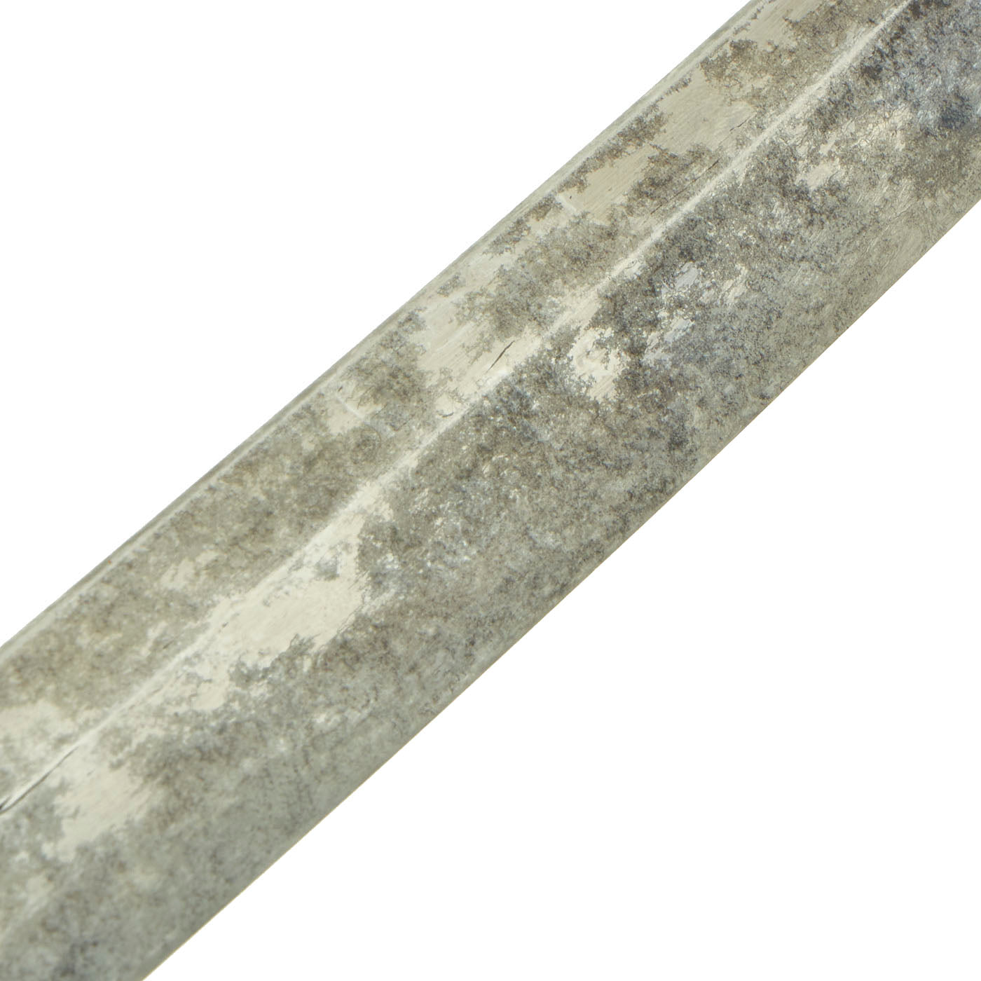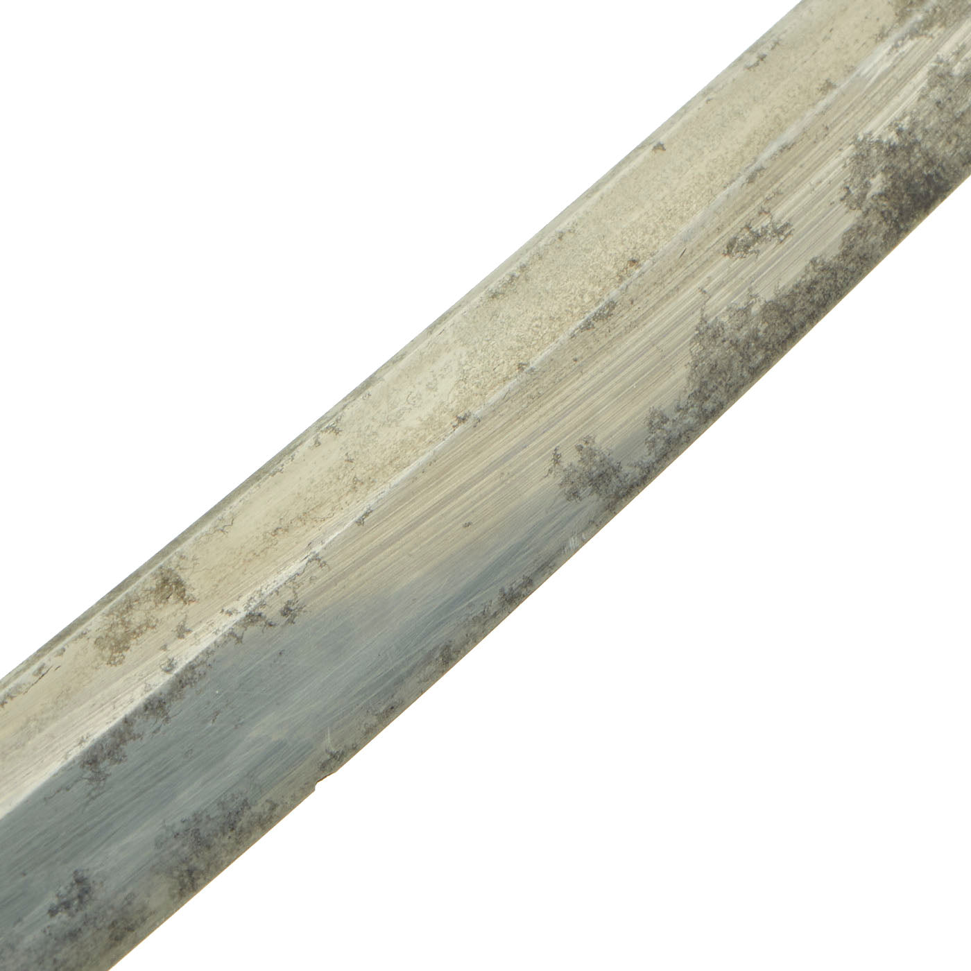 The tang (nakago) is of the futsu 普通 (regular) style, with a Kuri-jiri (symmetrically rounded) nakago-jiri (tang tip). There are blade wounds including ware (lamination splits) and fukure (Carbon pits). The hamon (temper line) is still faintly visible in one areas of the blade where there is no staining, and it is a very active CHOJI (clover treeflower), with some TOURAN (billowing) aspects. There look to be some UCHINOKE crescent shaped lines of NIOI cloudiness above the temper line. It's a shame that it is not in better polish. The boshi and yokote are unfortunately not visible at all. The sword has a very nice silver Habaki (blade collar) with "rain" engraving, which is typical of the Edo period.