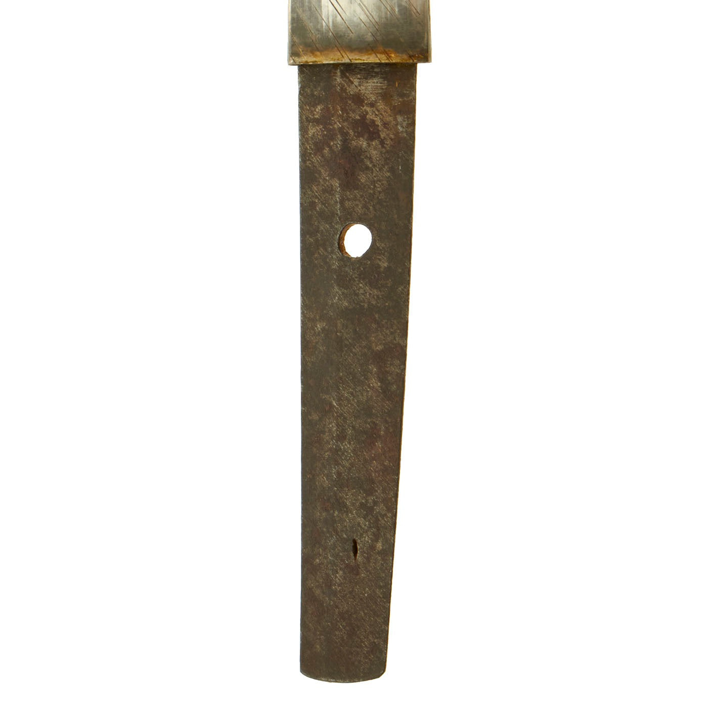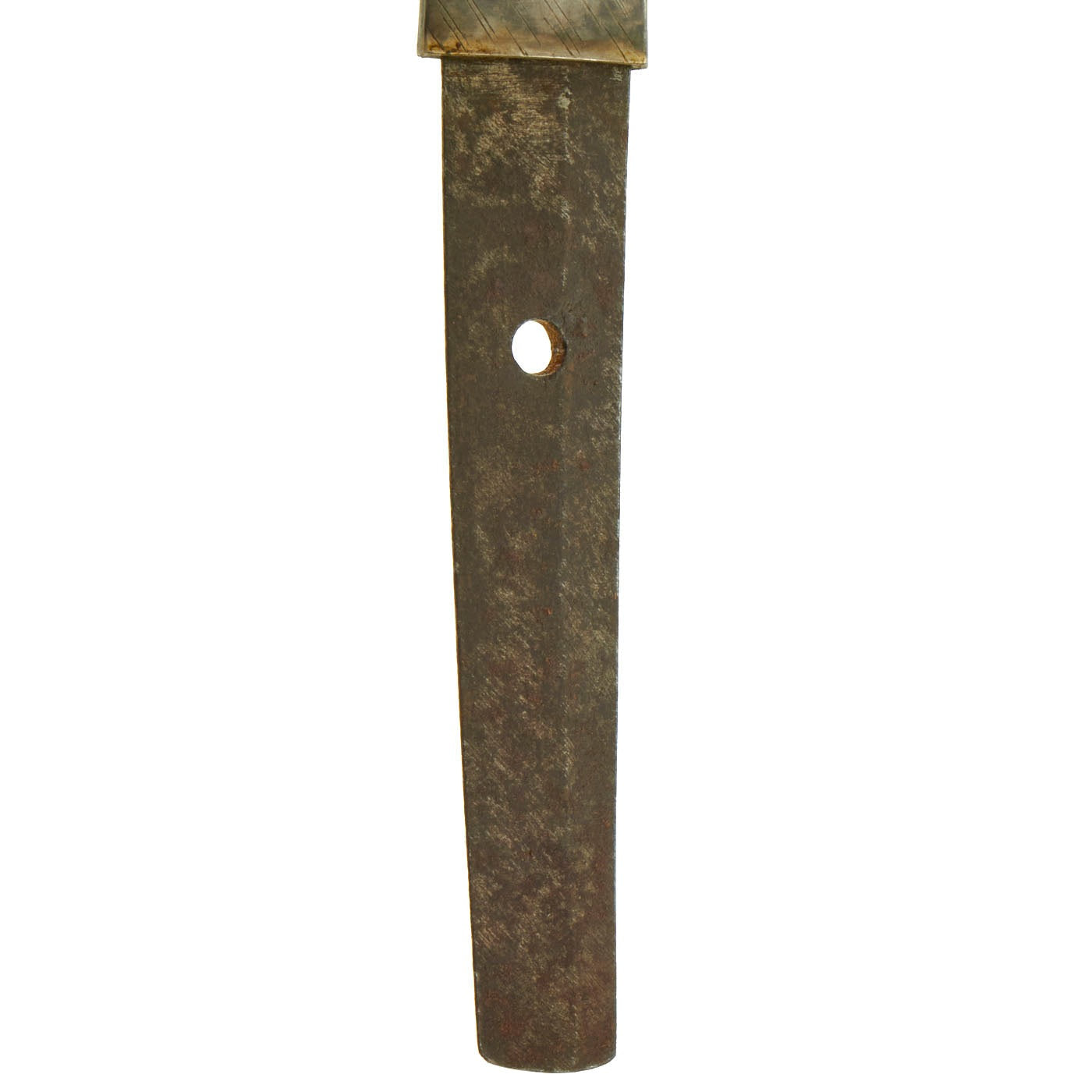 - Blade wounds (kizu) or lamination artifacts are present on the blade. Both ware (lamination lines) and fukure (carbon pits) are visible.