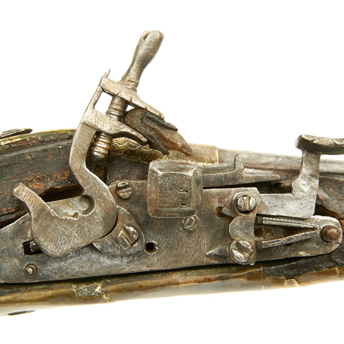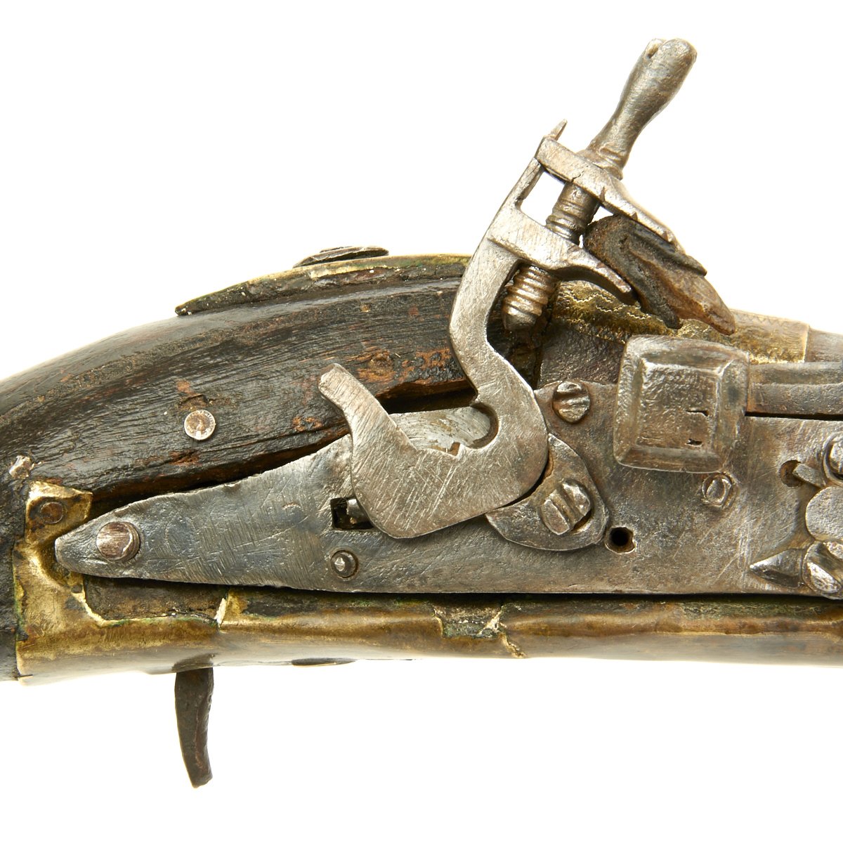 Original Item. Only one Available. This is lovely well-used North African "Barbary Pirate" Snaphaunce, similar to flintlock, pistol from what is today Morocco /Algeria or Lybia. These were fashioned after Spanish 17th Century Snaphaunce pistols, and this example is really quite faithful to it's Spanish ancestry. Ball butted with brass mounts this has certainly seen its day.