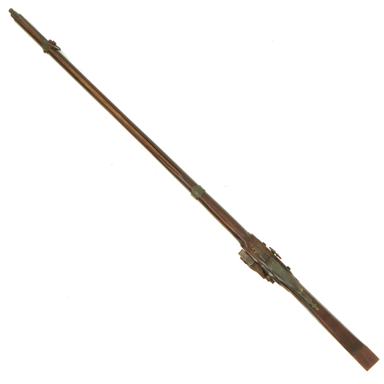 Original Item: Only One Available. This is a lovely Spanish Flintlock Musket known as an Escopeta, made with a MIQUELET lock, a predecessor / alternative to the standard flint lock design in use throughout most of Europe. It shows typical mid 18th Century rough construction using all brass mounts, with sling swivels mounted on the left side. As Spain maintained many colonies at that time these muskets were scattered All over the globe and as a result are very hard to find today.