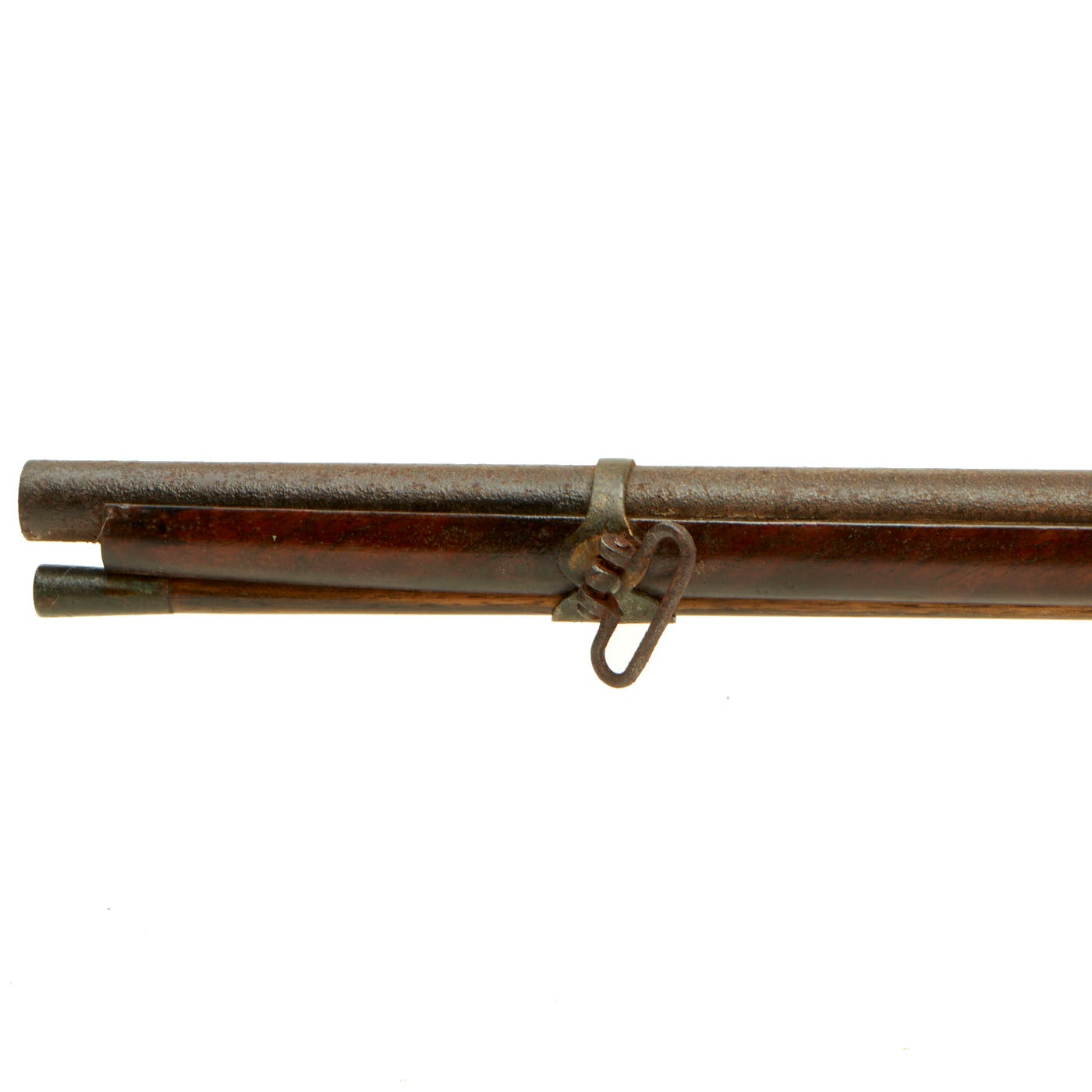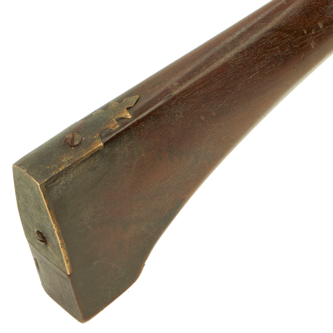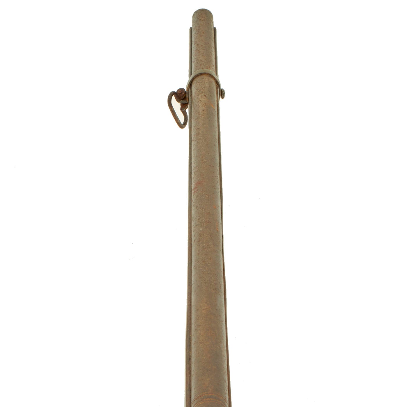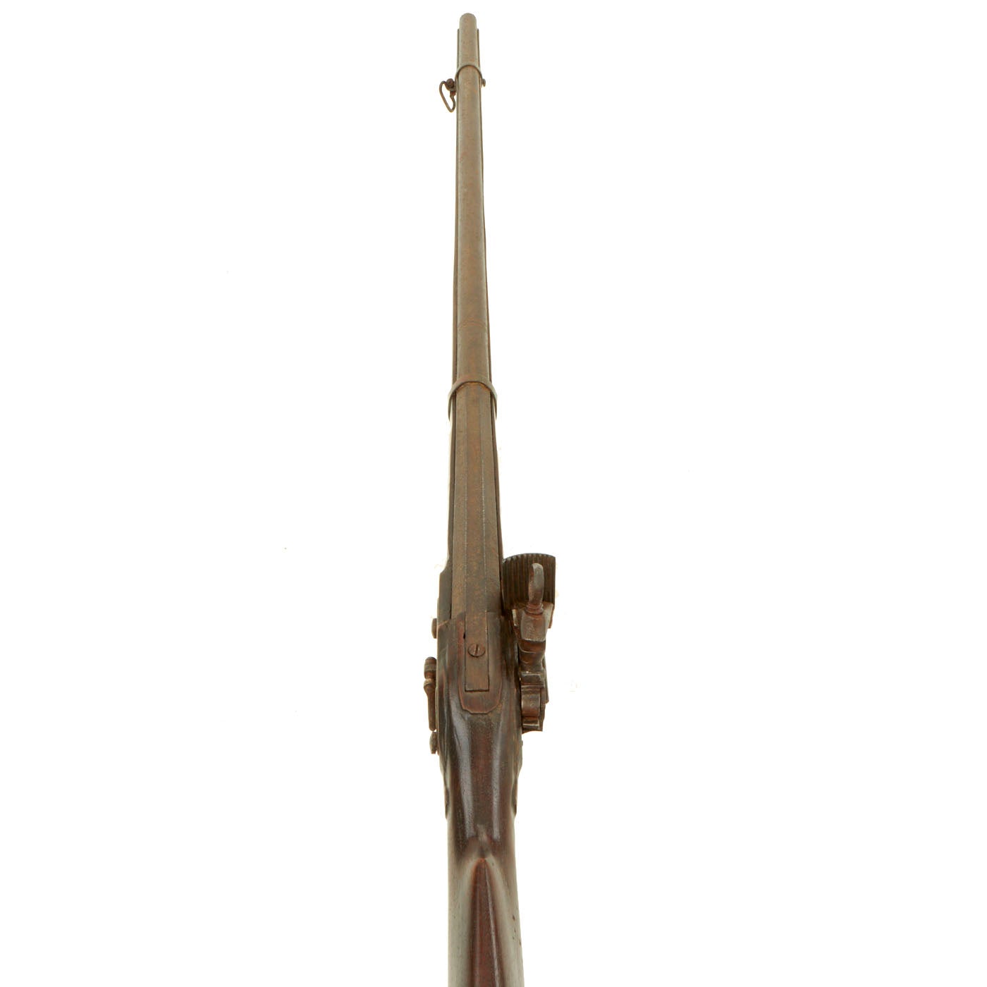 Measuring about 55 1/2 inches in overall length, the barrel is 40 inches long and part-octagonal, with a bore of about .69 of an inch. The musket comes with a replacement ramrod, and is overall in "attic find" condition. The wood stock is in great shape with a lovely polished look, however the steel and iron components of this Escopeta have unfortunately suffered from oxidation over the centuries. The trigger is currently frozen, so while the hammer on the lock does pull back and lock into place, the half and full cock latches need to be pushed back in by hand at present. The frizzen spring is also broken, and there is surface rust on a lot of the lock components.