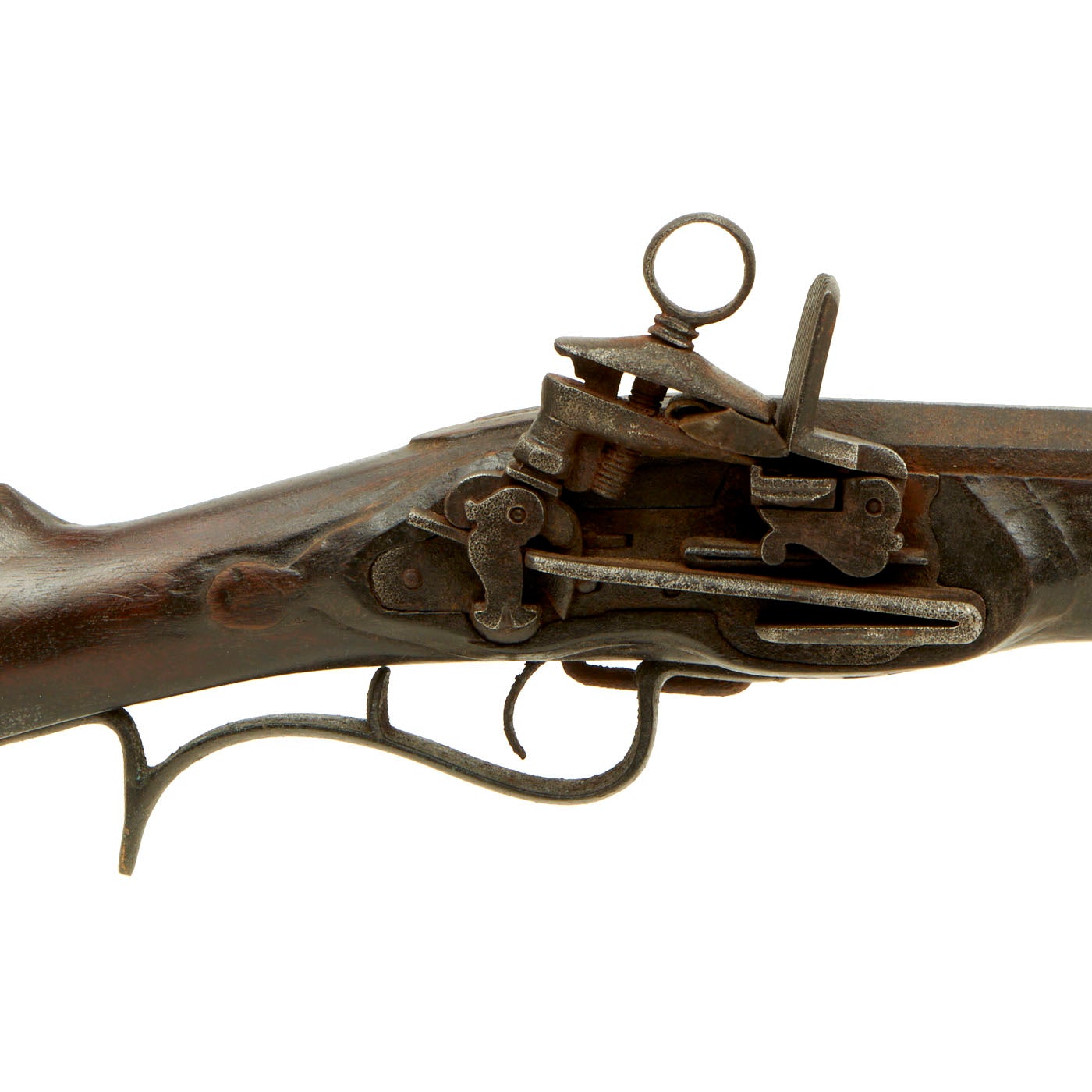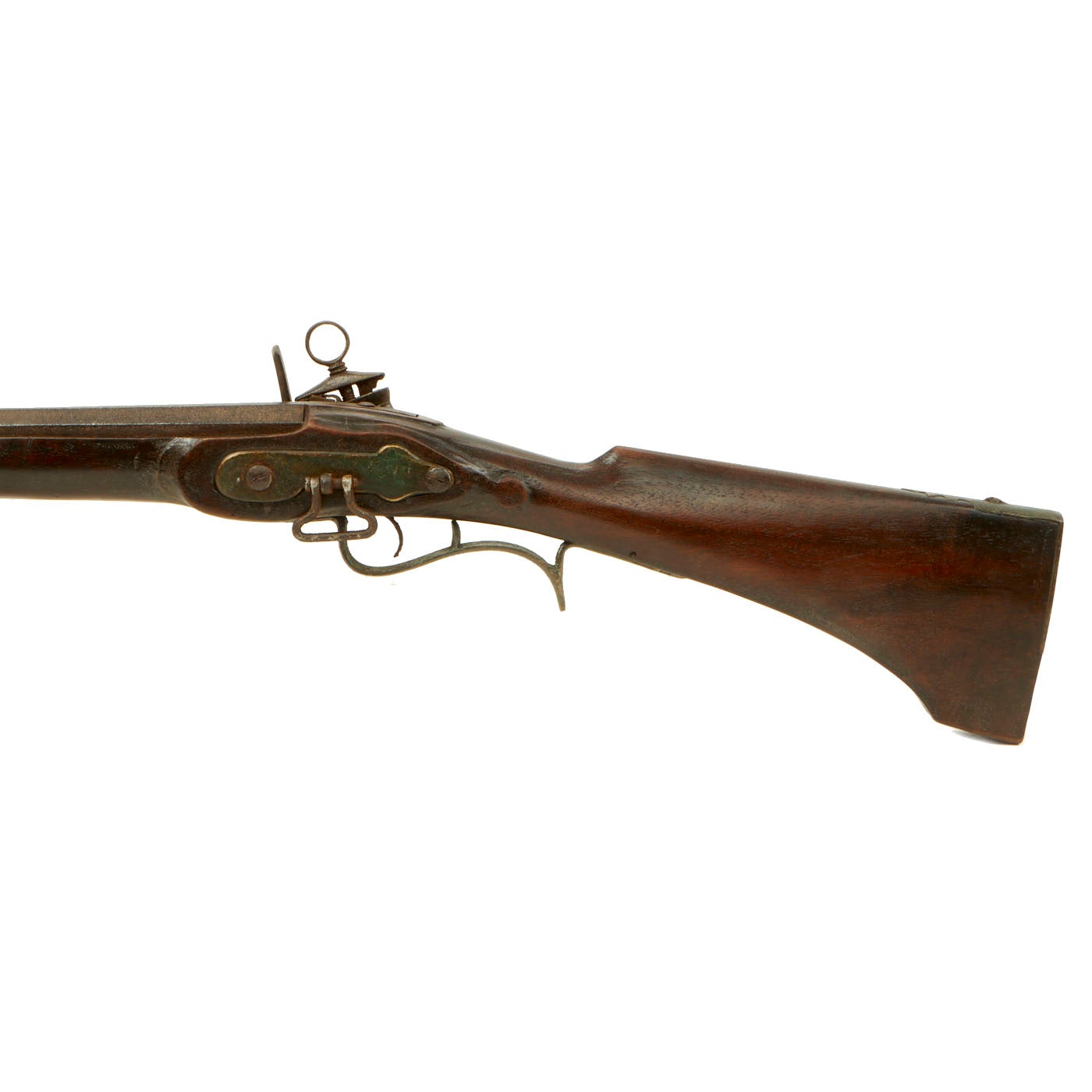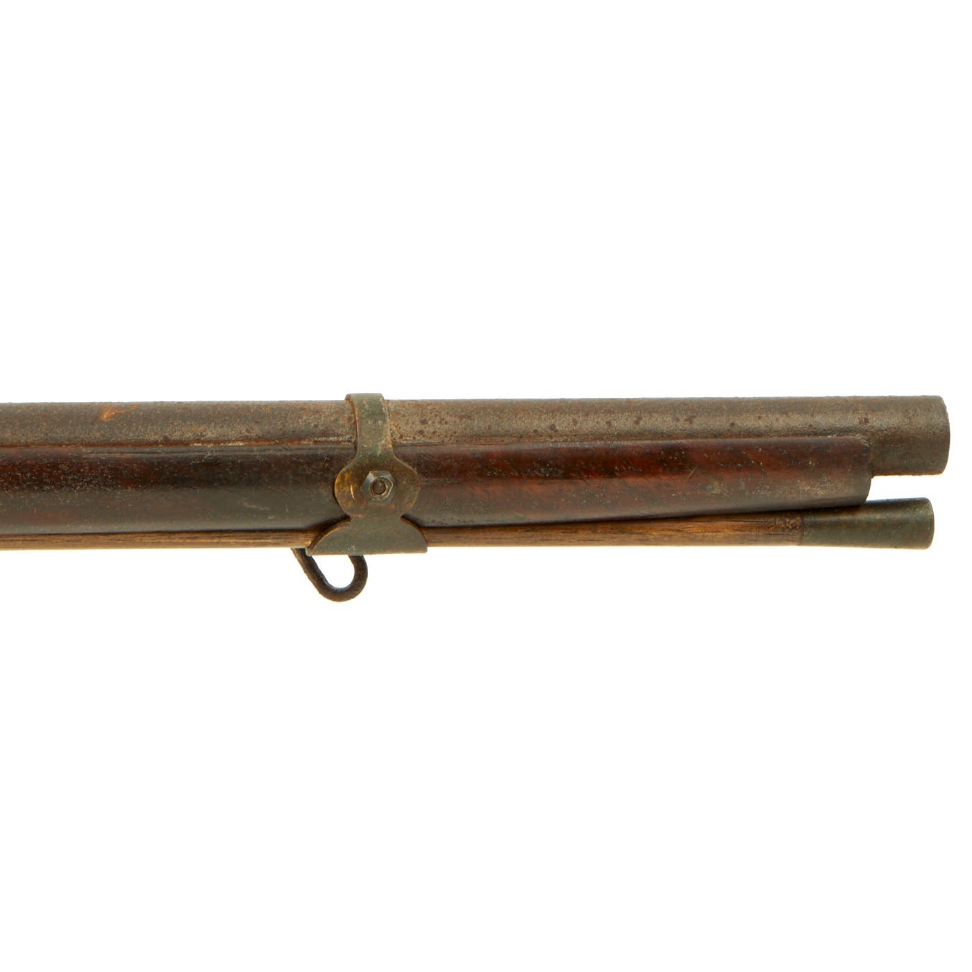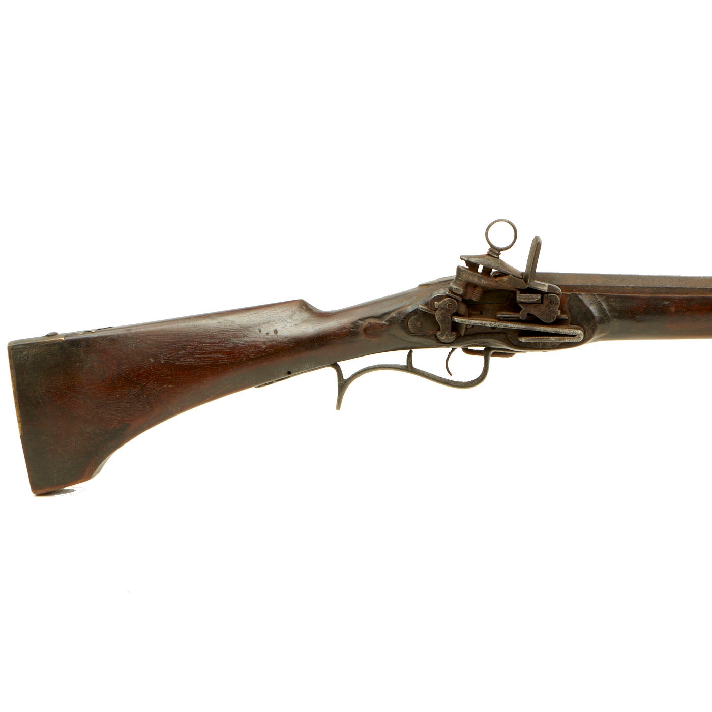 Measuring about 55 1/2 inches in overall length, the barrel is 40 inches long and part-octagonal, with a bore of about .69 of an inch. The musket comes with a replacement ramrod, and is overall in "attic find" condition. The wood stock is in great shape with a lovely polished look, however the steel and iron components of this Escopeta have unfortunately suffered from oxidation over the centuries. The trigger is currently frozen, so while the hammer on the lock does pull back and lock into place, the half and full cock latches need to be pushed back in by hand at present. The frizzen spring is also broken, and there is surface rust on a lot of the lock components.