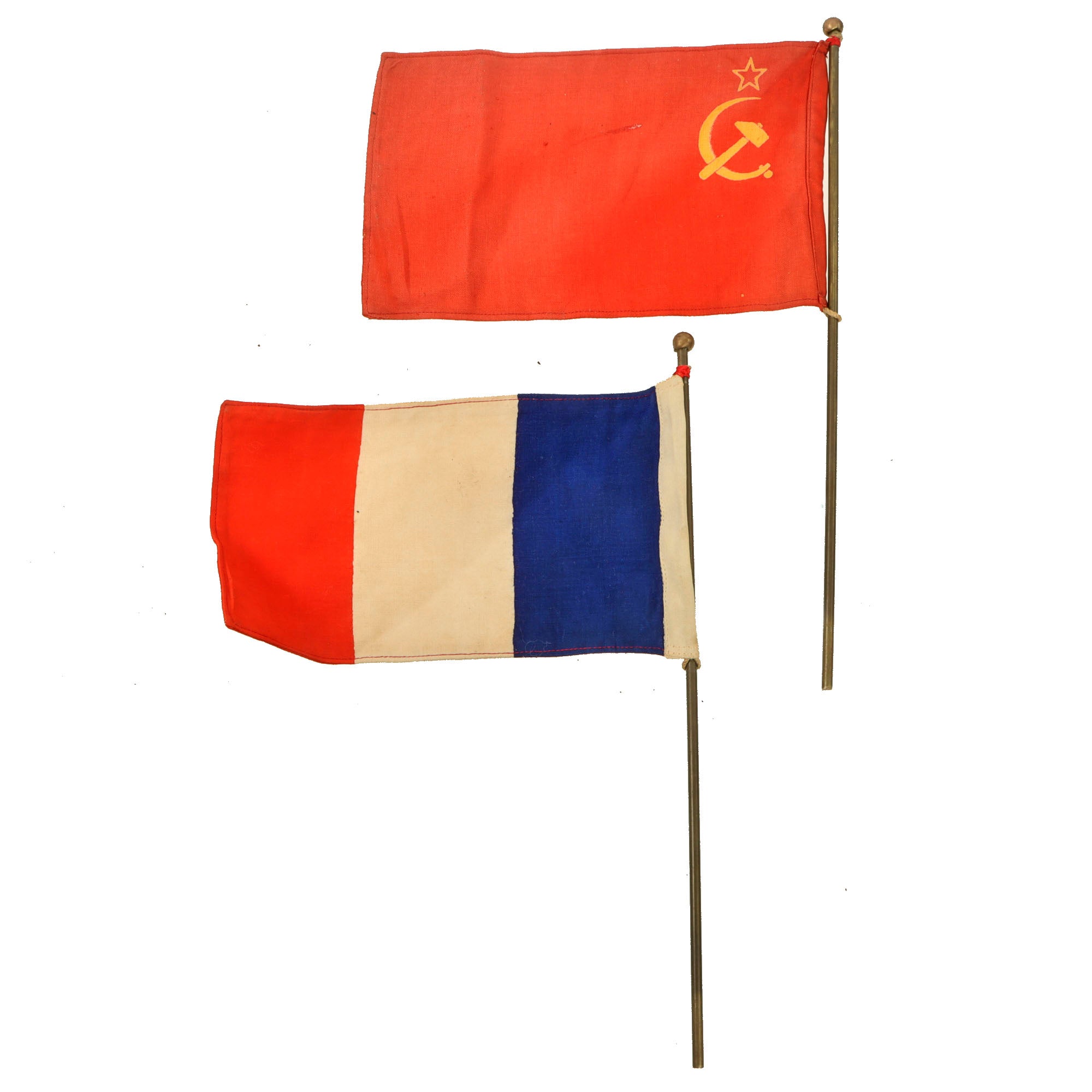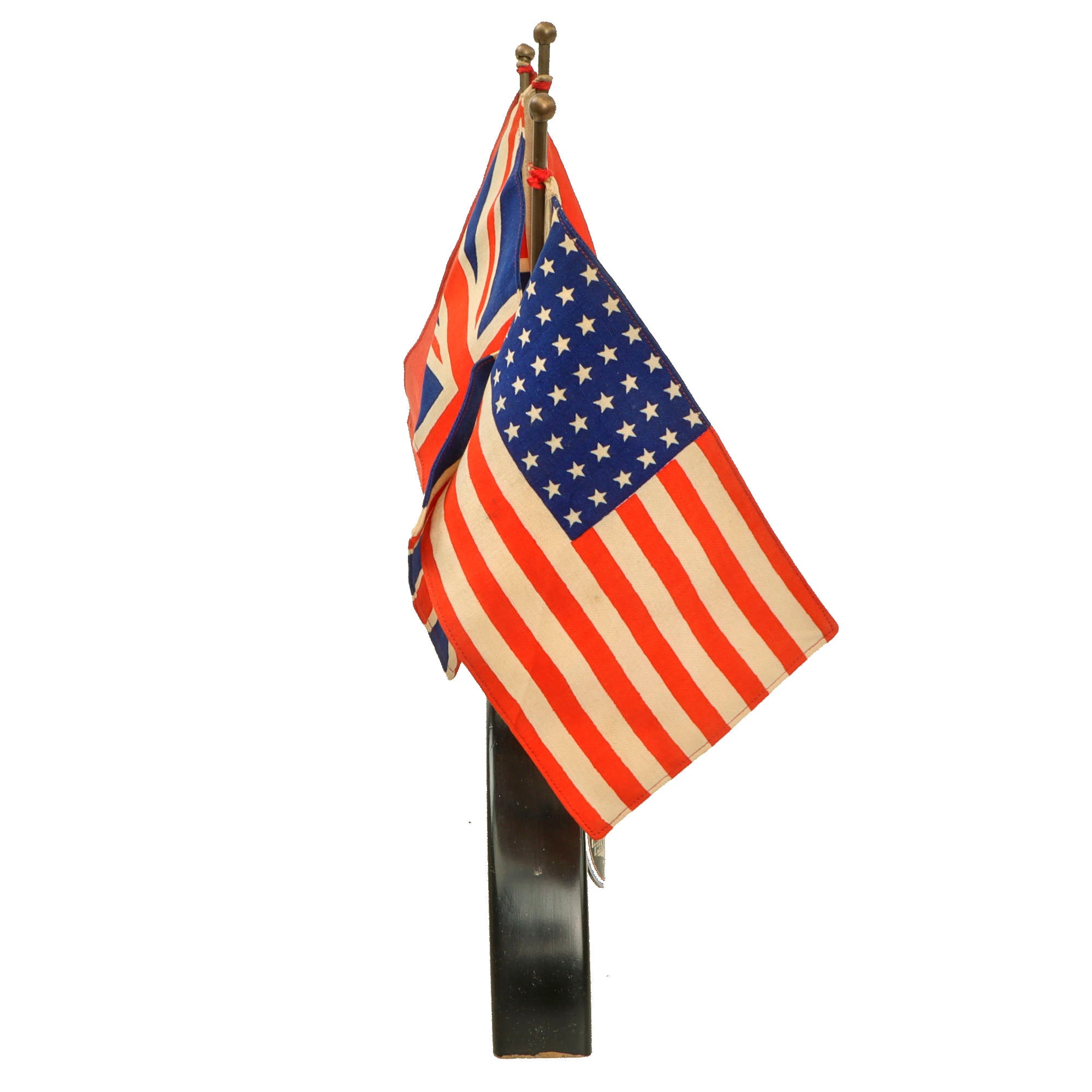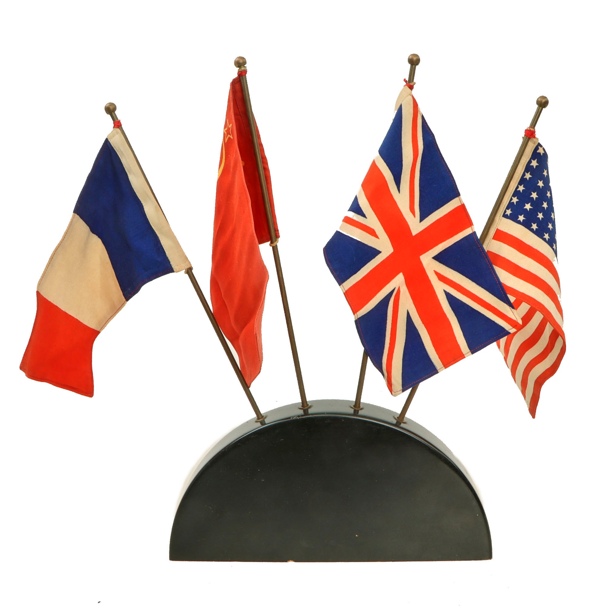 This is a great and rare desk flag set for the International Patrol in Vienna with the flags of the four powers, the United States, Great Britain, the USSR, and France. With the flags inserted, the set measures roughly 10 ¼ x 1 ½ x 15 ⅜”.