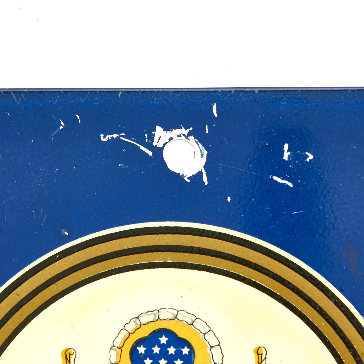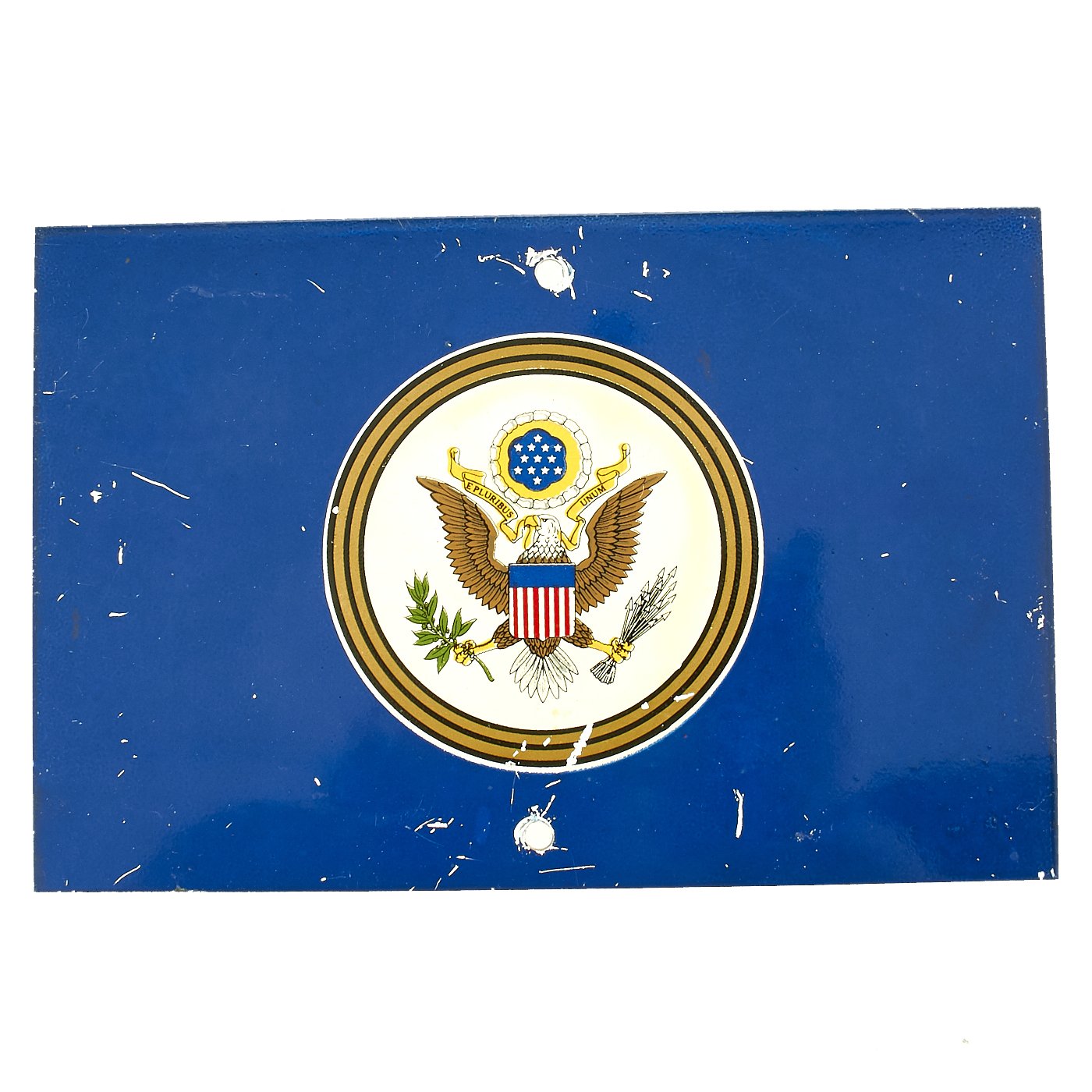 Original Item: Only One Available. This is a very nice vehicle identification fender placard or plate, used to identify vehicles when carrying high ranking U.S. government officials. Often many vehicles would carry a set of these plates, so that they would always have the correct plate for the occupants. The placard is made of a non ferrous metal, most likely aluminum, and the front is painted with the Great Seal of the United States in the center of a dark blue field. This most likely indicates that the Great Seal itself, usually in the possession of the U.S. Secretary of State, is on board the vehicle.