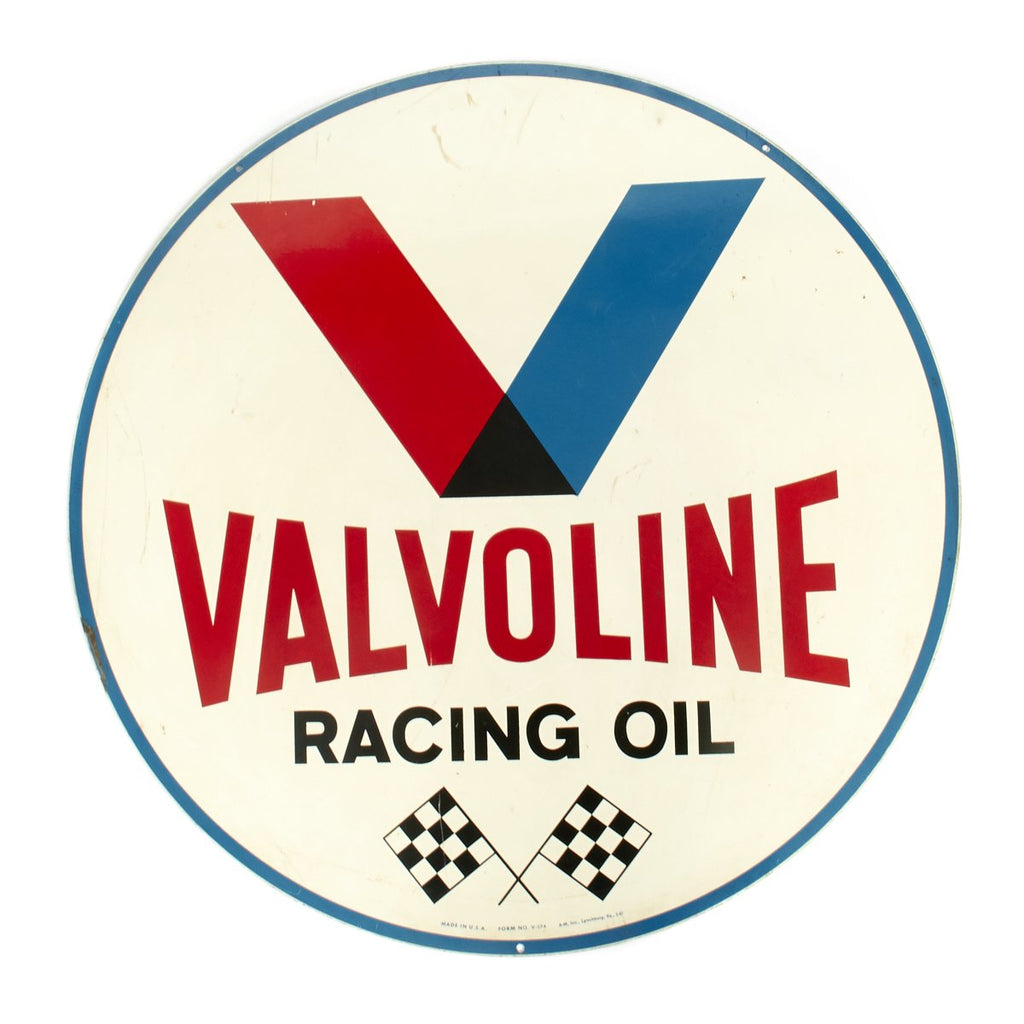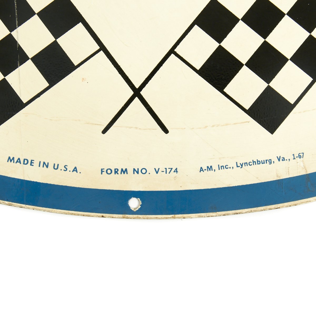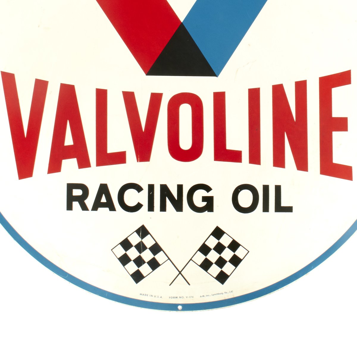Original Item: Only One Available. This is a genuine 1967 dated vintage tin Valvoline Racing Oil 30 inch round tin sign. This is the rarest of this style sign due to the checkered racing flag graphics. The signs has three hanging holes around the border located at 10 o'clock, 2 o'clock and 6 o'clock. The bottom of the sign is nicely marked: