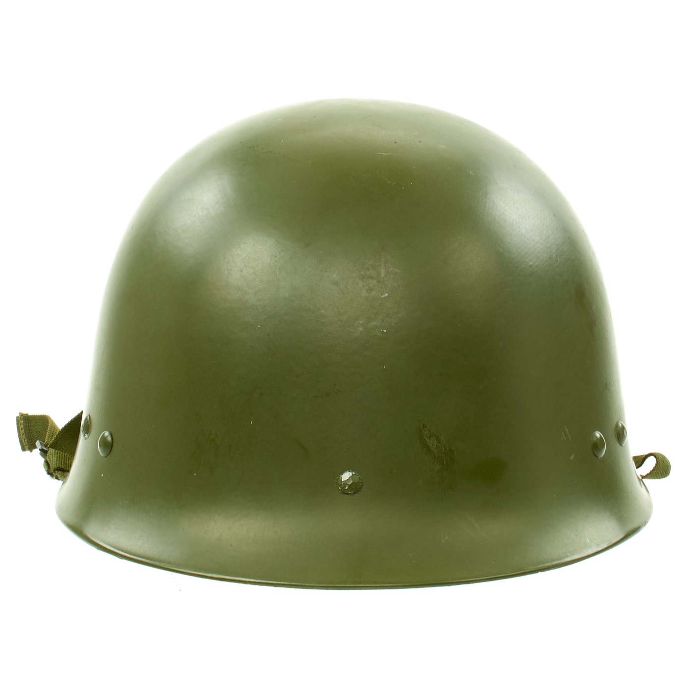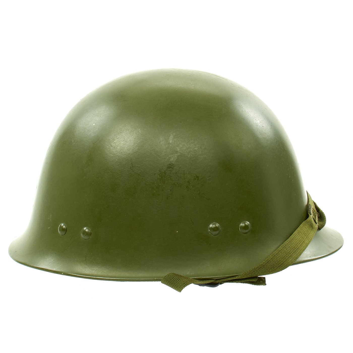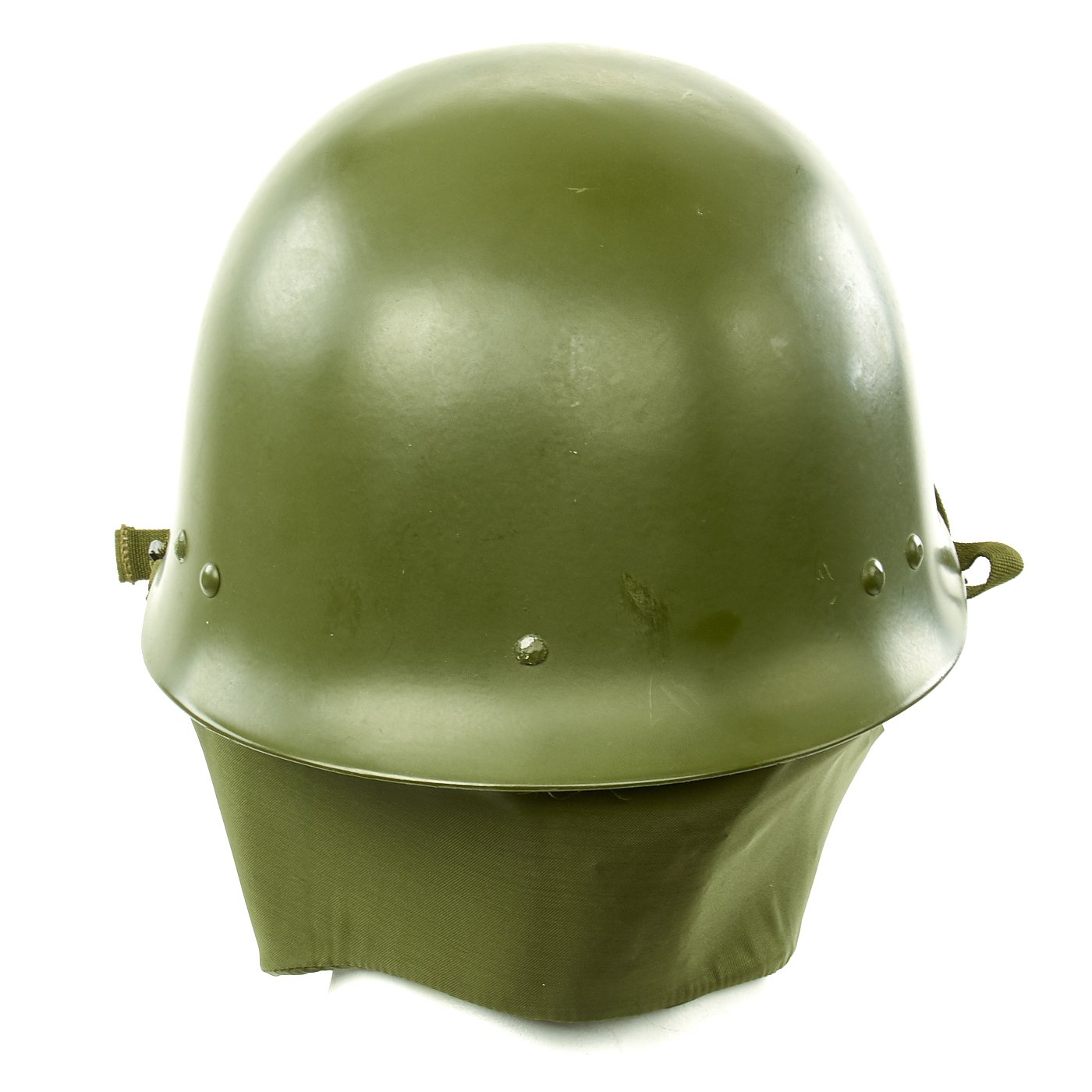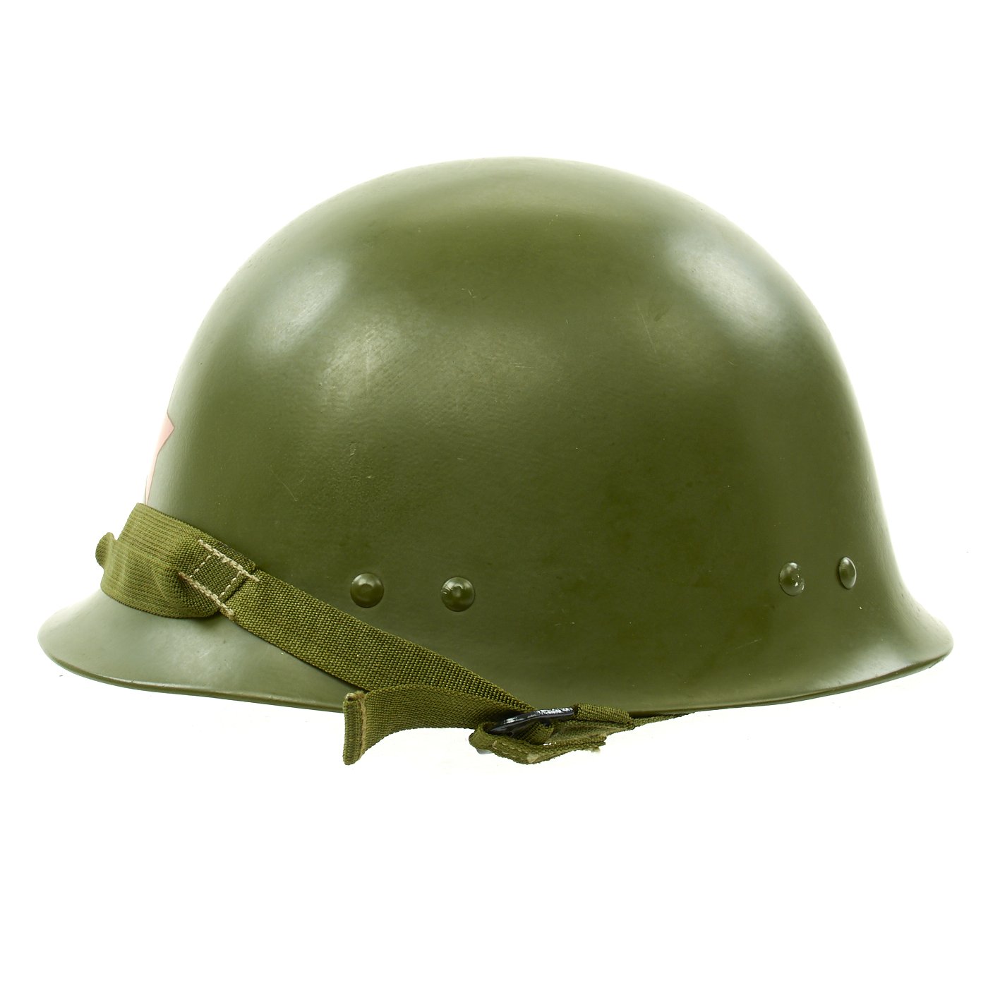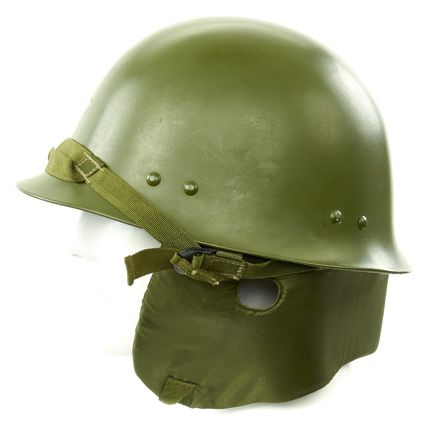 This example is complete and in very nice shape, with the only real condition issue being degradation of the foam inside the padded neck/head cover, which snaps onto the rigging inside the helmet. The liner is intact, and chin strap complete. Helmet is green, with a red communist star on the front.