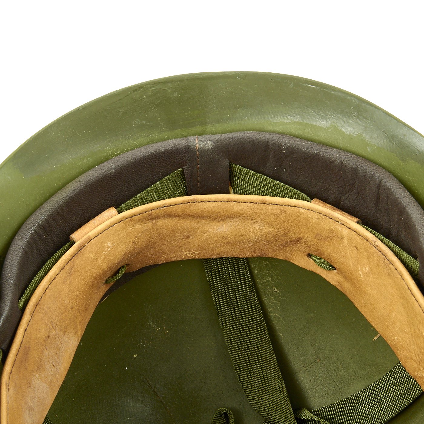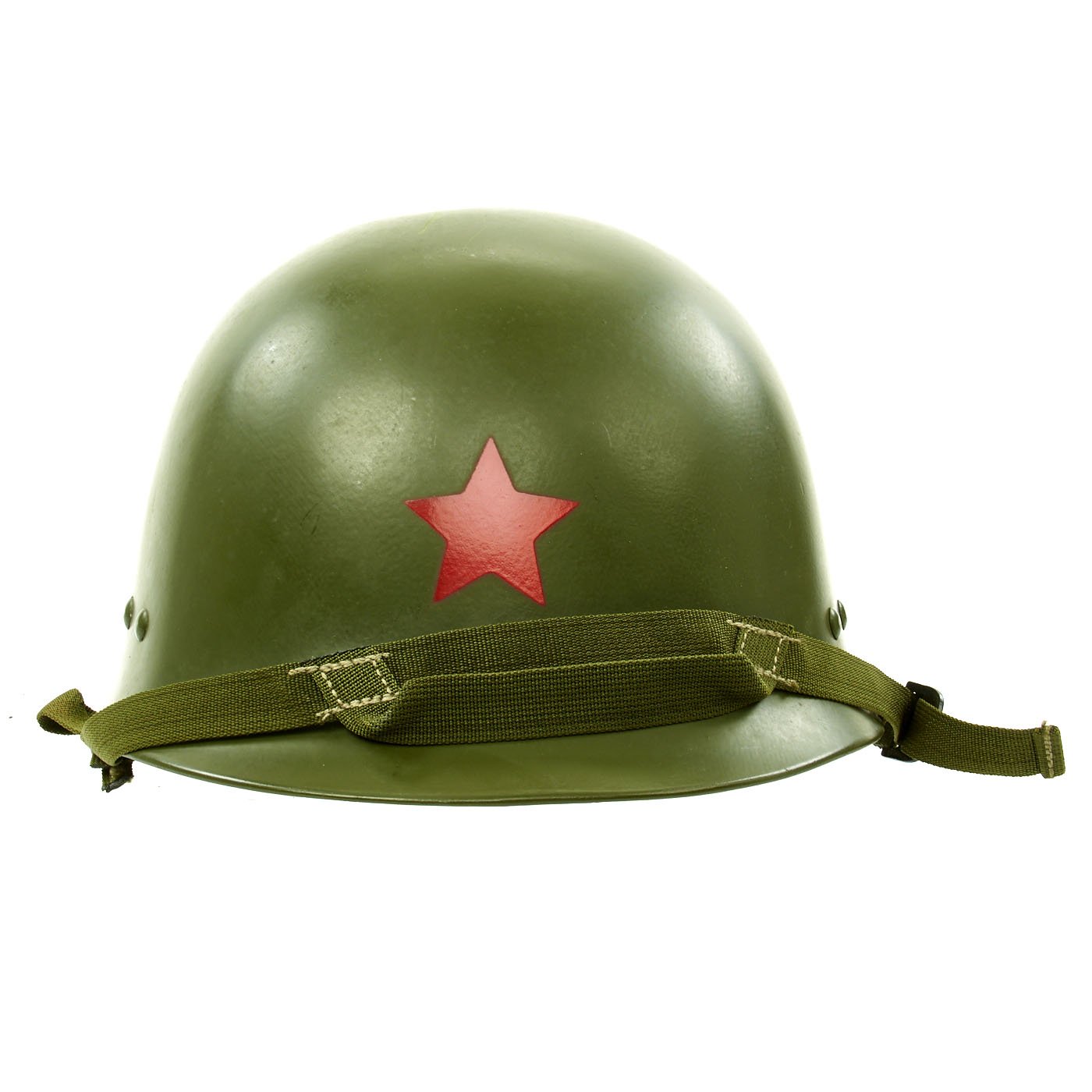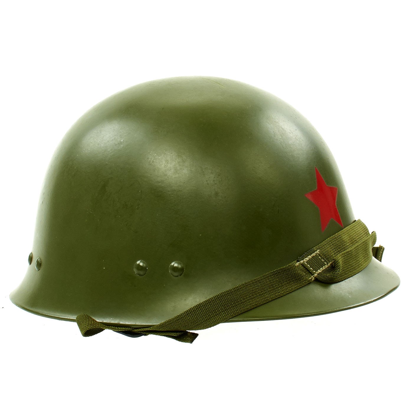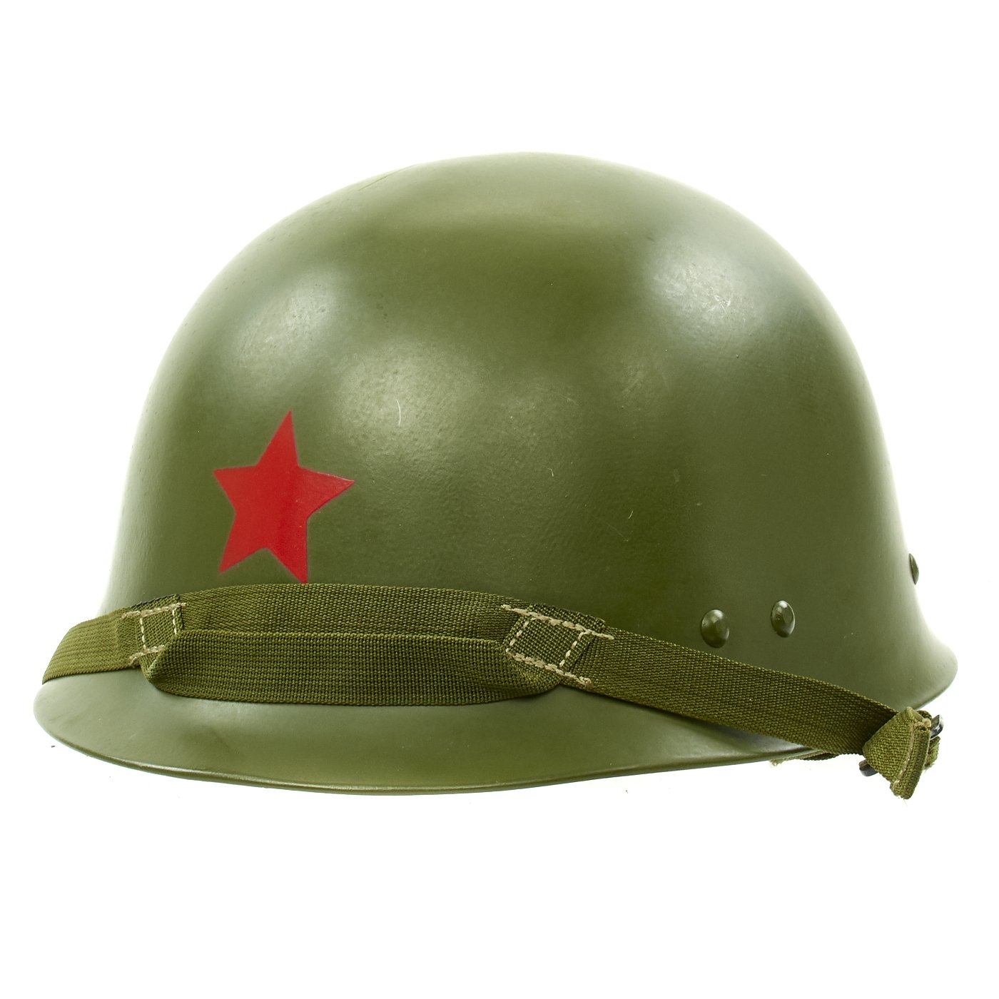 This example is complete and in very nice shape, with the only real condition issue being degradation of the foam inside the padded neck/head cover, which snaps onto the rigging inside the helmet. The liner is intact, and chin strap complete. Helmet is green, with a red communist star on the front.