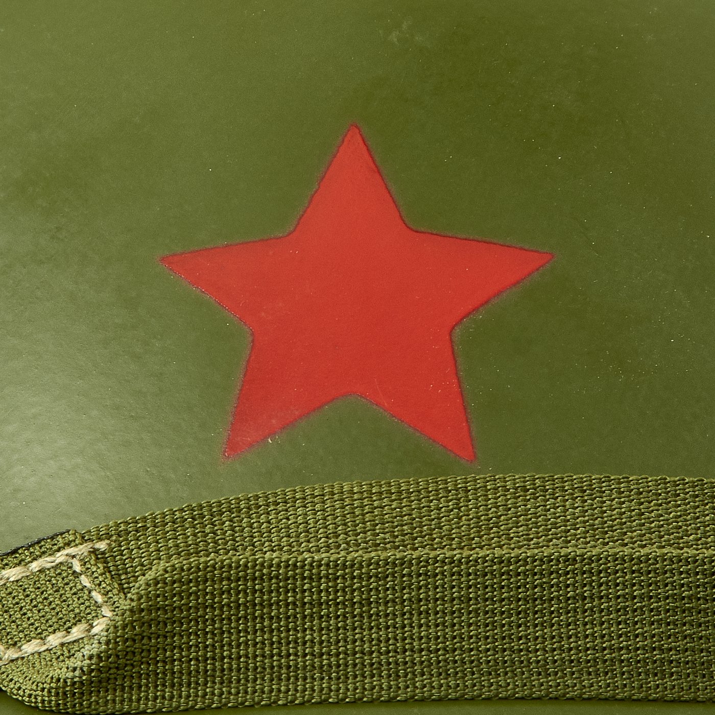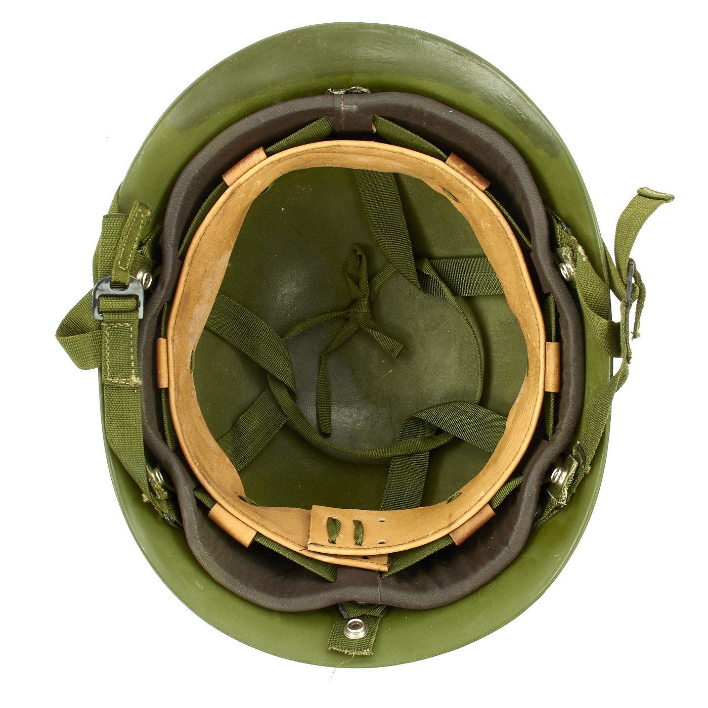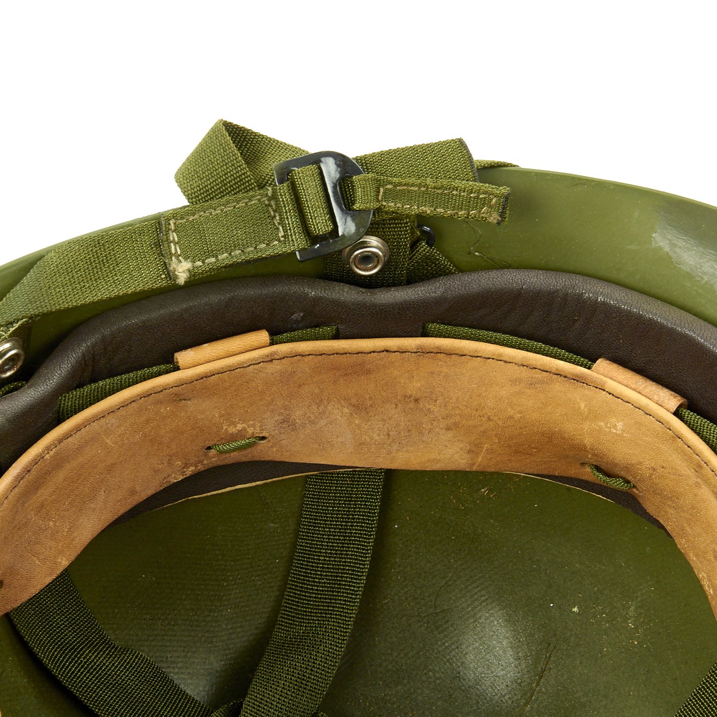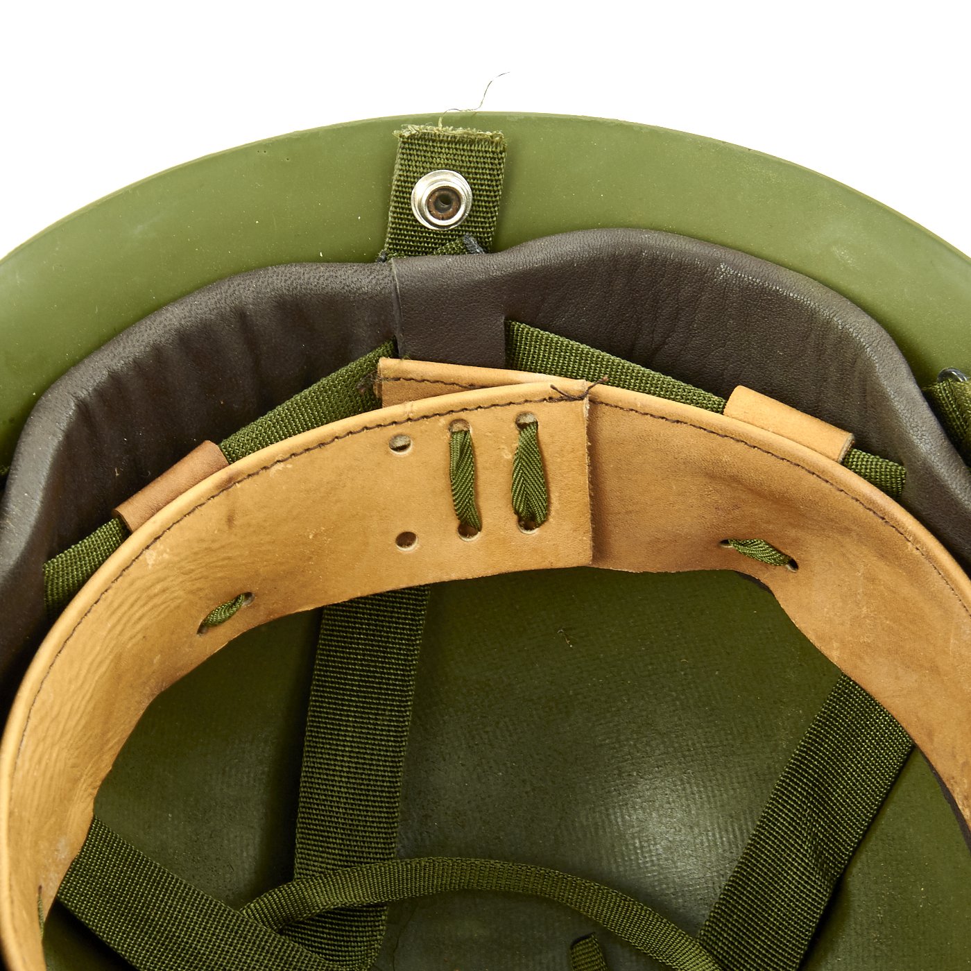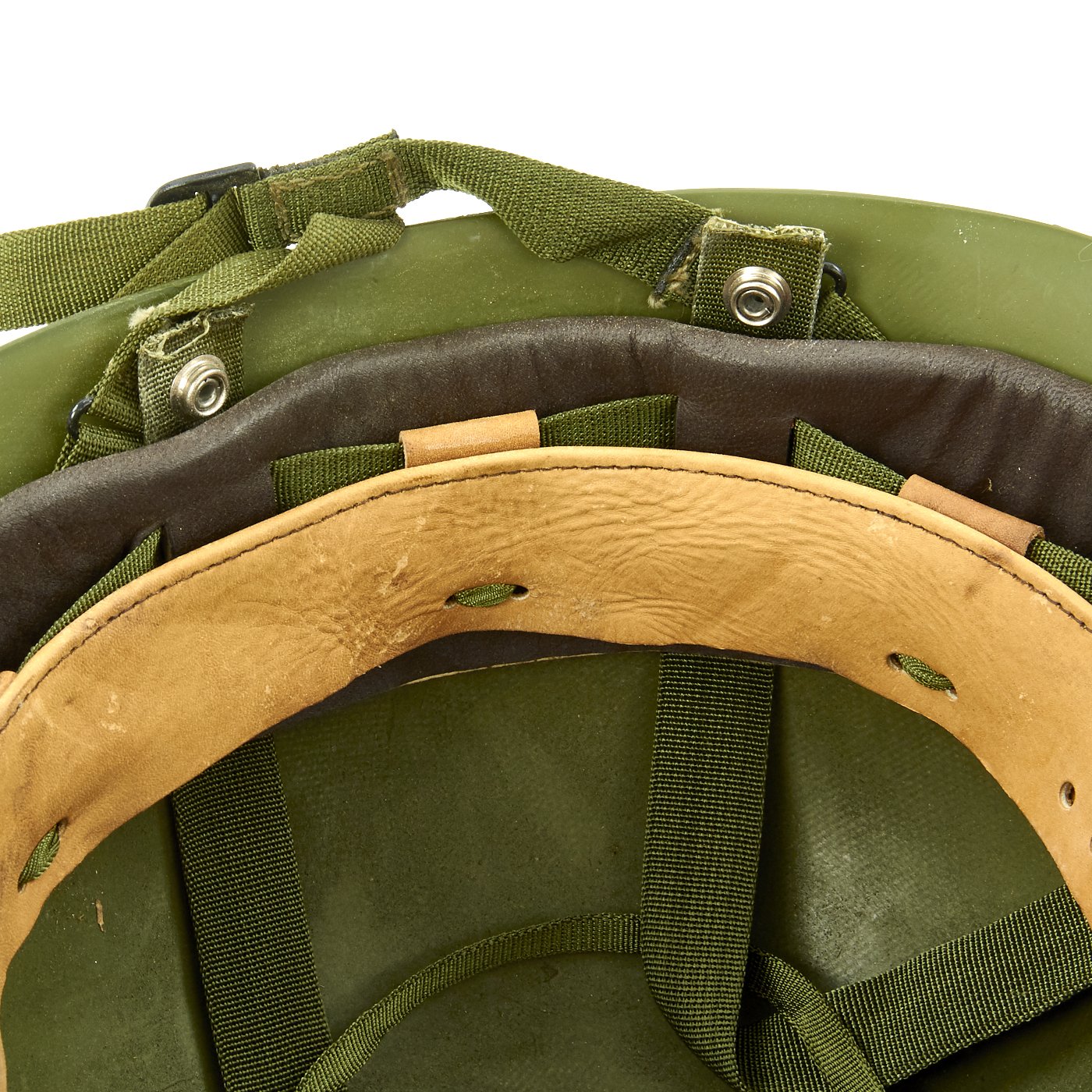 This example is complete and in very nice shape, with the only real condition issue being degradation of the foam inside the padded neck/head cover, which snaps onto the rigging inside the helmet. The liner is intact, and chin strap complete. Helmet is green, with a red communist star on the front.