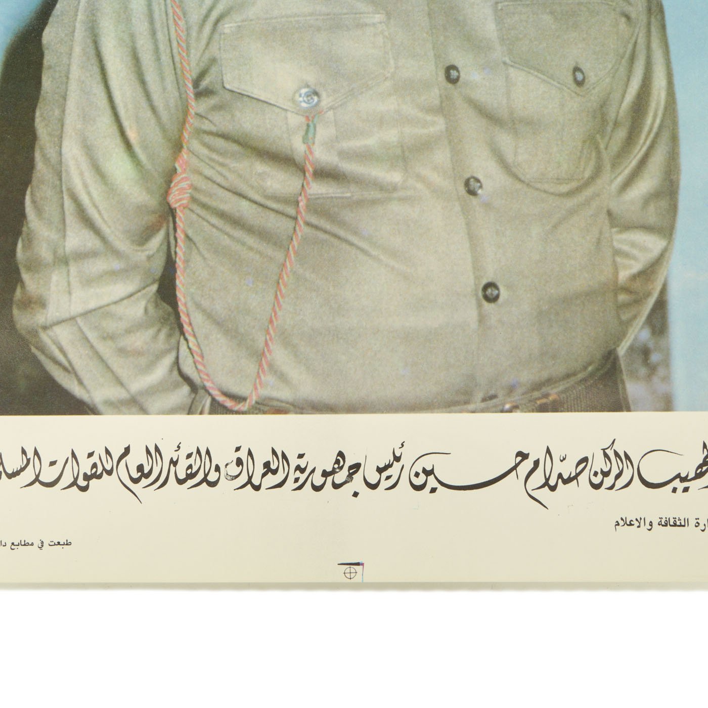 Original Item: Only one available. Iraqi Propaganda Poster featuring younger Saddam Hussein posed in a khaki military uniform. Certainly captured during Operation Desert Storm. Condition is excellent. Measures approximately 27” x 19.5”
