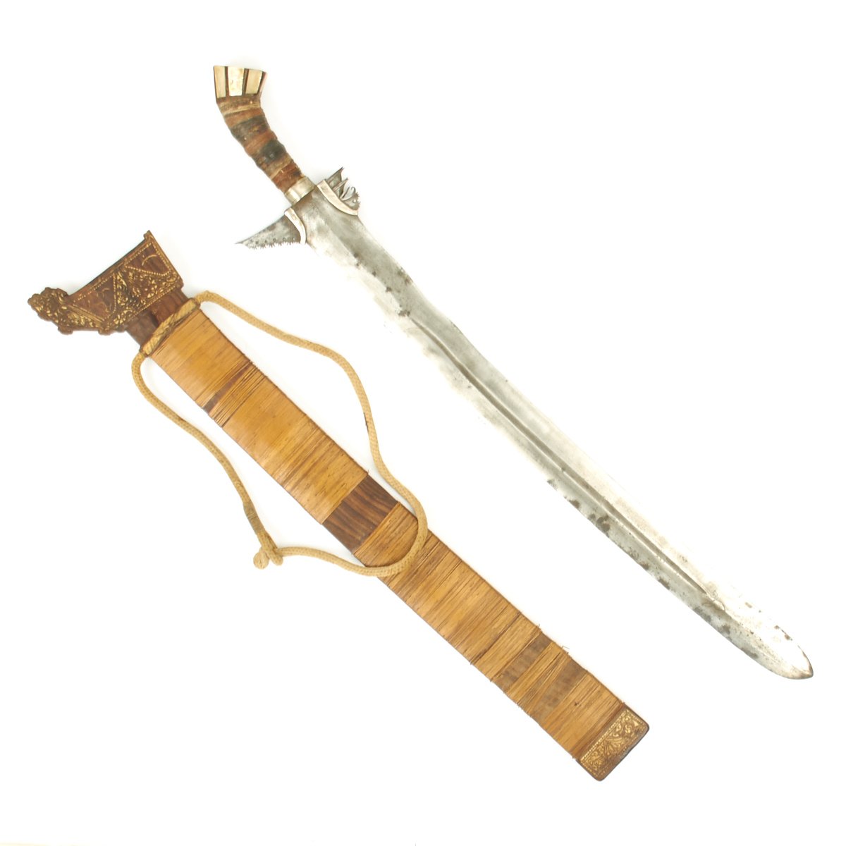 This short sword is made in the traditional Kris (Kalis) style and form with scabbard. The basic design is the same throughout the area, but only in the Philippine Islands did it evolve into a sword. This example dates to the 1880/1895 period, and has a 24" slightly wavy double edged blade. It is almost 2" wide at its widest point, with a single central fuller running down each side. The grip is bound in cord and the off-set pommel is decorated with Mother of Pearl sections. It comes contained in it's original wood scabbard nicely bound with bamboo. See Stone's "Glossary " page 390 to see various styles of these Philippine Moro Swords. From that reference this particular sword may have originated in MINDANAO.