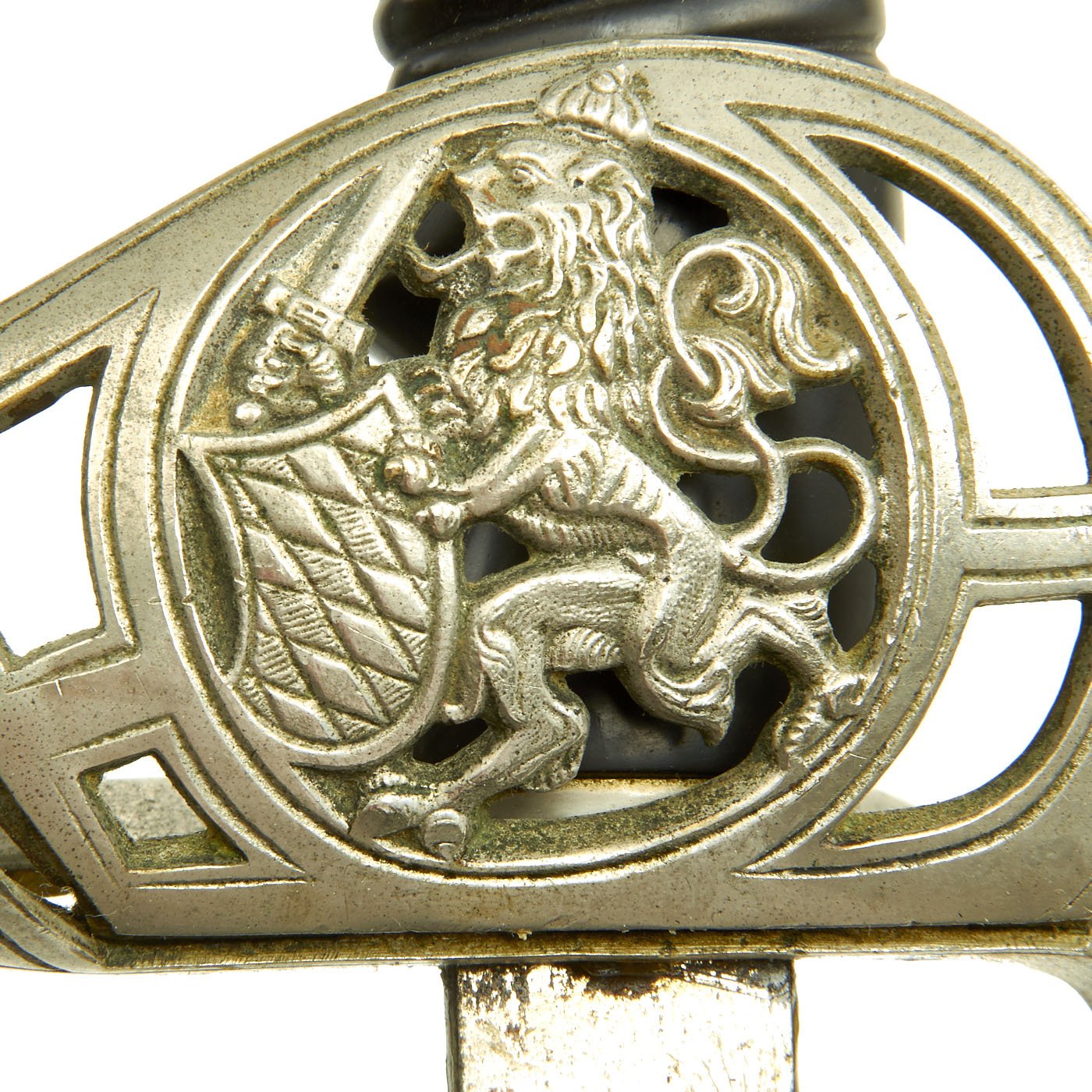 - One German Empire period Bavarian Nickel-Plated Dress sword, with a decorative fold-away guard and "gutta percha" composite handle. The guard bears the coat of arms of the Kingdom of Bavaria. No markings we can see except for M on the ricasso. Blade length is 32 1/2" with an overall length of 38".