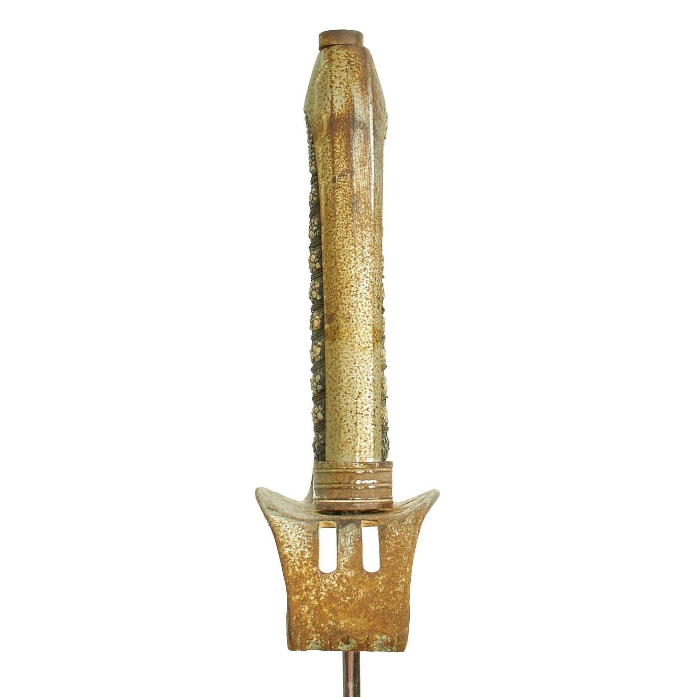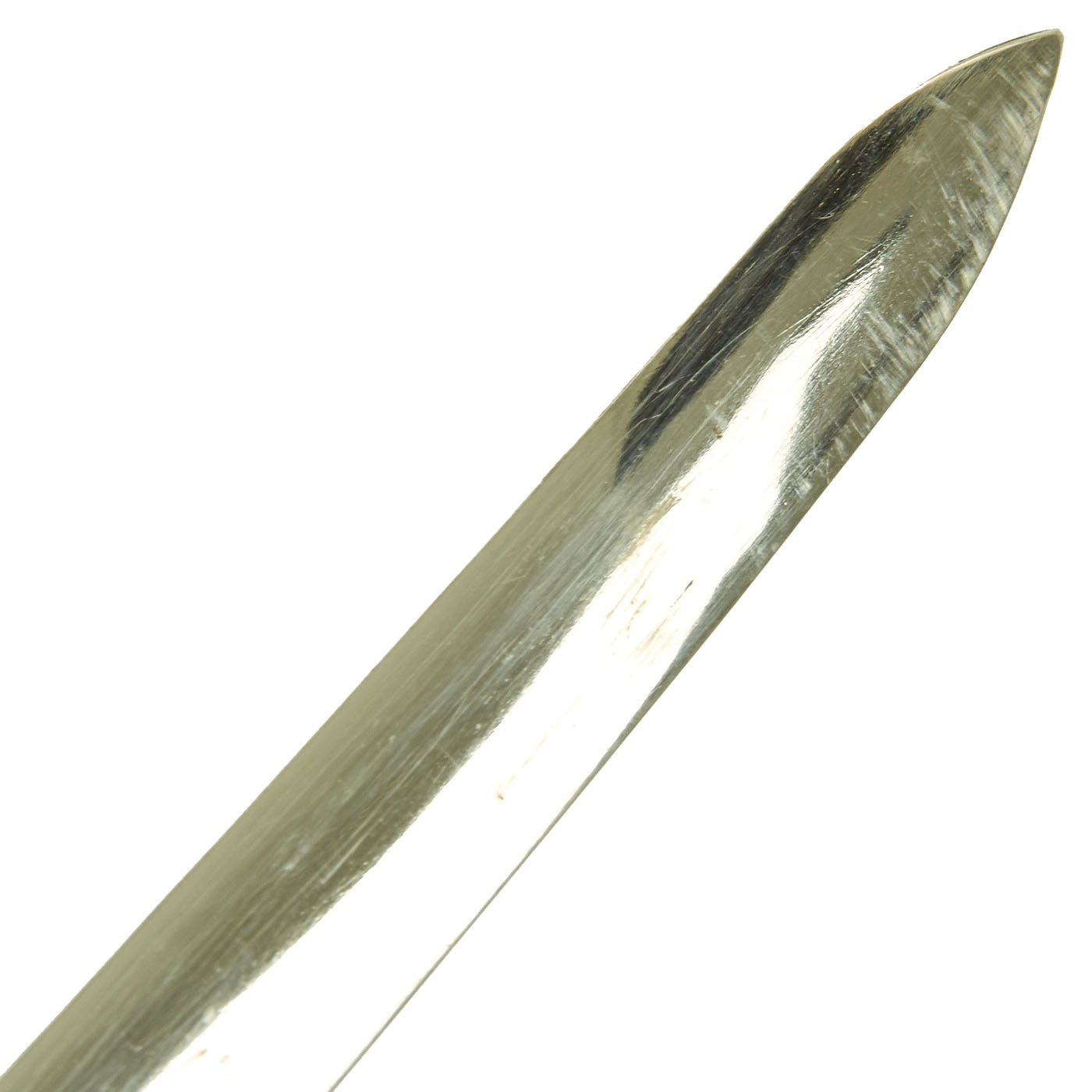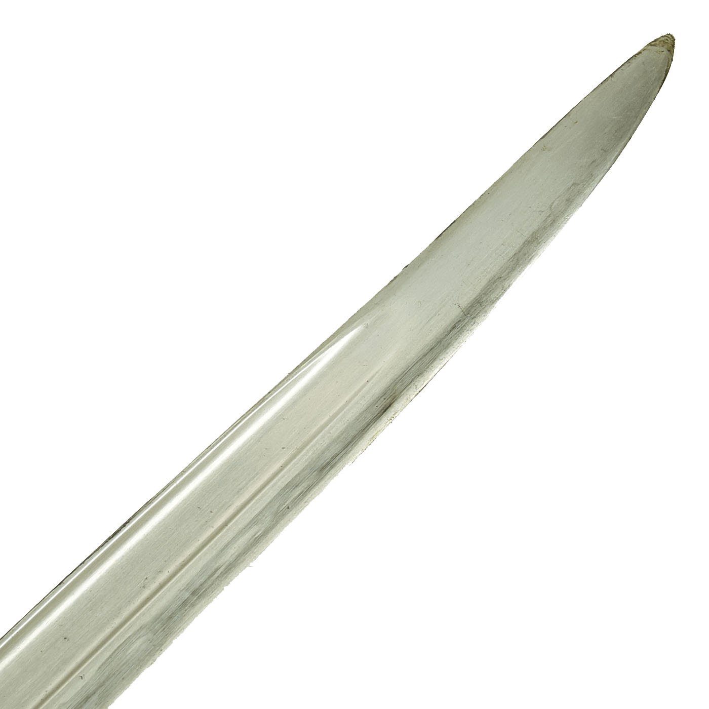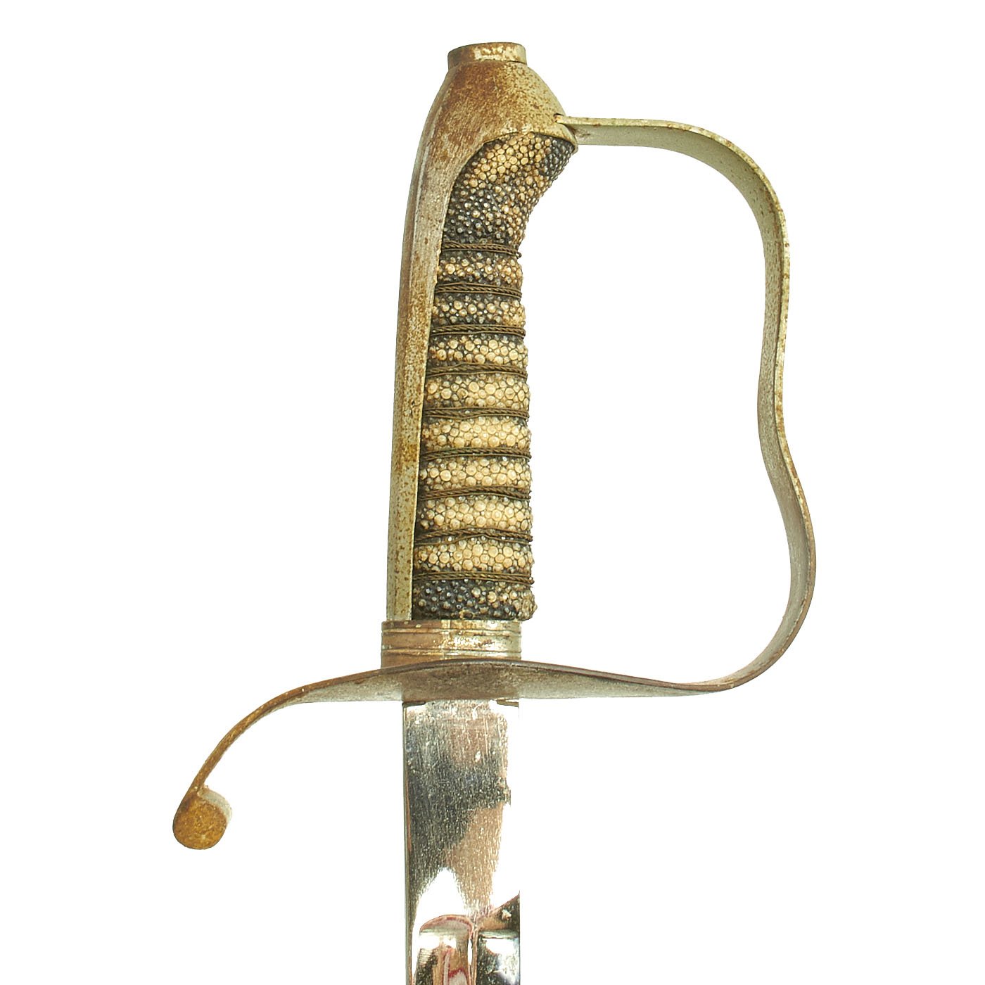- One European Continental Nickel-Plated Dress sword, with a simple guard and a ray skin covered wire-wrapped handle. Possibly made for the South American Export market. No markings we can see. Blade length is 28 3/4" with an overall length of 34 1/2". Comes with steel scabbard.