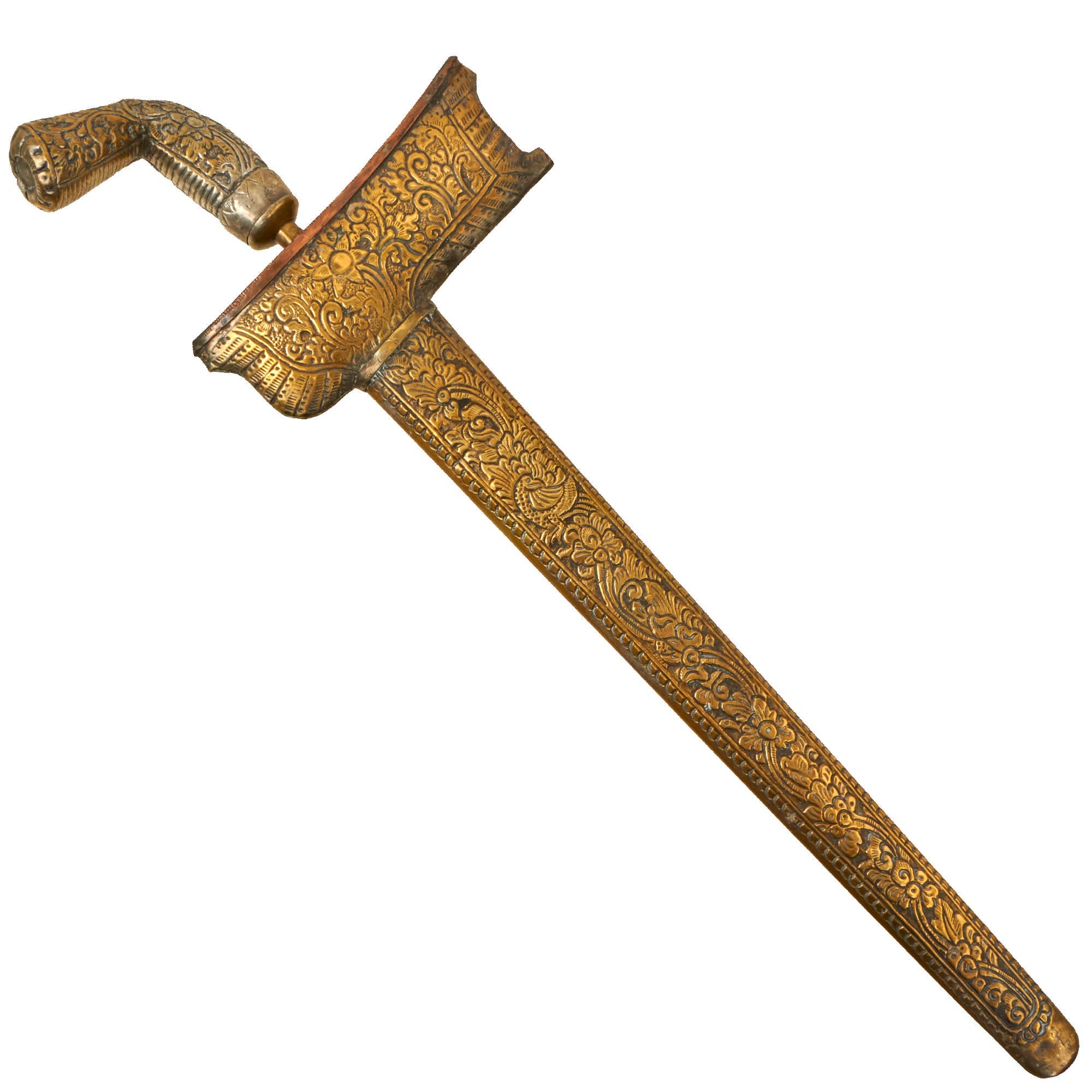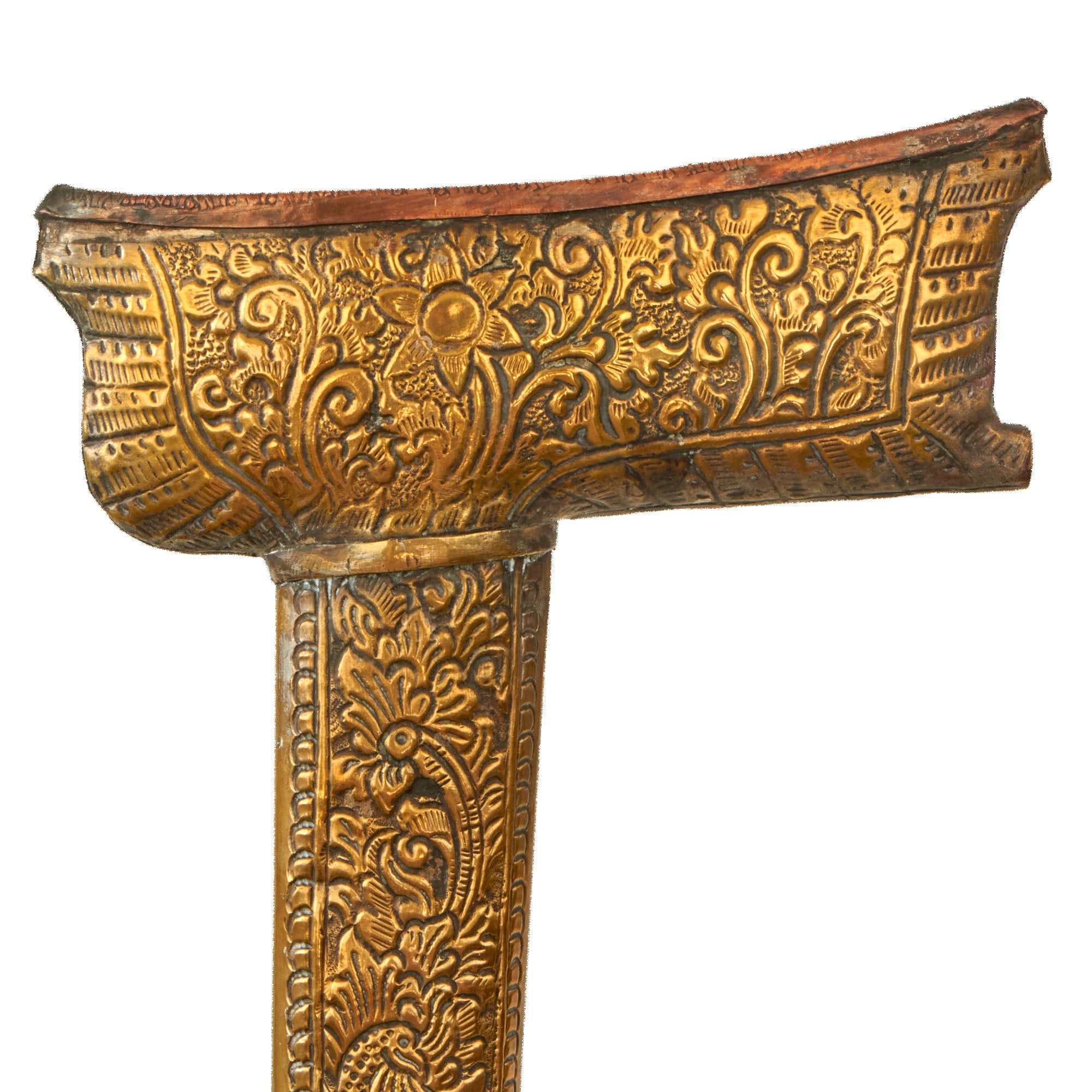 The kris comes complete with a very ornately carved brass-clad wooden scabbard. The throat of the scabbard has a masterfully carved motif.