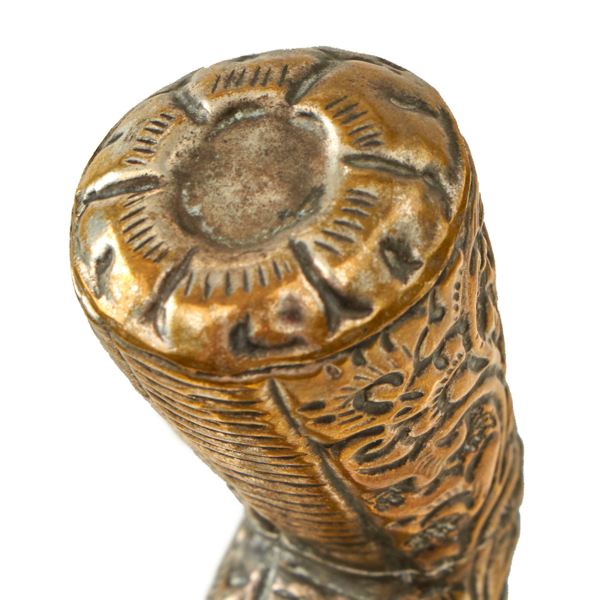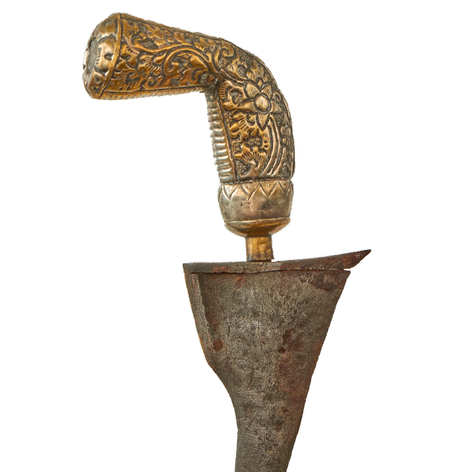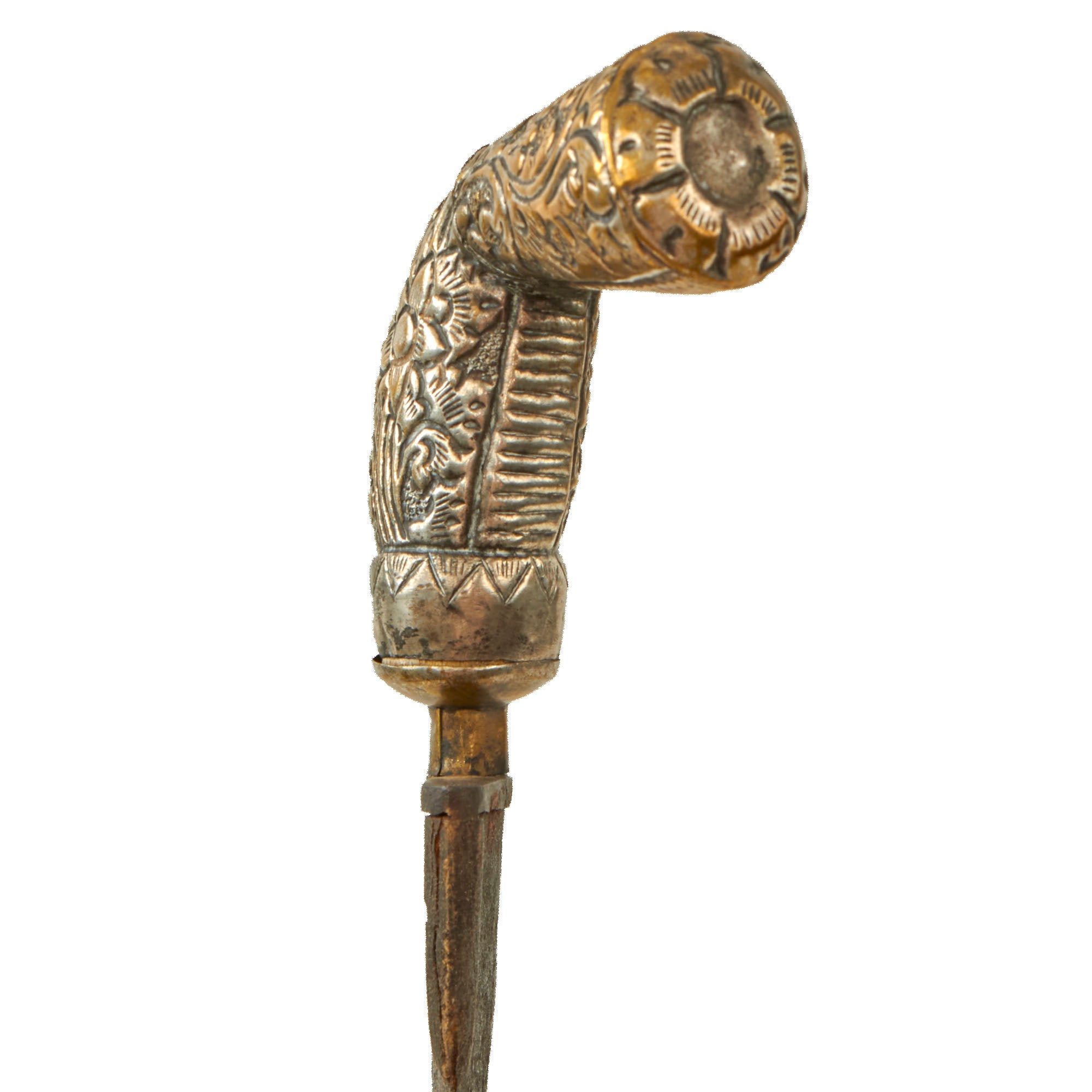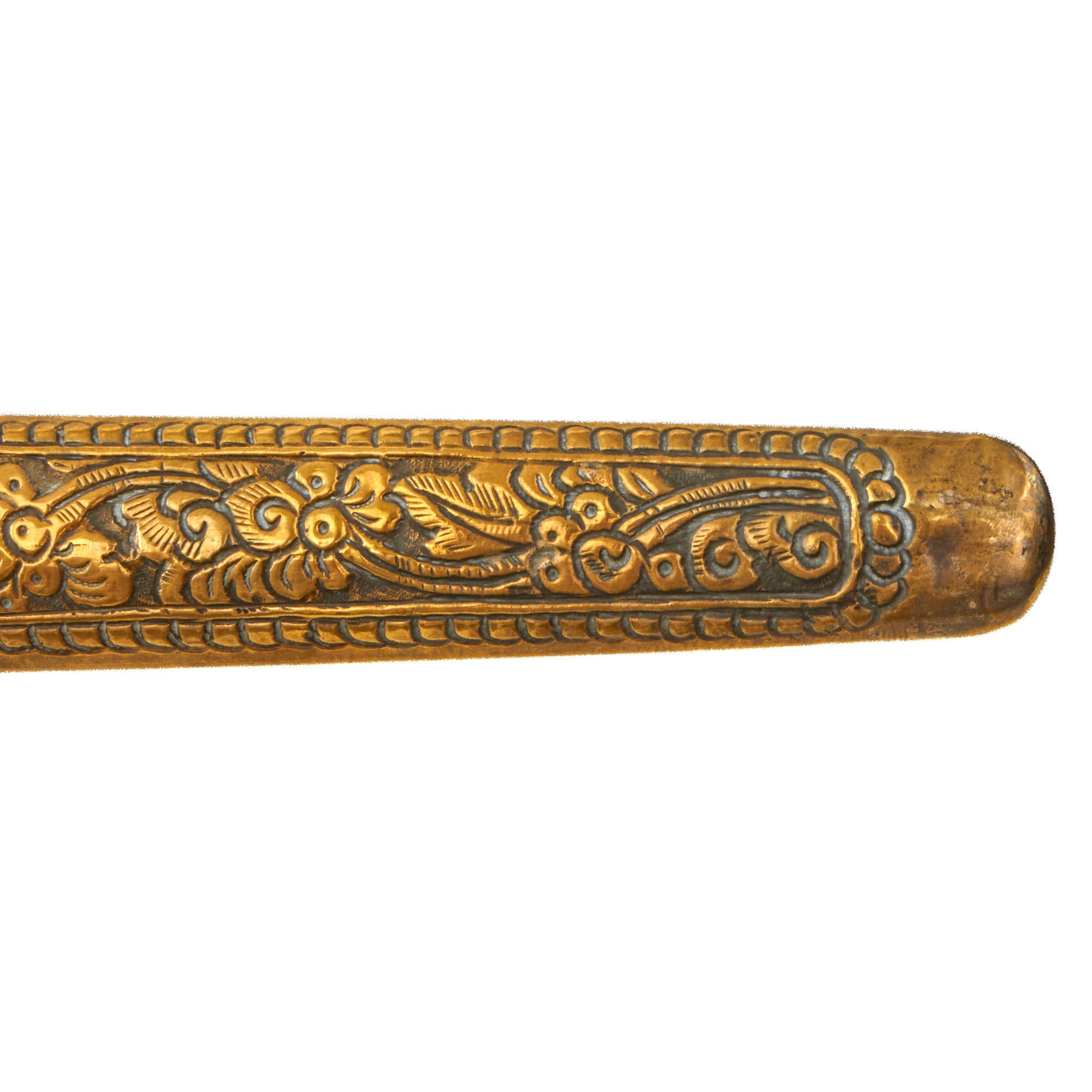 The blade is mounted in an ornate brass-clad hilt with a silver wash and lovely etching. The handle is a floral design with heavy wear overall.