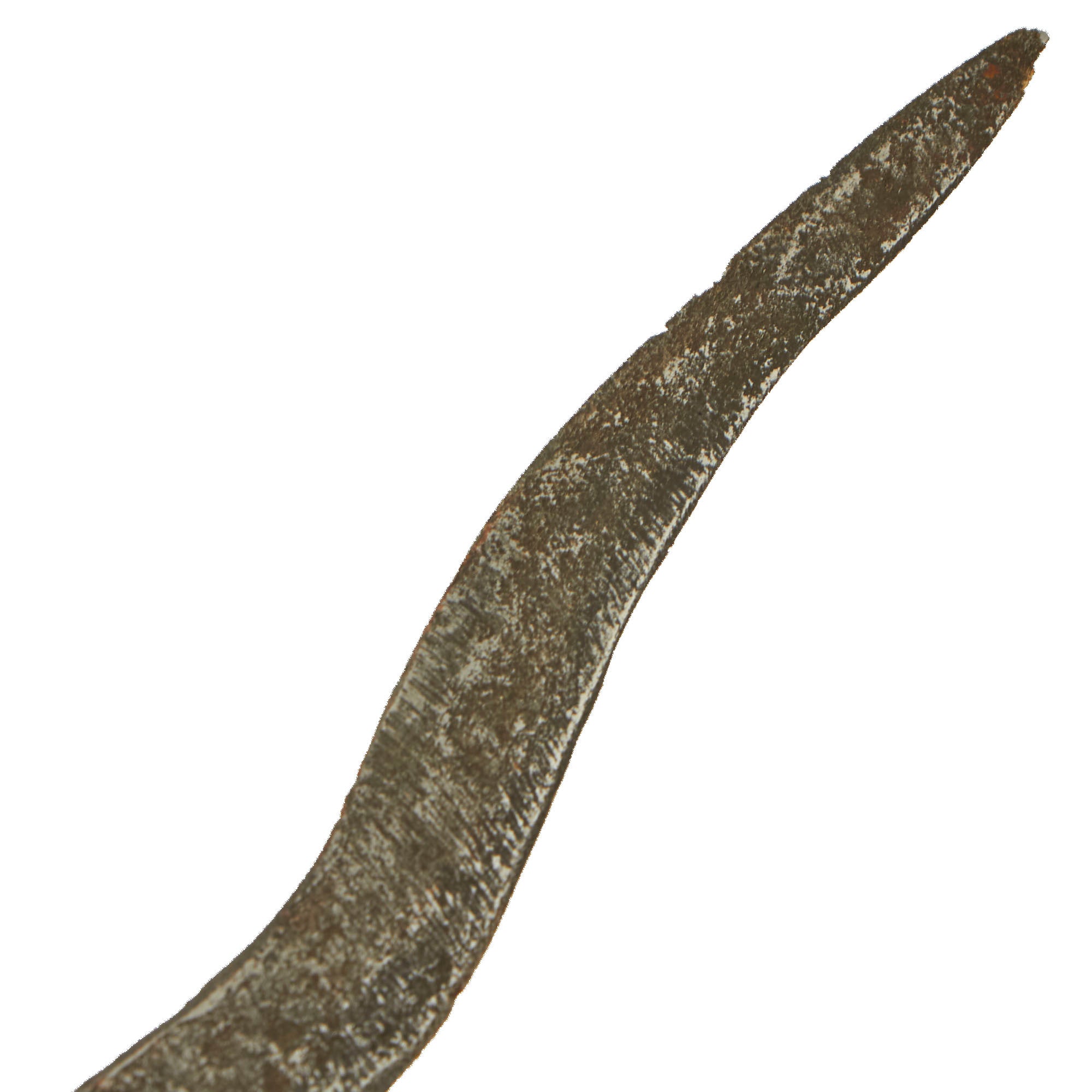 This example dating from the mid to late 19th century has a 12 ½” blade on this example (16 1/4 inches overall) is made from high nickel content iron, often found in meteorite iron, giving a unique finish known as "pamor". The iron was crucible forged, much like wootz steel, giving it a lovely laminated appearance on the straight blade. Kris daggers with this highly "wavy" curved ;blade are typical for the island of Sumatra.
