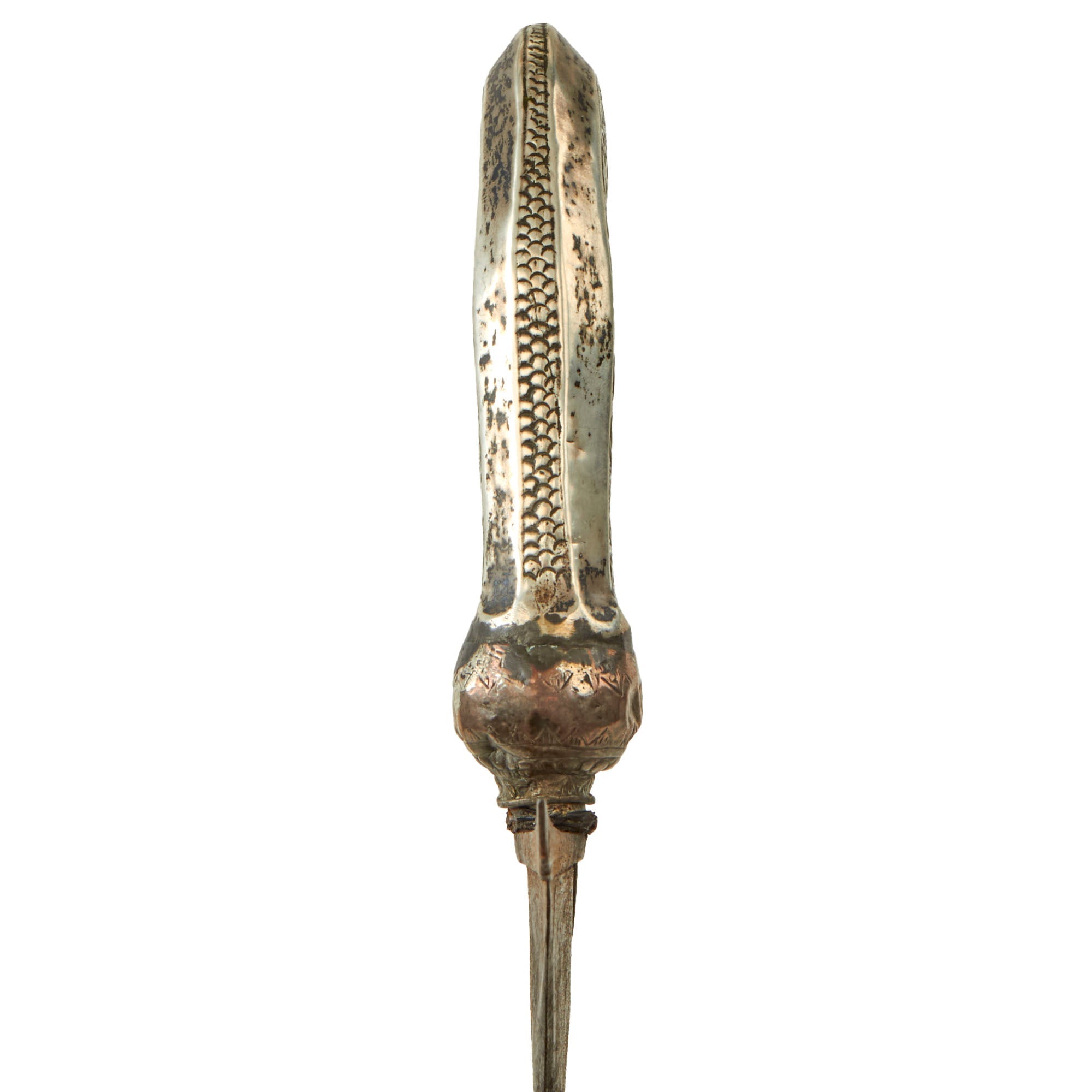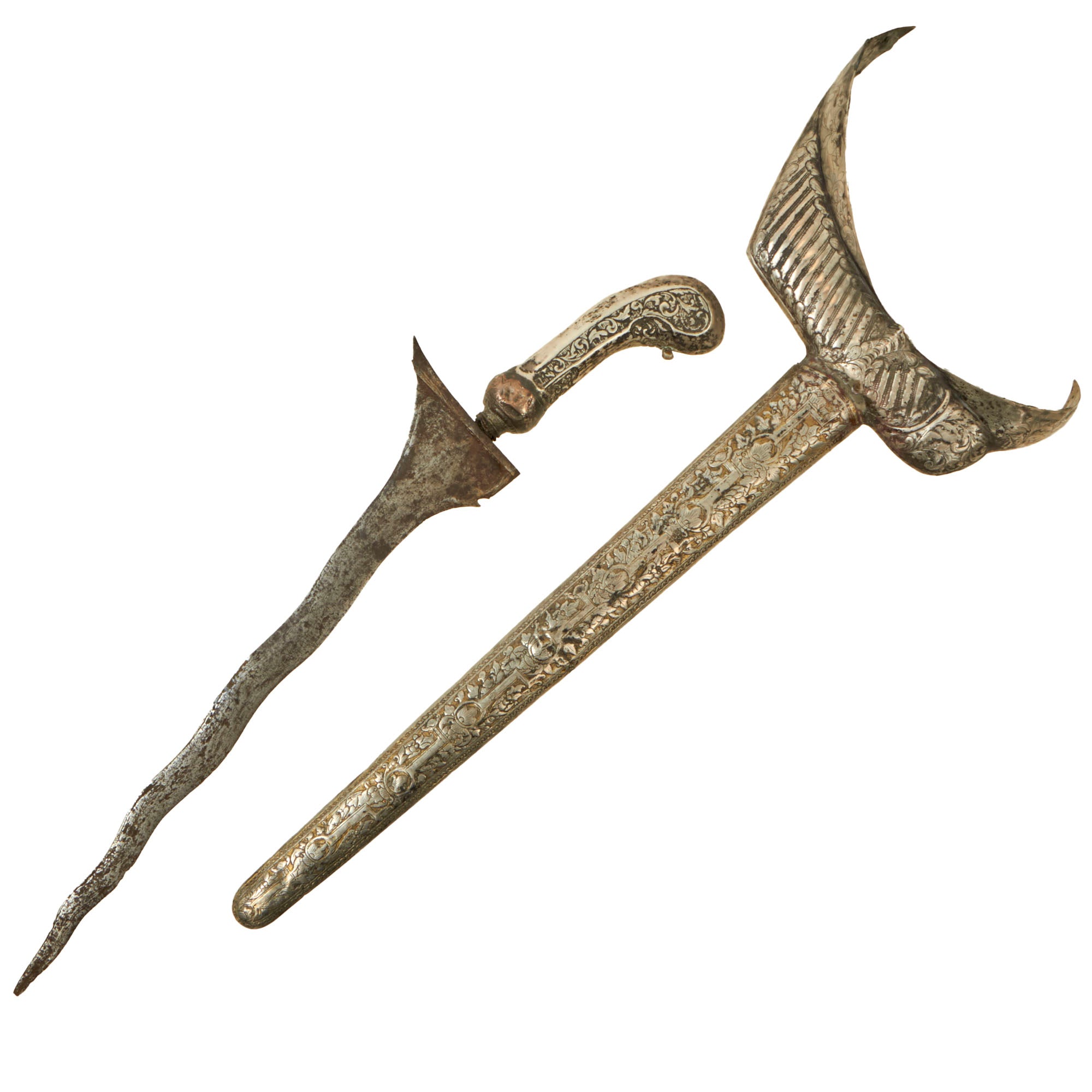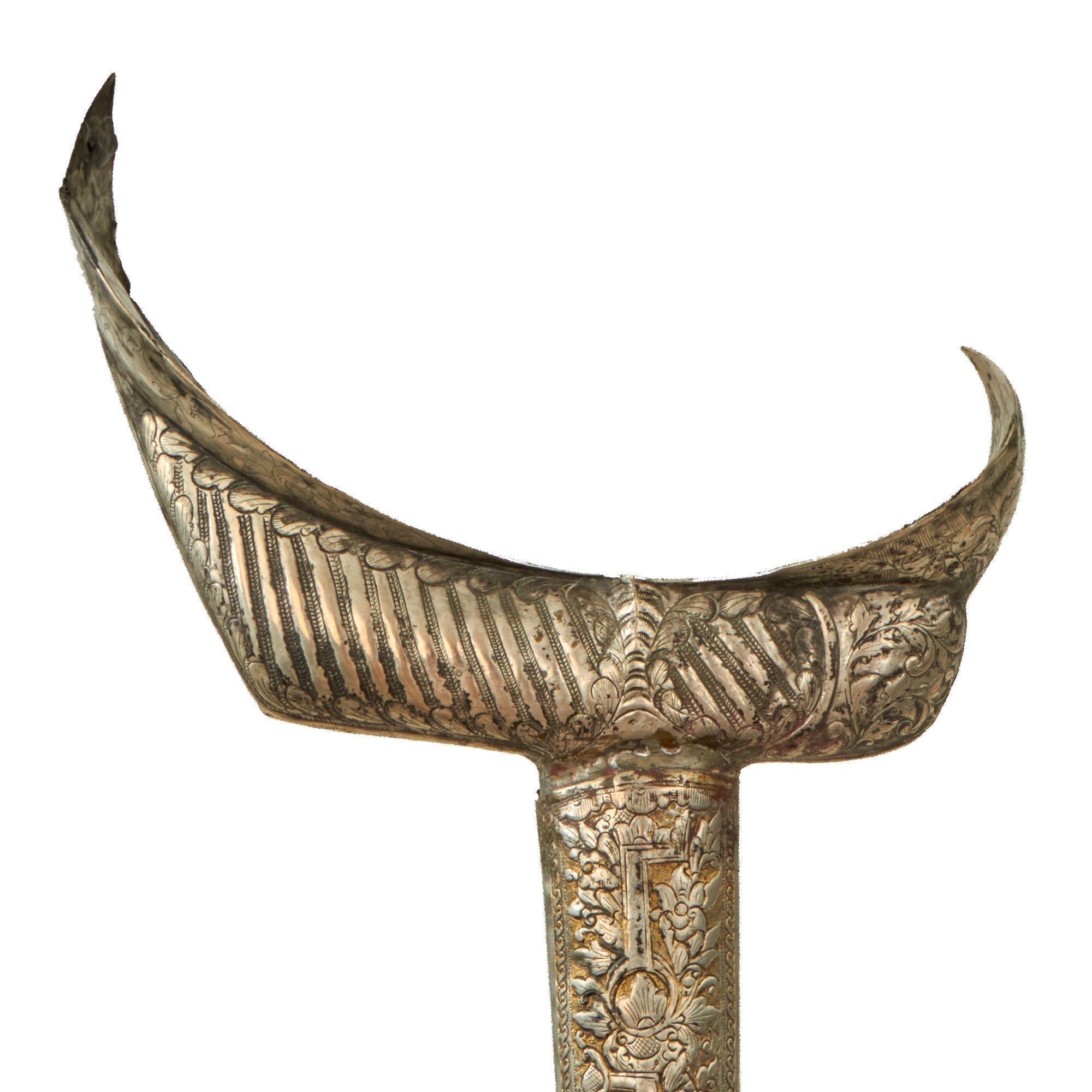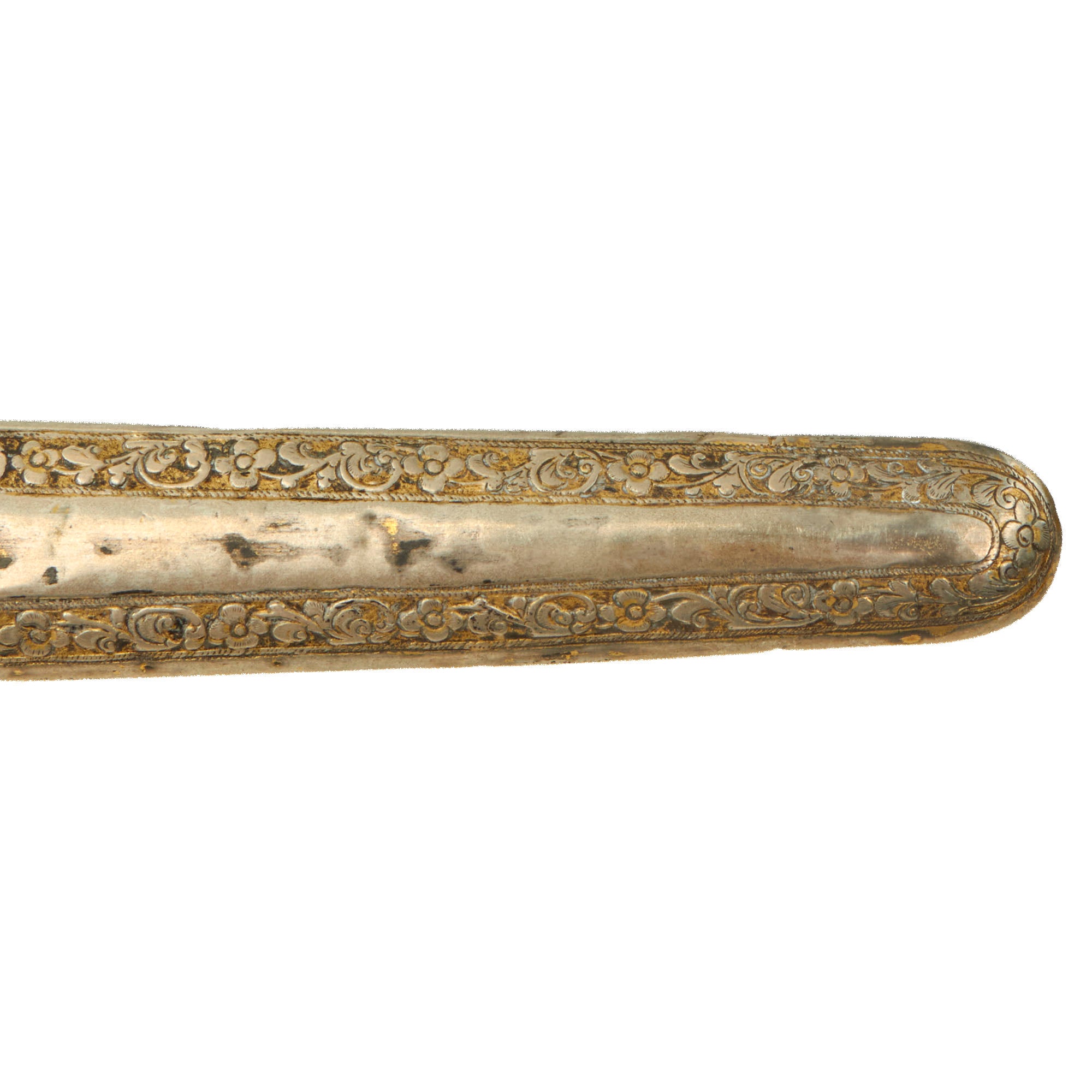 The kris comes complete with a very ornately carved silver-clad wooden scabbard. The throat of the scabbard has a masterfully carved motif.