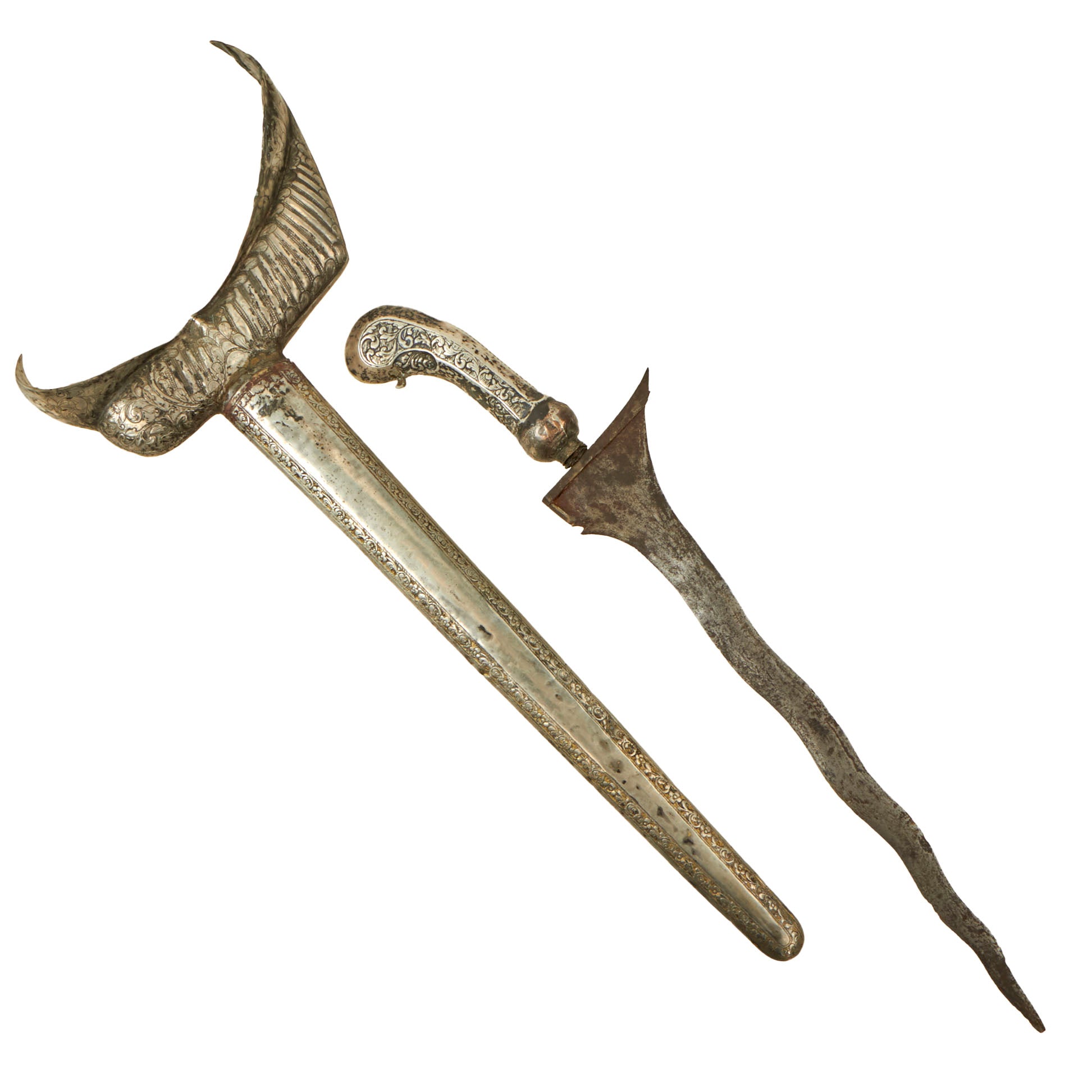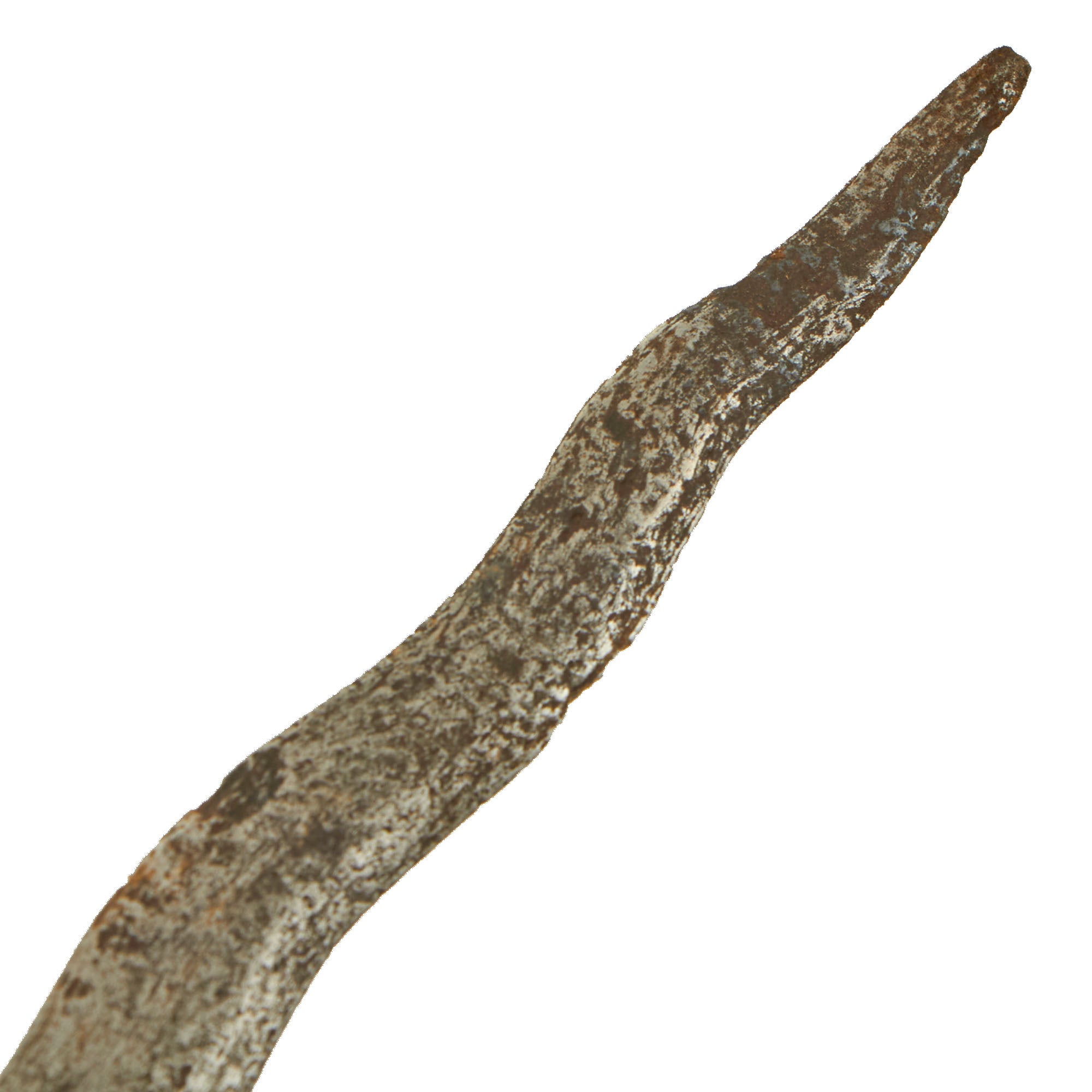 This example dating from the mid to late 19th century has an 11 ½” blade on this example (16 inches overall) is made from high nickel content iron, often found in meteorite iron, giving a unique finish known as "pamor". The iron was crucible forged, much like wootz steel, giving it a lovely laminated appearance on the straight blade. Kris daggers with this highly "wavy" curved blade are typical for the island of Sumatra.