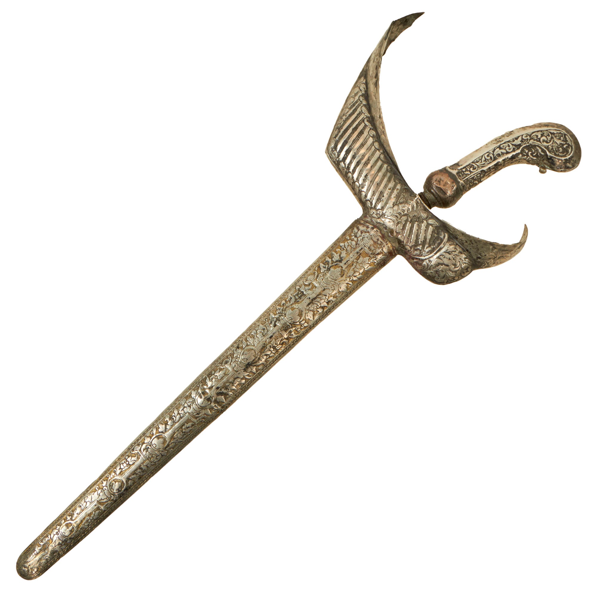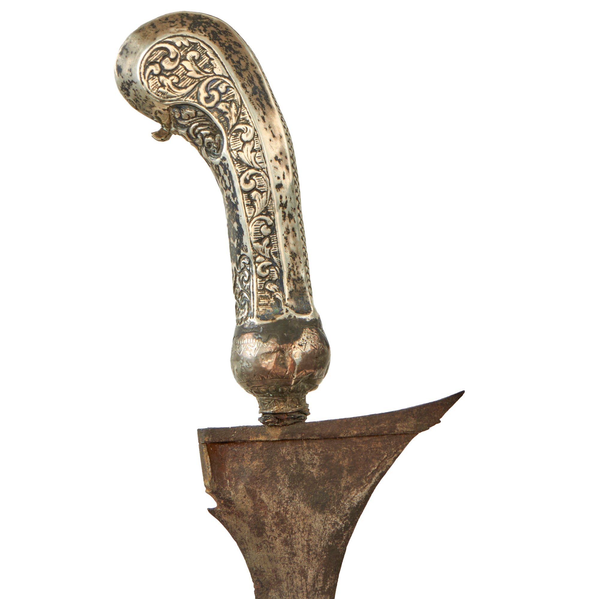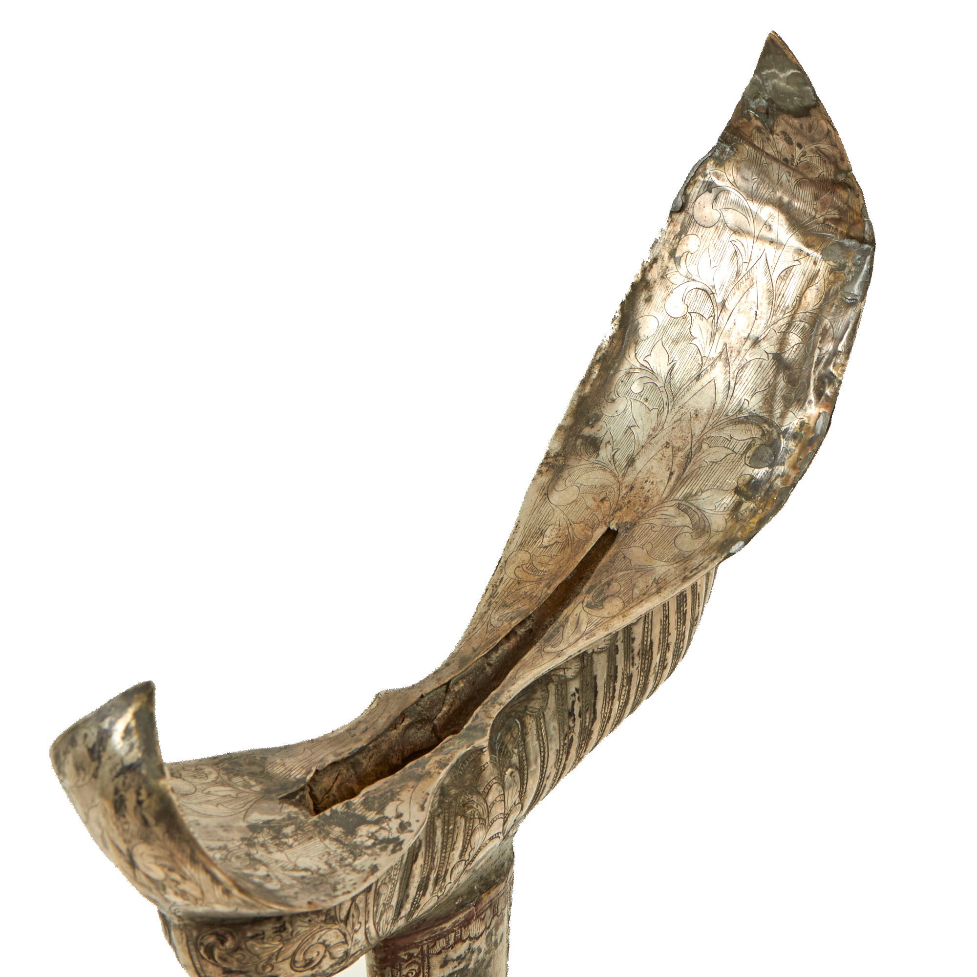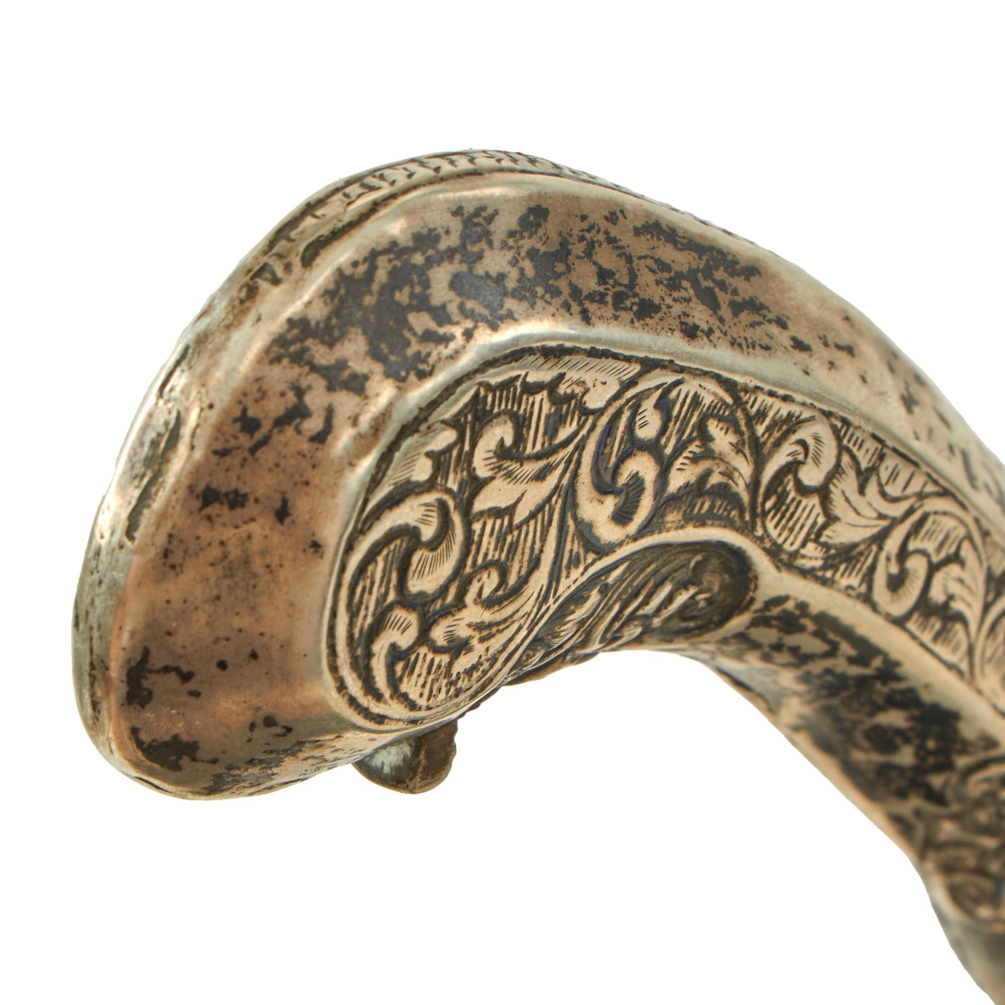 The blade is mounted in an ornate silver-clad hilt with lovely etching. The handle is a floral design with heavy wear overall.