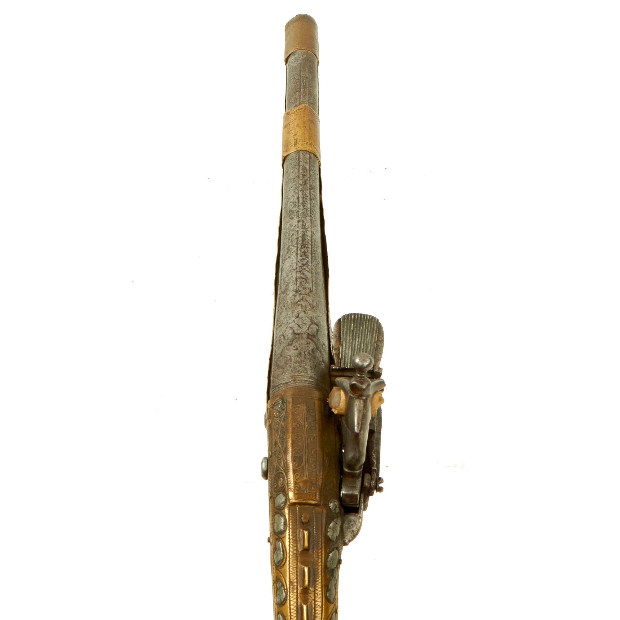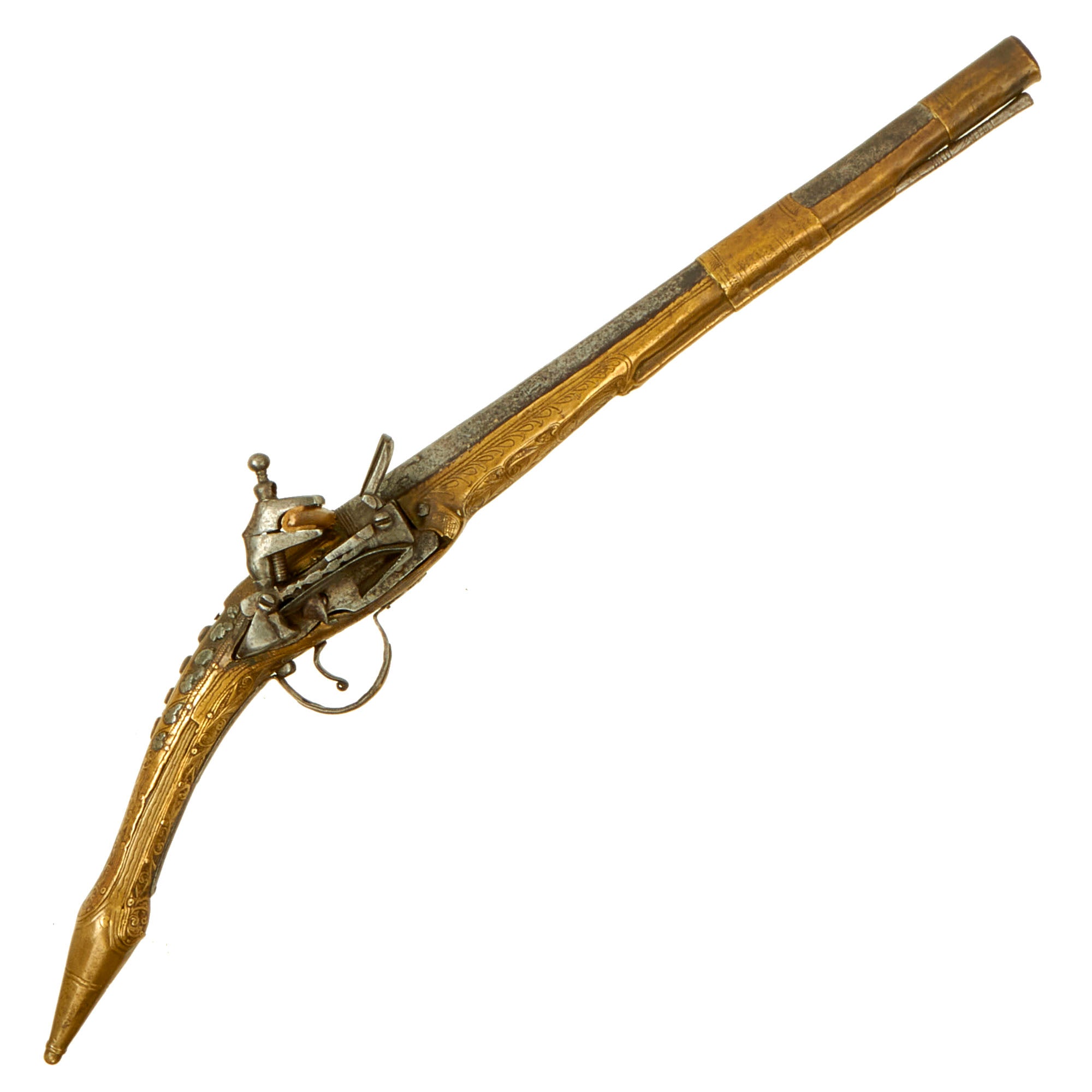Original Item: Only One Available. These were often referred to as Miquelet "Rat Tail" Pistols because of the shape of the stock. These were the traditional muzzle loading pistol of the Balkans and Greece in the early to mid 1800s. Designed to be worn in a sash around one's waist, the weapon is very streamlined in appearance. The stock on this example is almost entirely clad in lovely embossed and engraved sheet brass. The Miquelet ignition system is a hangover from High Quality Italian pistols of the 17th and early 18th centuries.