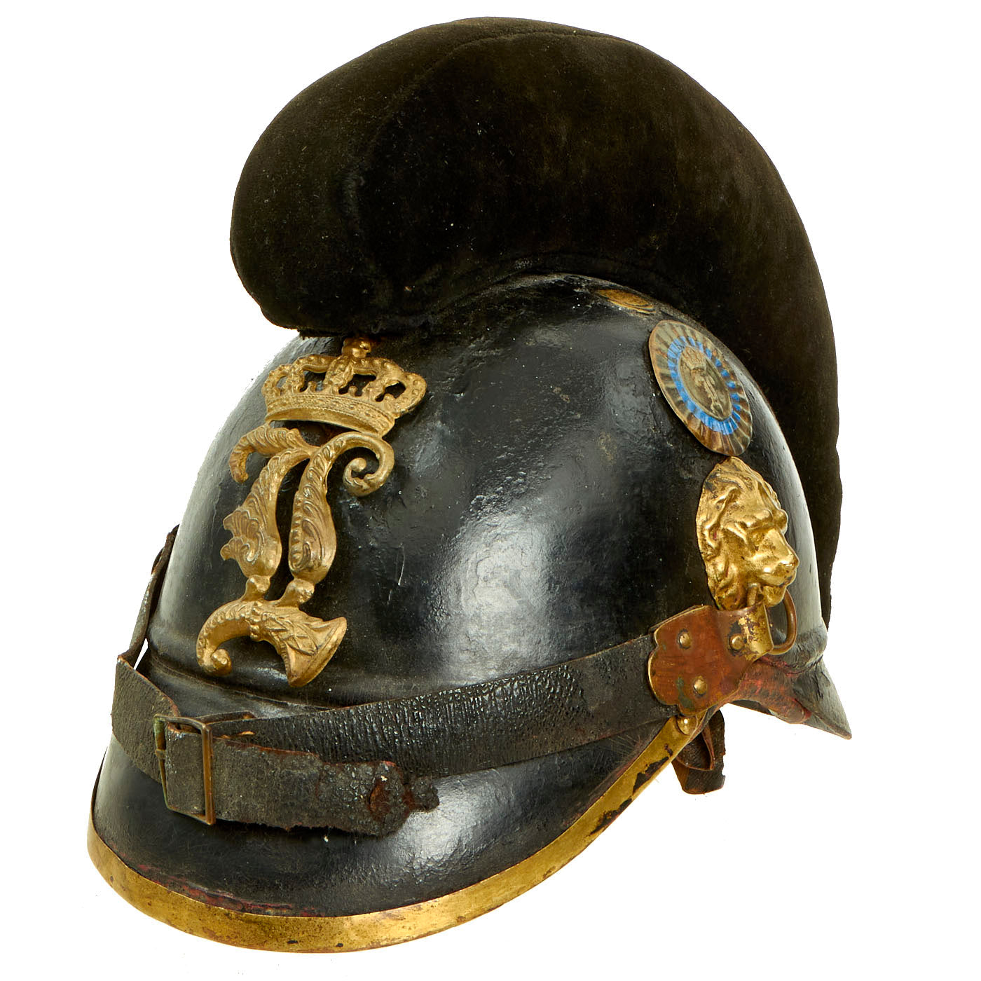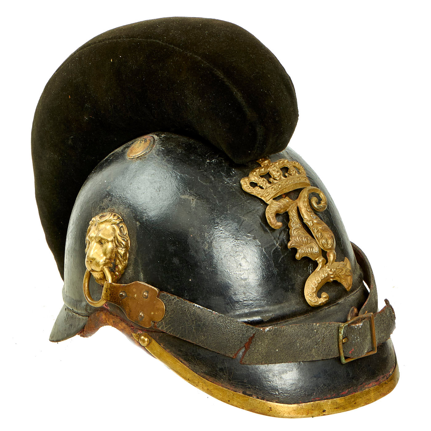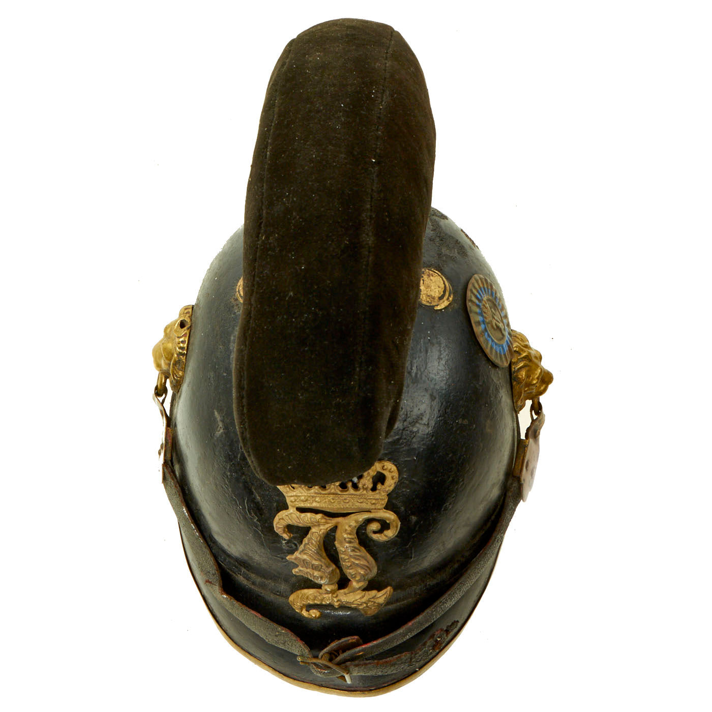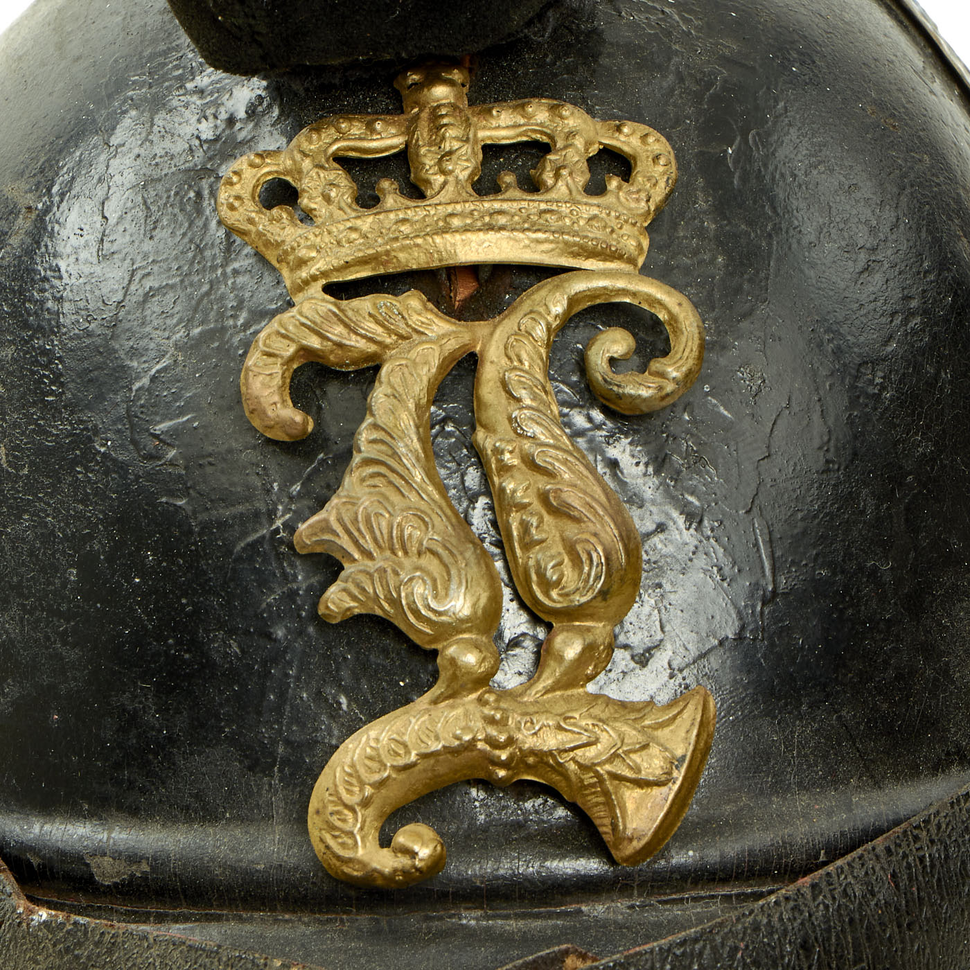 Original Item: Only One Available. The distinctive Bayern (Bavaria) Raupenhelme (Caterpillar helmet) can be traced back to 1800 when the "Kasket Muster 1800" was introduced. The Raupenhelme had a leather body with a large wool or hair comb on the top and was worn by all ranks from 1800 to 1886 undergoing numerous modifications. After that, Bavaria fell into line with the rest of the German Empire, and adopted its own version of the pickelhaube. This fine example of a Raupenhelme is a cavalry version, and bears the Royal Monogram of King Ludwig II.