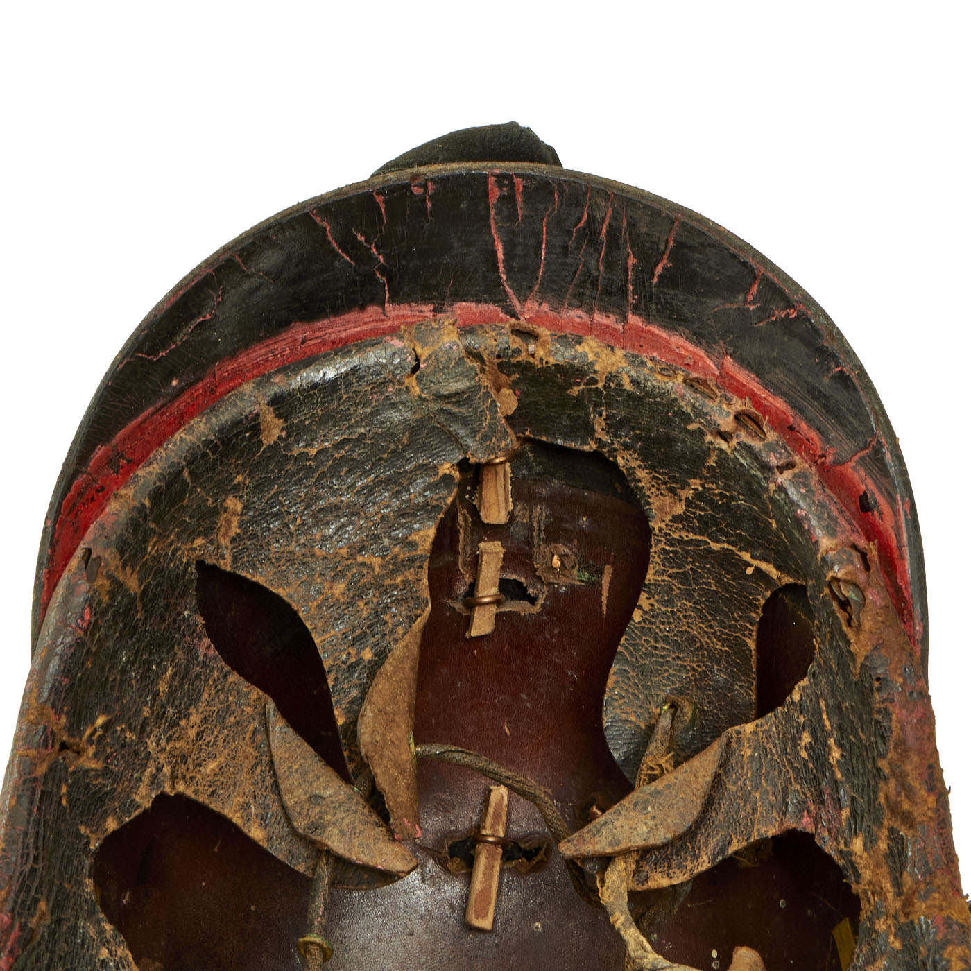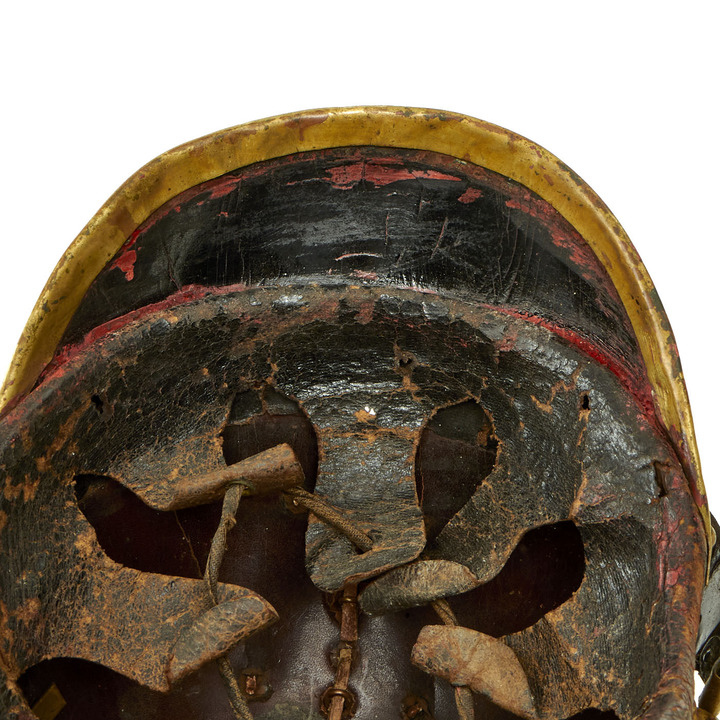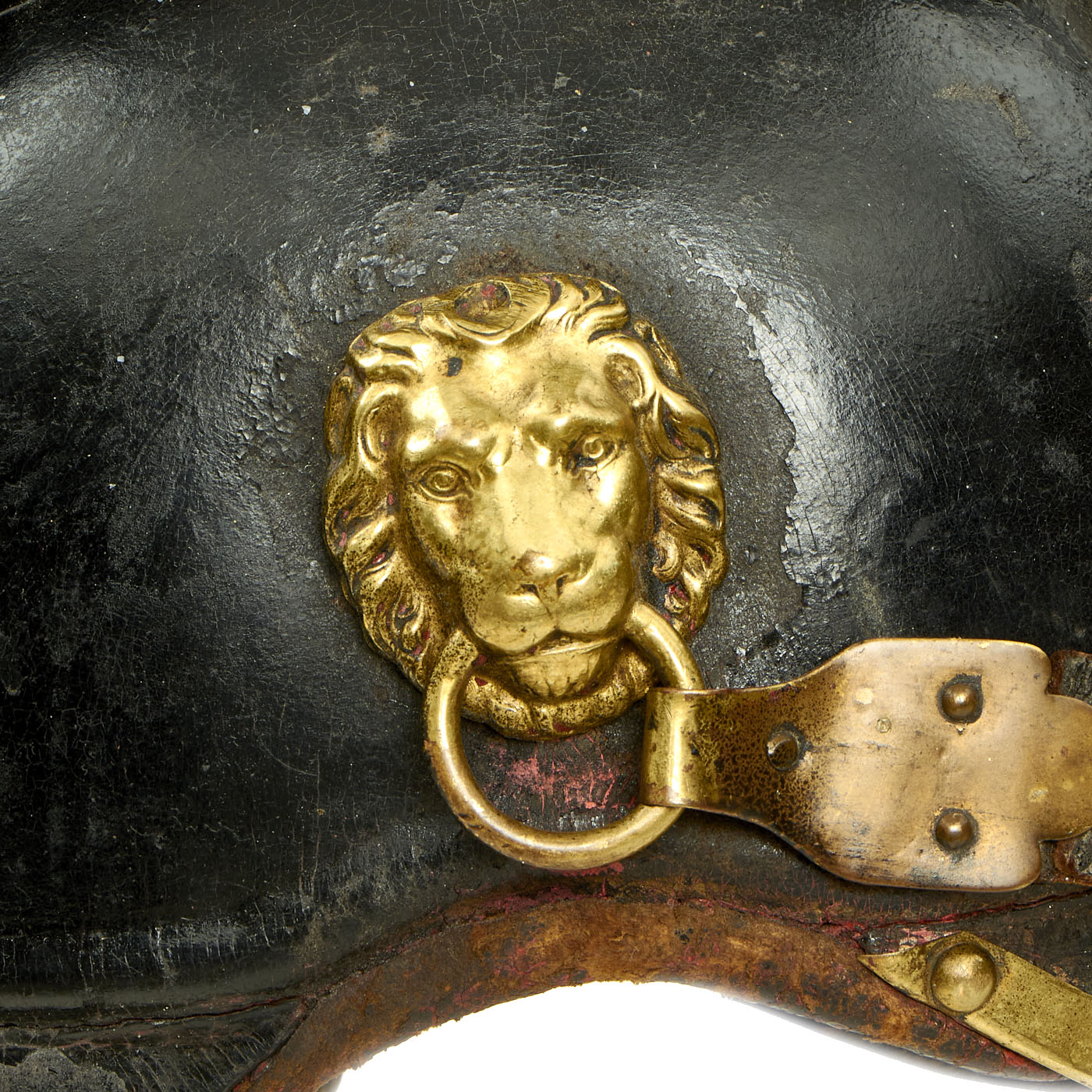 The leather chin strap is in good shape but does have a lot of cracking in the finish, and clips to two Lion's Head fittings on the side. Above the Lion on the left side the helmet still has the original Bavarian blue brass Kokarde without plume.