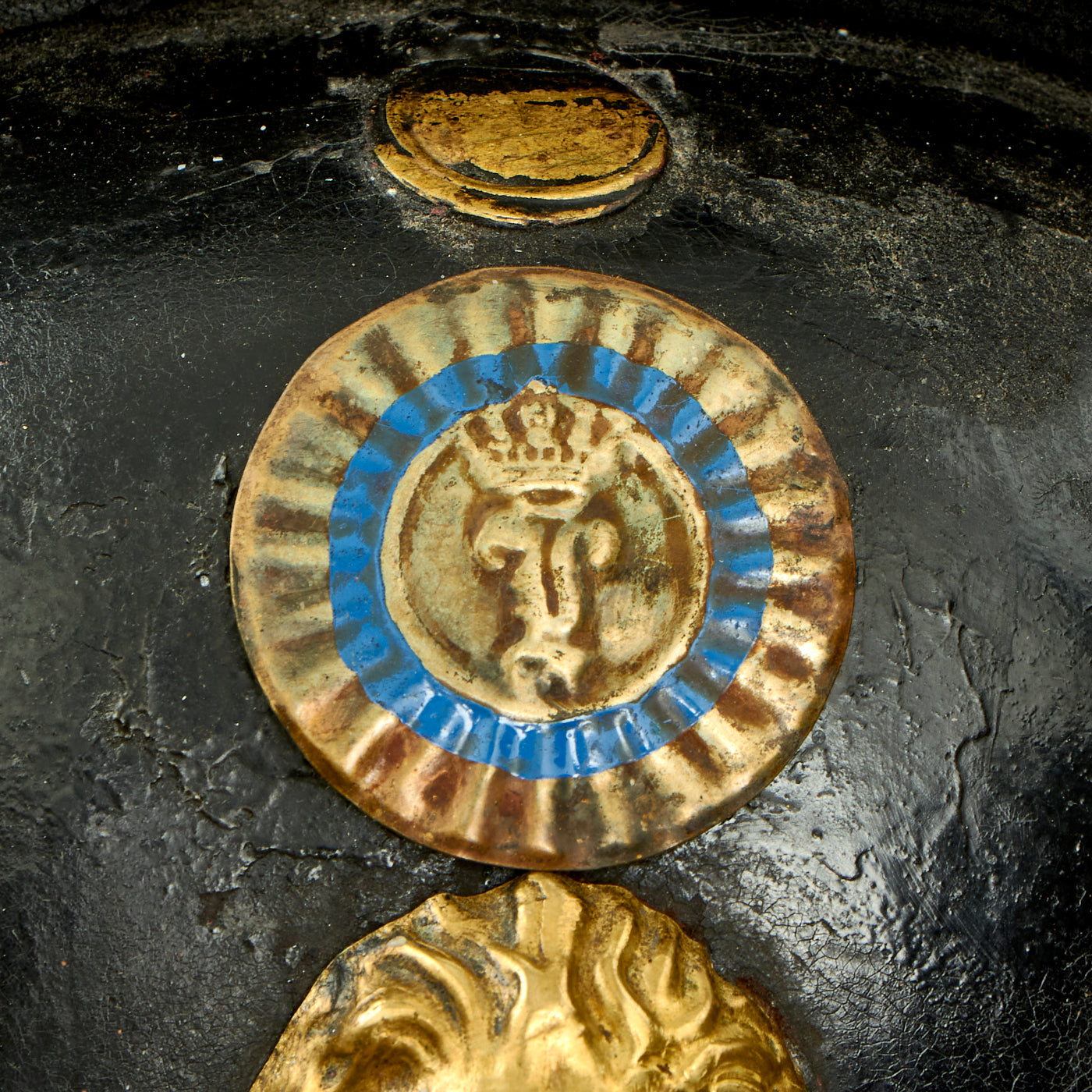 Here we have a King Ludwig II Cavalry Helmet of black leather with gilt brass fittings.