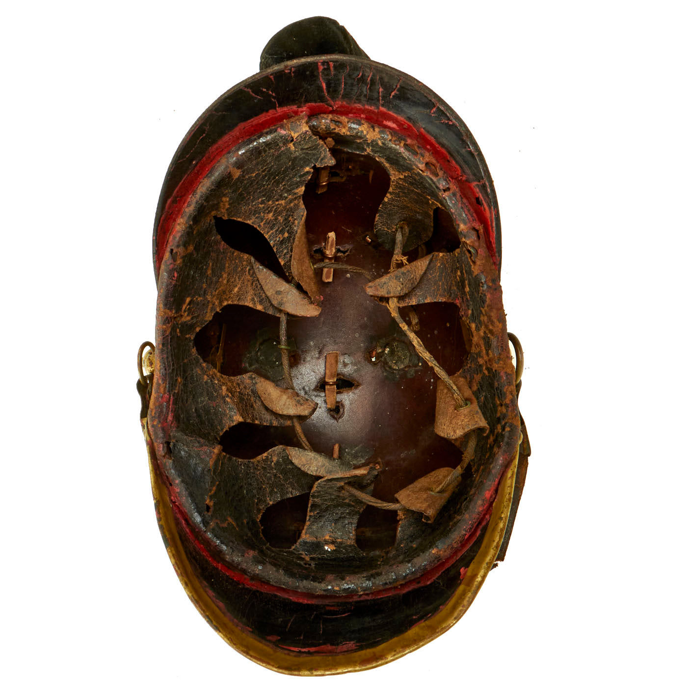 The helmet still retains its enlisted style black leather multi-panel liner in very worn condition.. It still has the lovely black wool "Caterpillar" type wool comb on top, unique to the Raupenhelme, though it does show some wear, and has faded from black to a light brown color in areas, which is very common.