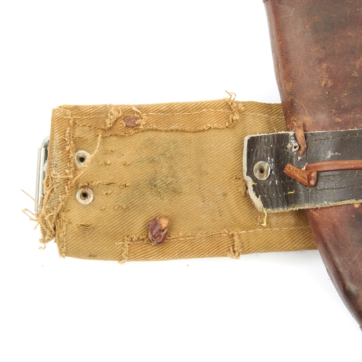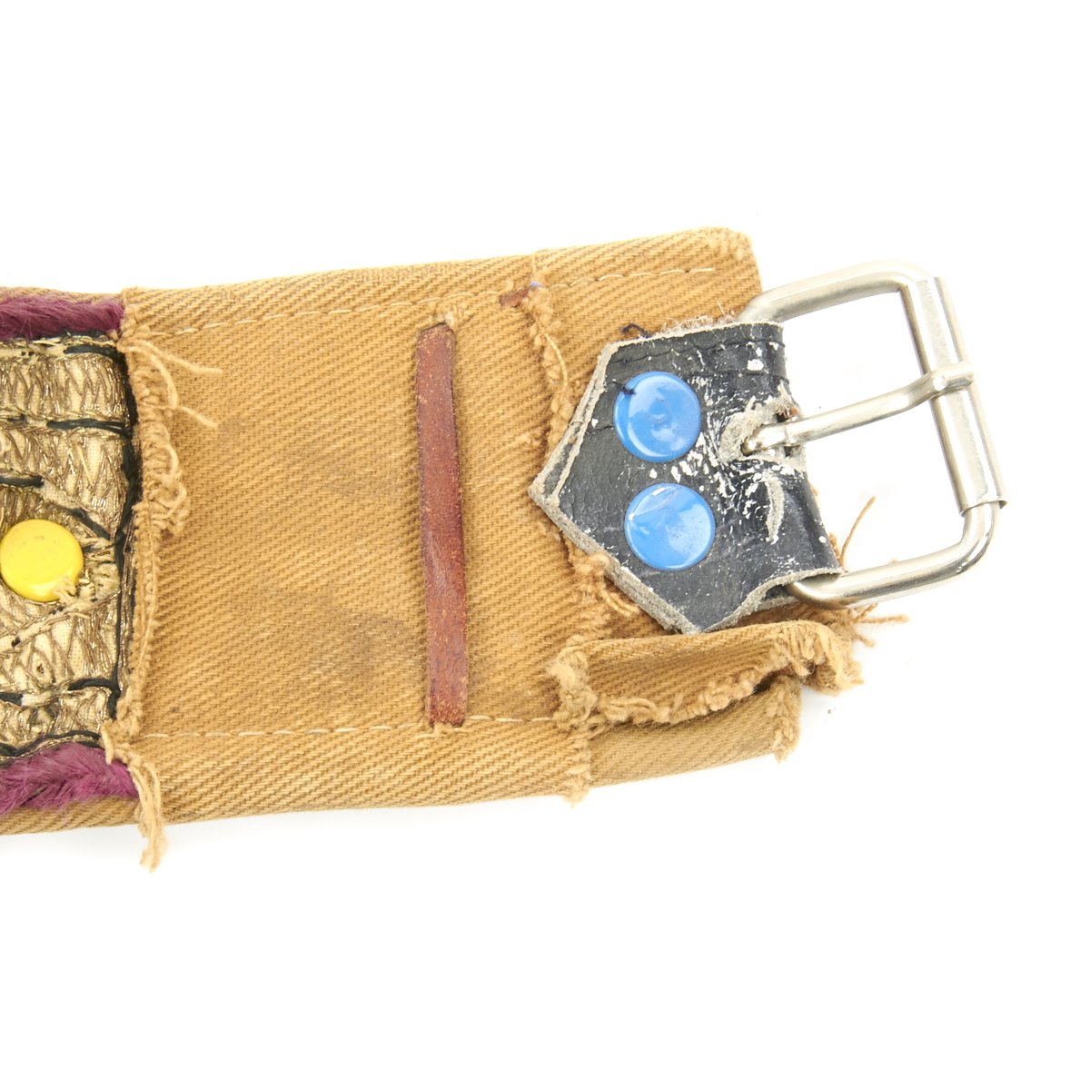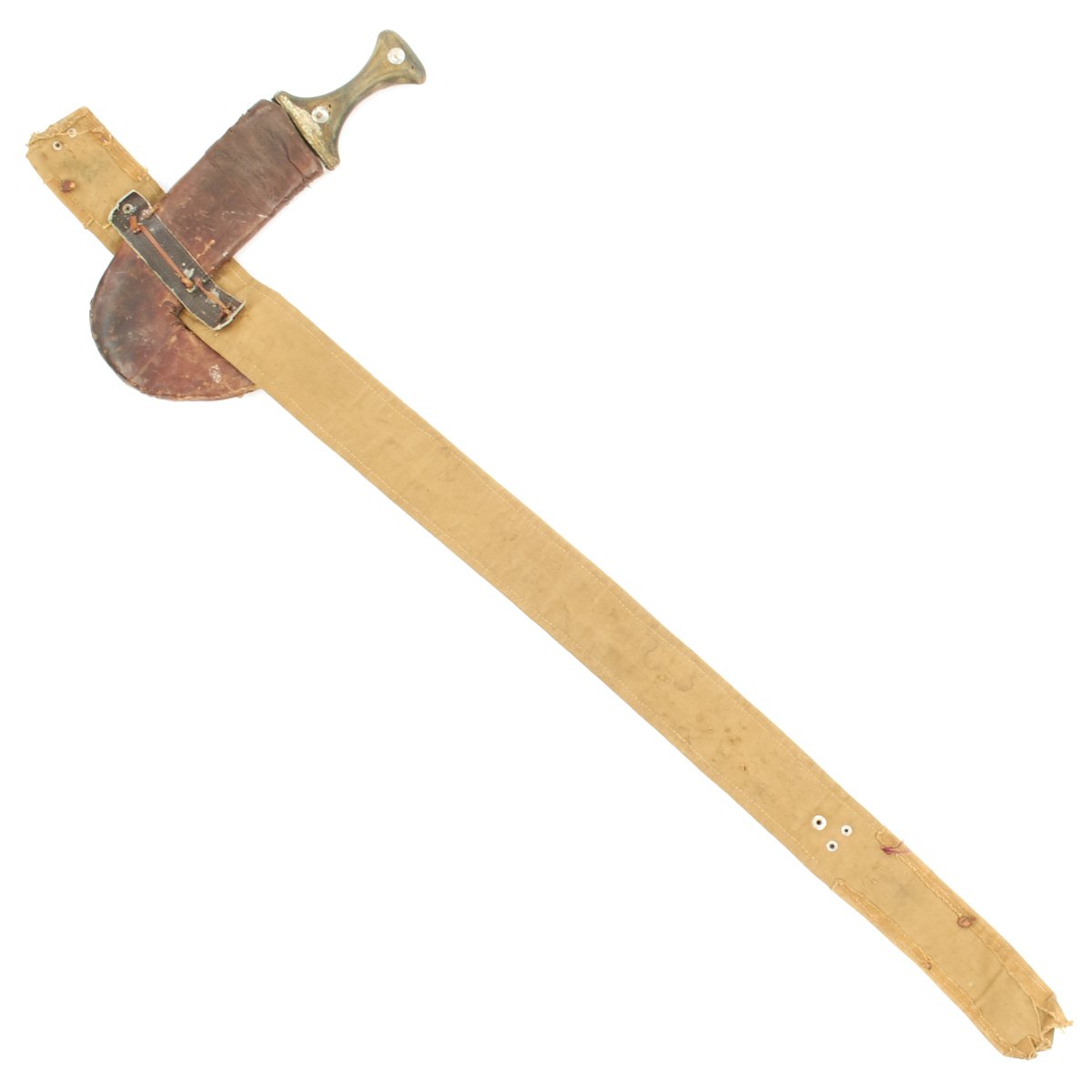 This example, which is extremely clean, still has its scabbard of leather covered wood, together with its embroidered waist belt. The belt shows some later repairs, having been fitted with a modern belt buckle and adjustment belt, which are designed to be hidden behind the original material. Overall length of the belt is about 40 inches, and it looks like it would be adjustable from 38 to 33 inches with fastened.