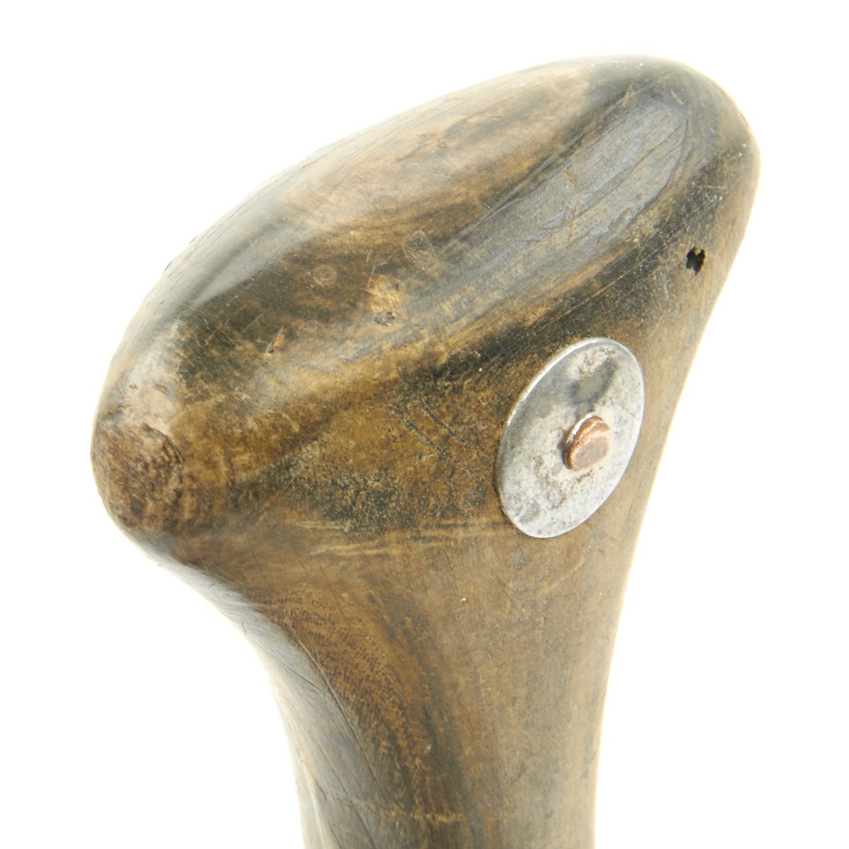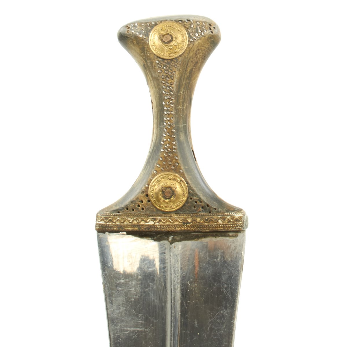 The curved bright polished steel blade with central raised rib is over 8 1/2" in length, and the dagger is 12 1/2" in length overall. The Hilt is horn and decorated with silver and brass pins. The horn of the grip could possibly be Rhino horn, highly prized at the time, though there is no way to verify this.