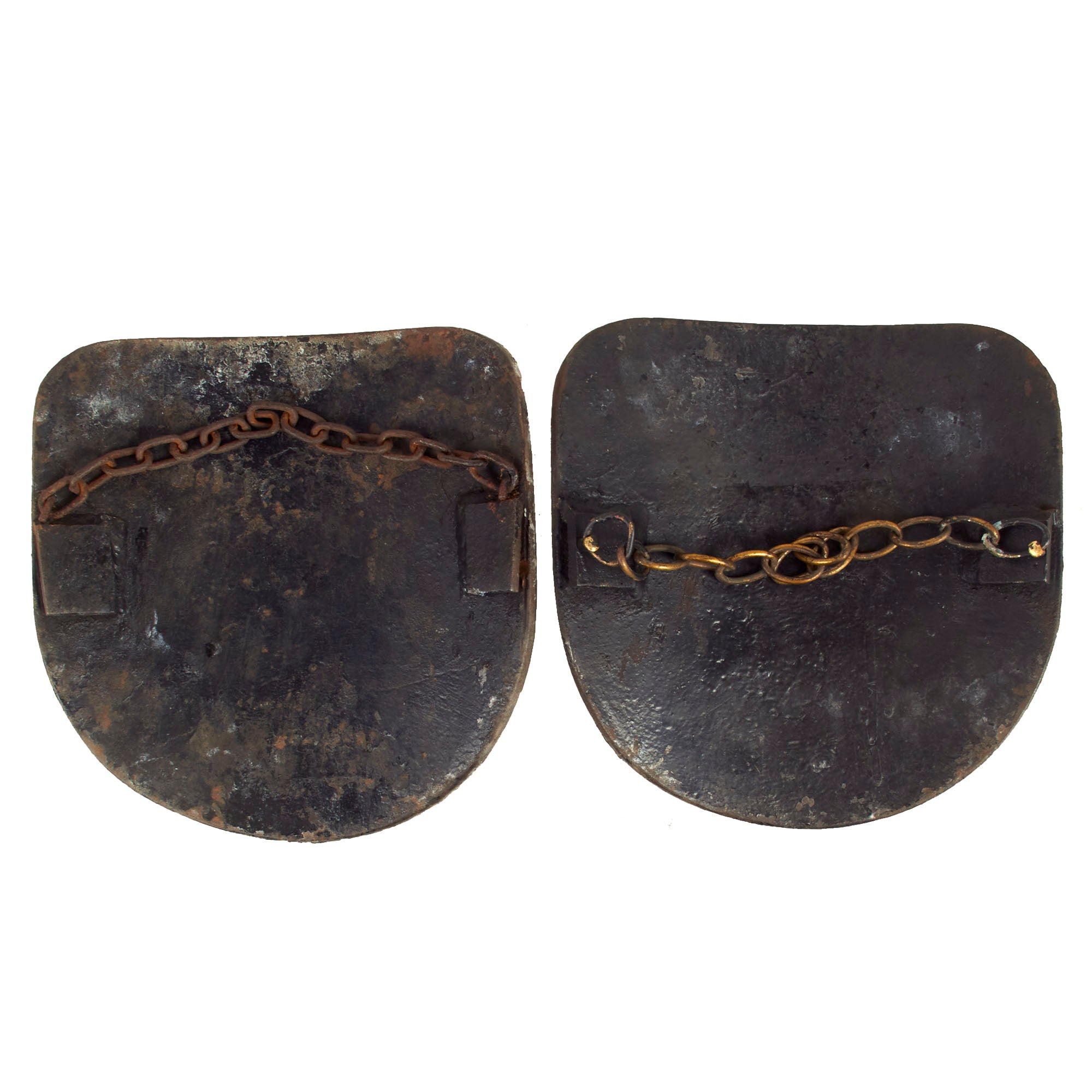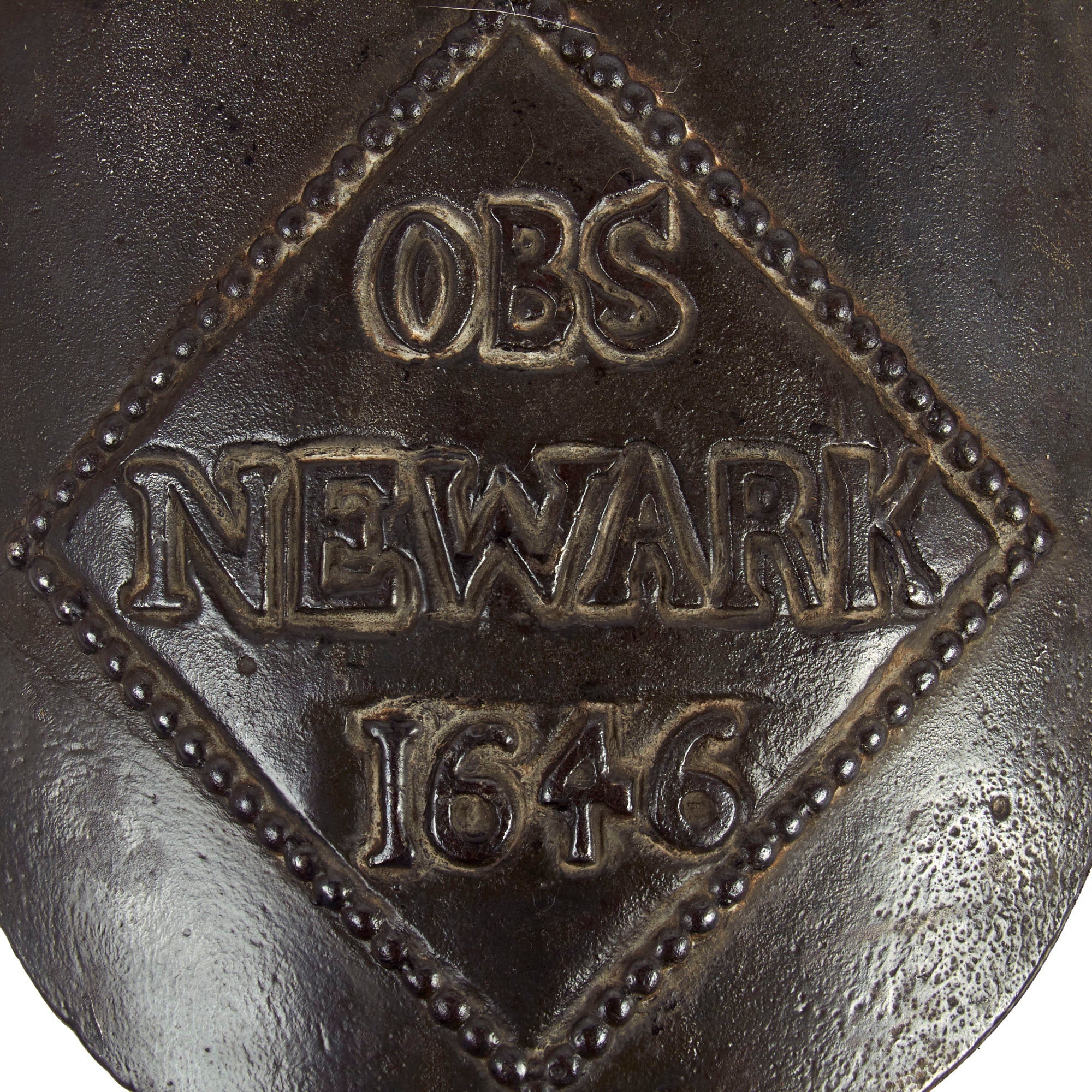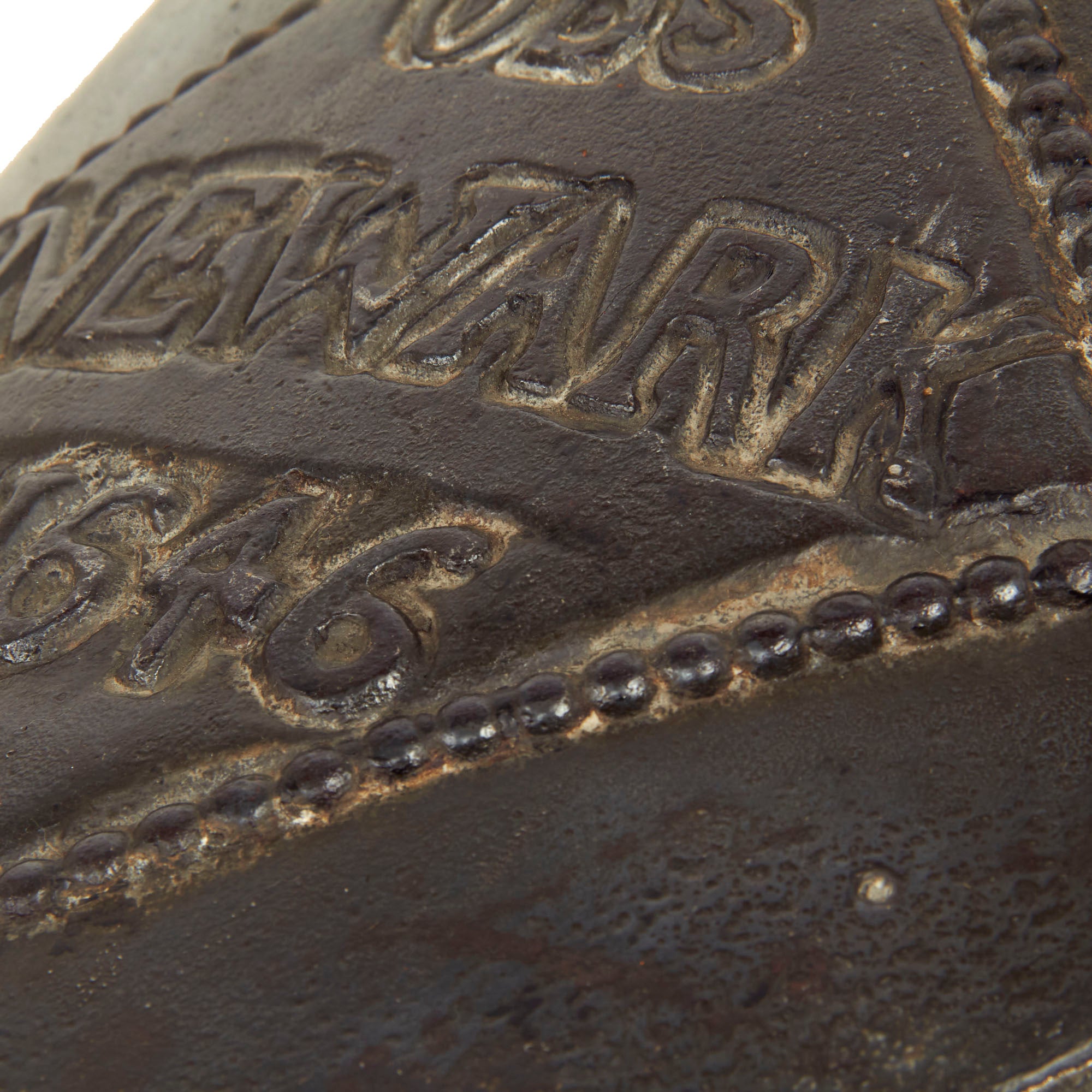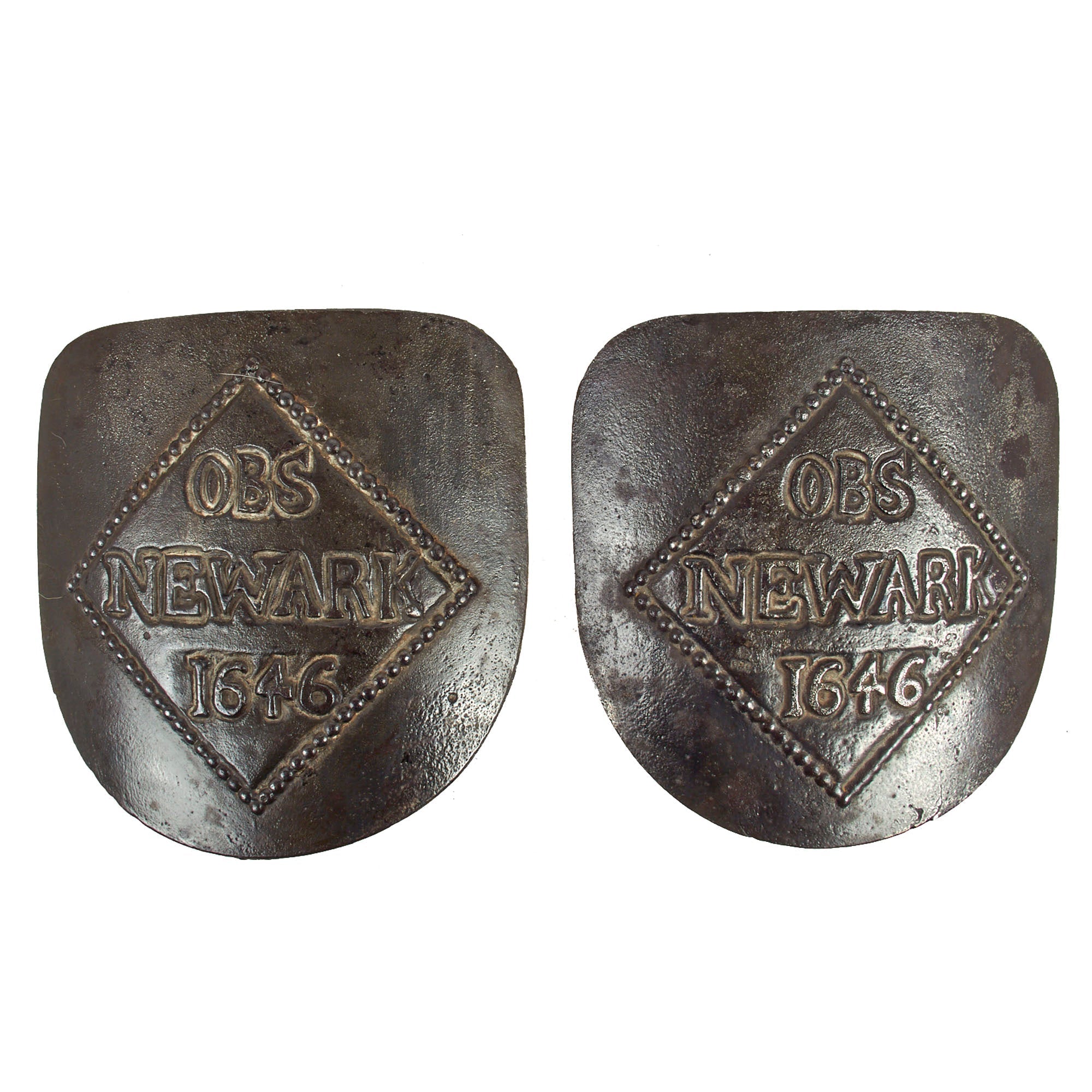 Original Items: One-of-a-kind set. Dating from he late 19th century this is a set of cast iron plaques replicating the Siege coins made in Newark on Trent during the English civil war. OBS an abbreviation of Obsidium which is latin for siege. These plaques were removed from Newark Trent Bridge during renovations around 1970. The bridge was built at the turn of the 20th century so we believe these to be the original plaques dating from that time. Each shield measures 10.75" tall x 11.25" wide x .25" thick and weighs 10 lbs. Two mounting bracket's are welded to the reverse of each and a brass chain was added to hang for display purposes. Each shield reads:
